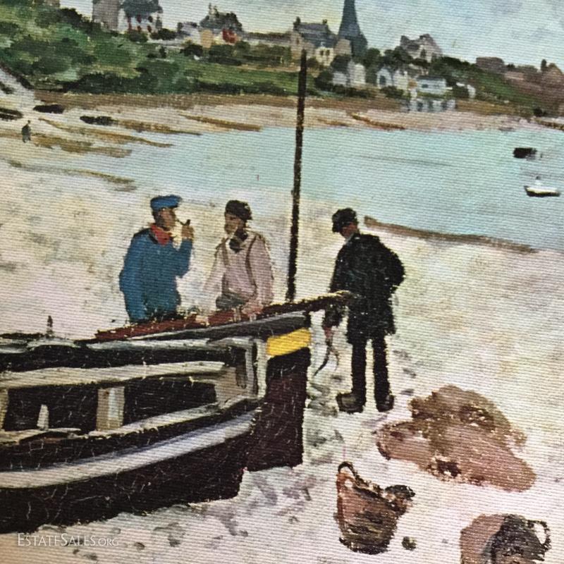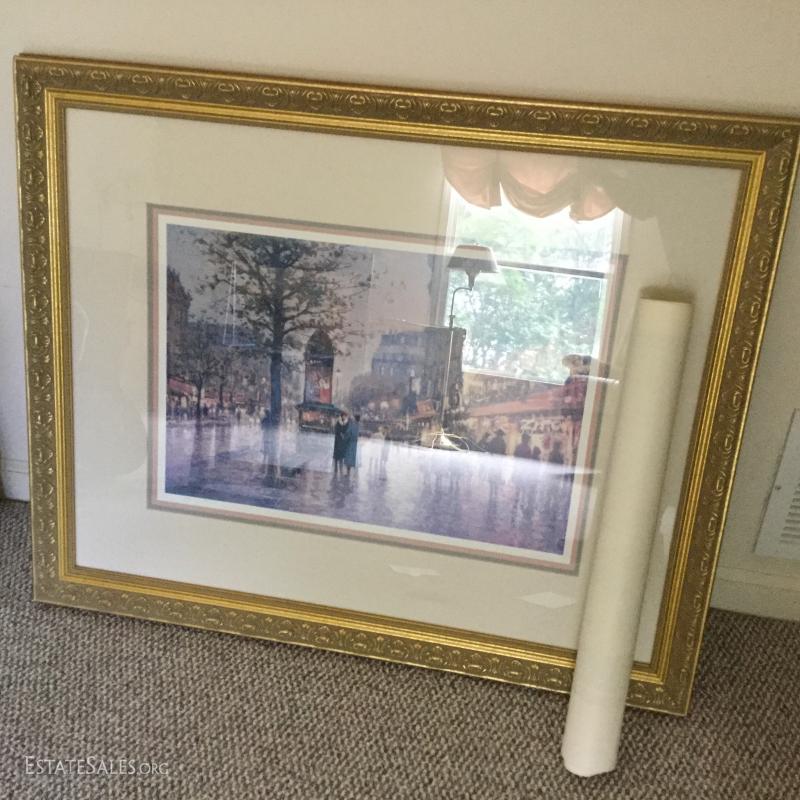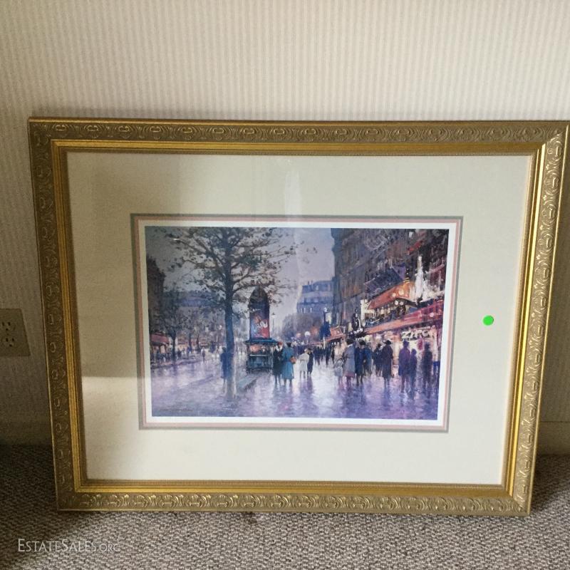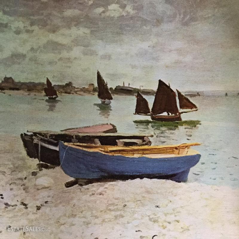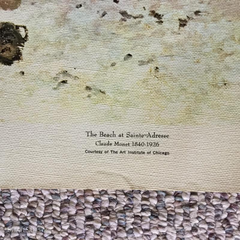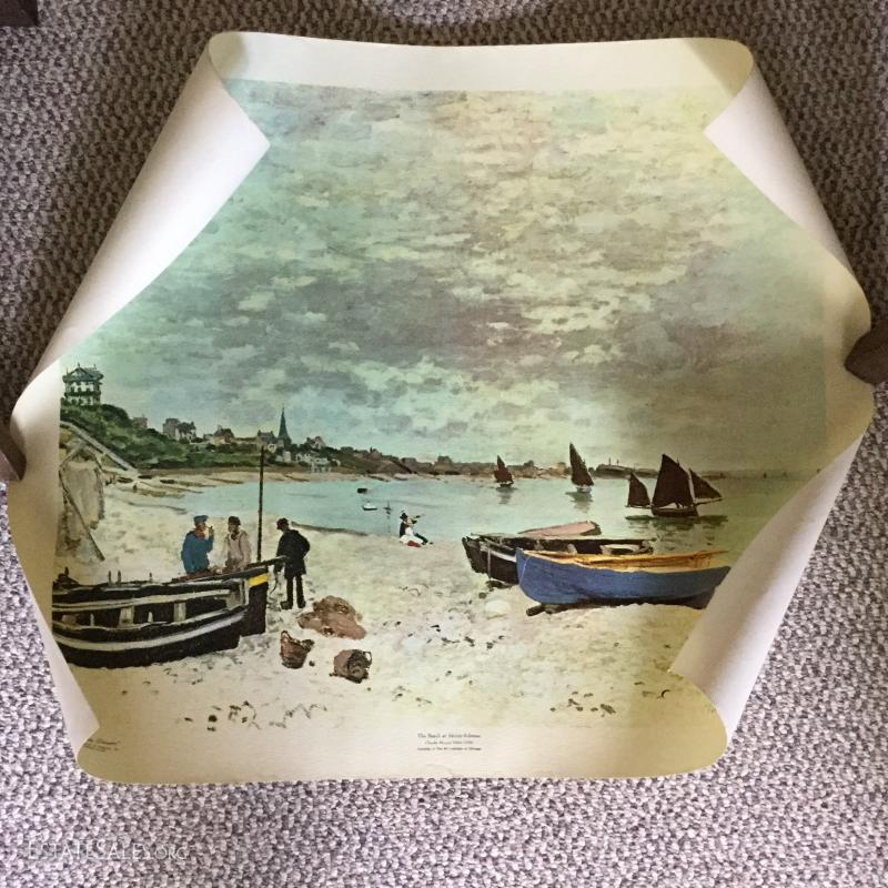 Large matted and framed art number 138 of 1950 of city street. Gold frame, 37"l x 30"w. Unframed Claude Monet print, "The Beach at Saints-Adresse," 27"l x 23"w.