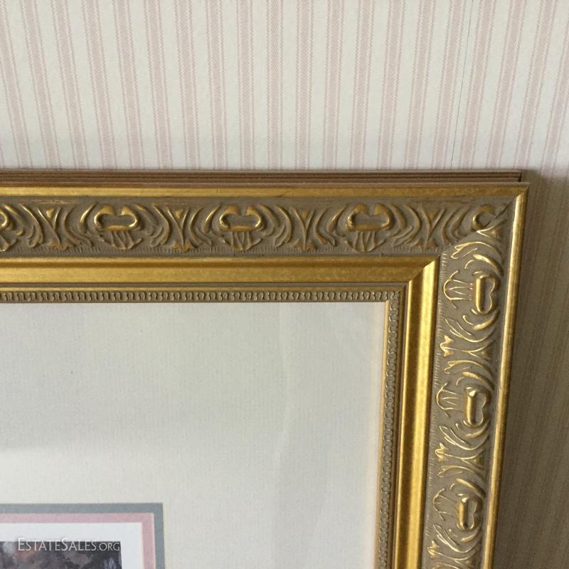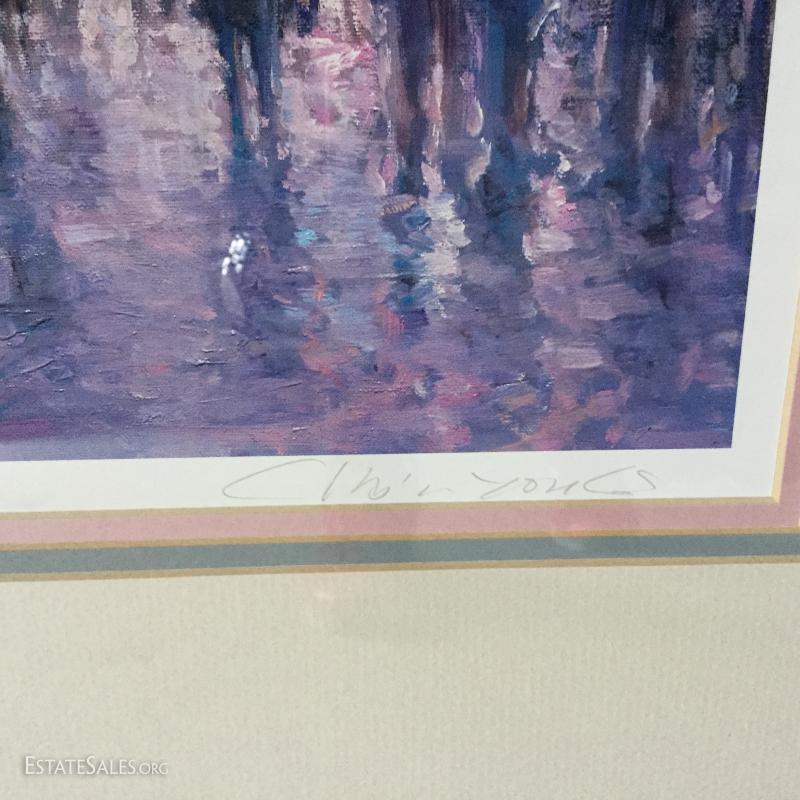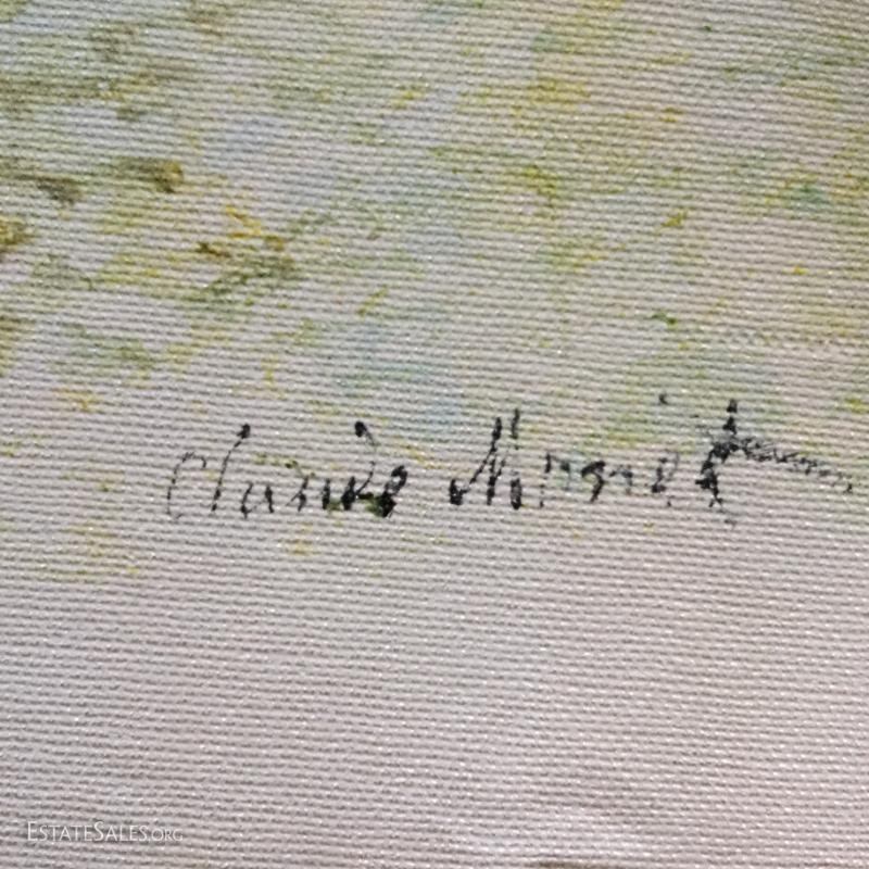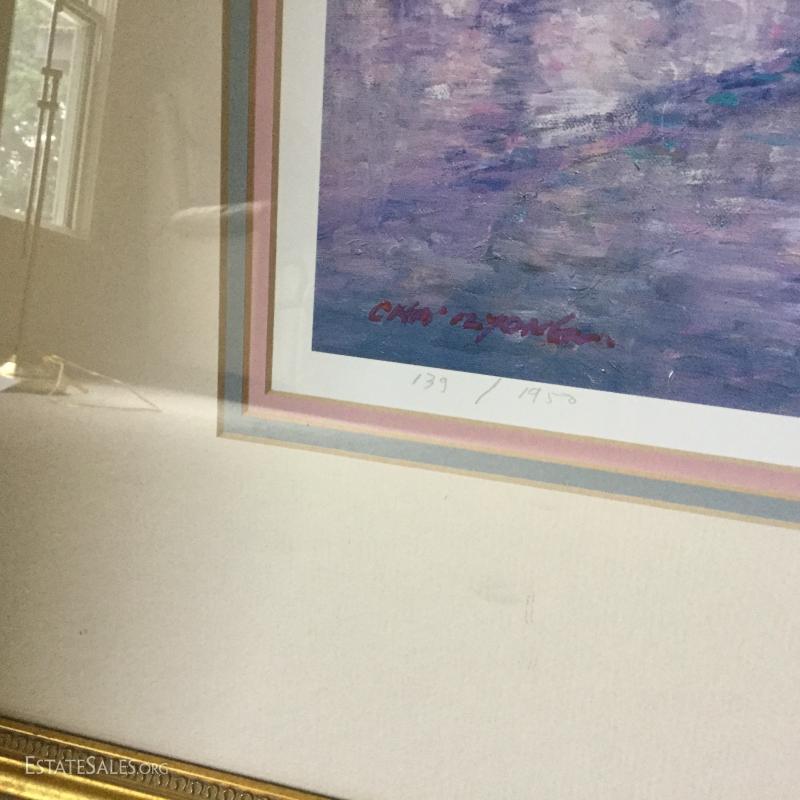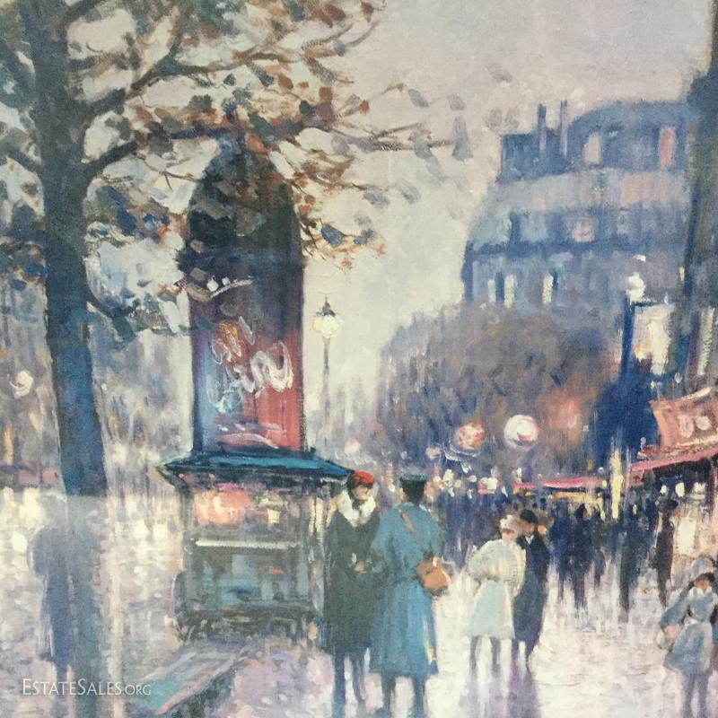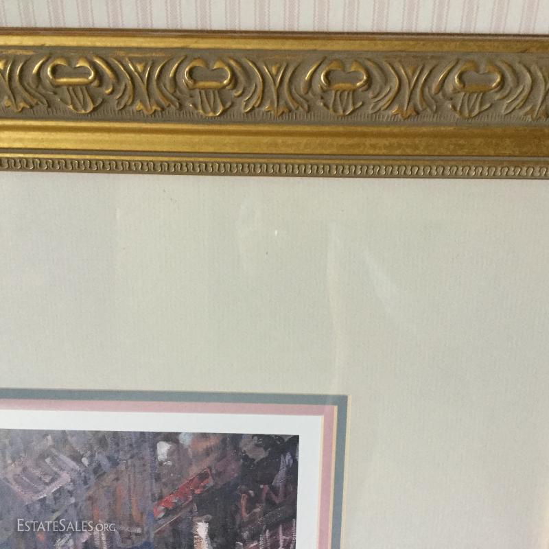 Large matted and framed art number 138 of 1950 of city street. Gold frame, 37"l x 30"w. Unframed Claude Monet print, "The Beach at Saints-Adresse," 27"l x 23"w.