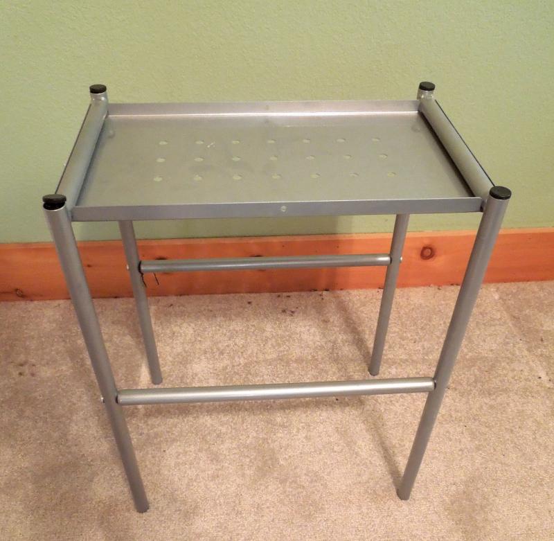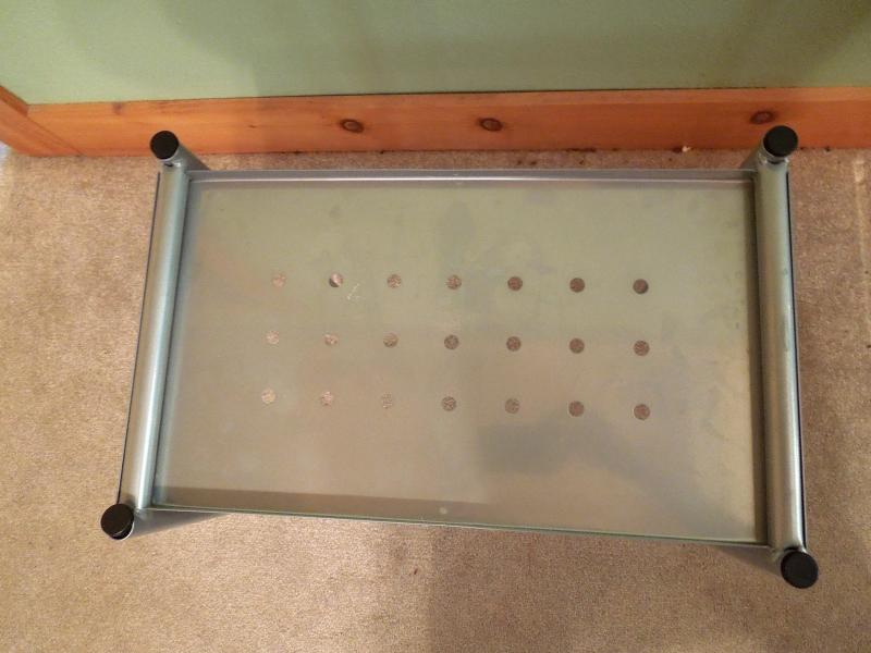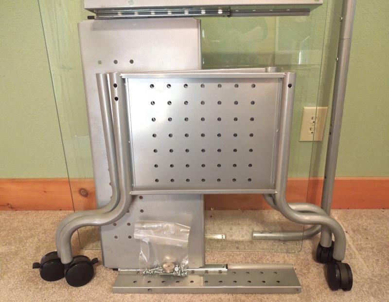 54" x 28" desk surface on glass. Has a separate small table for printer. On plastic rolling wheels. Hardware included. Lead-free, silver-colored, powder-coated finish that prevents scratches. No scratches or dents.