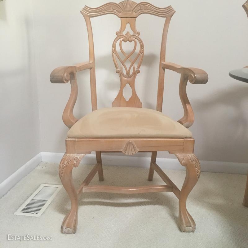 Set of 6, white pine chairs all have arms and are covered in a ultra swede fabric: