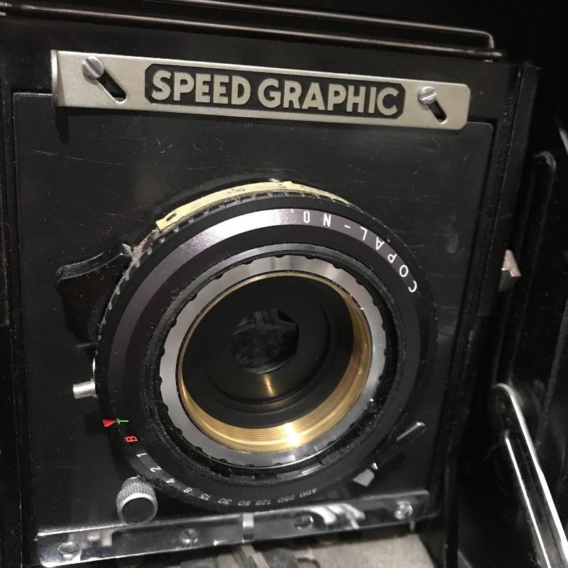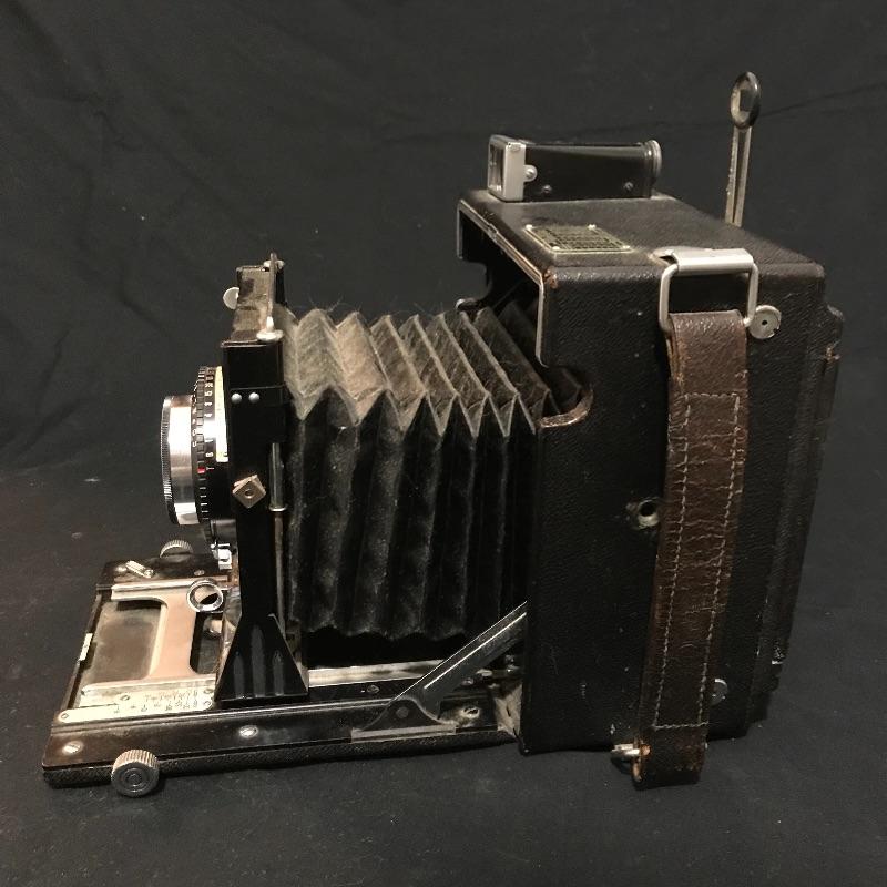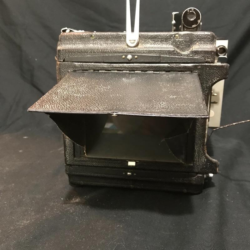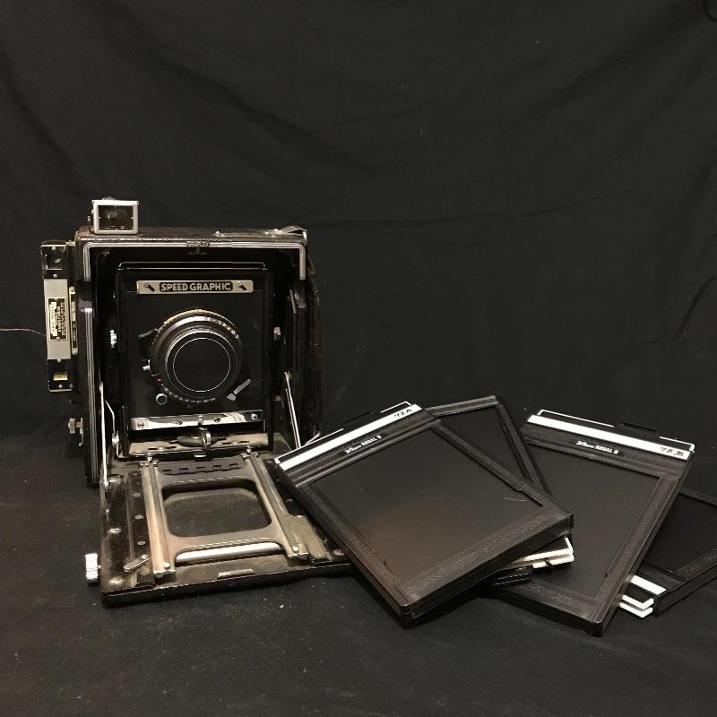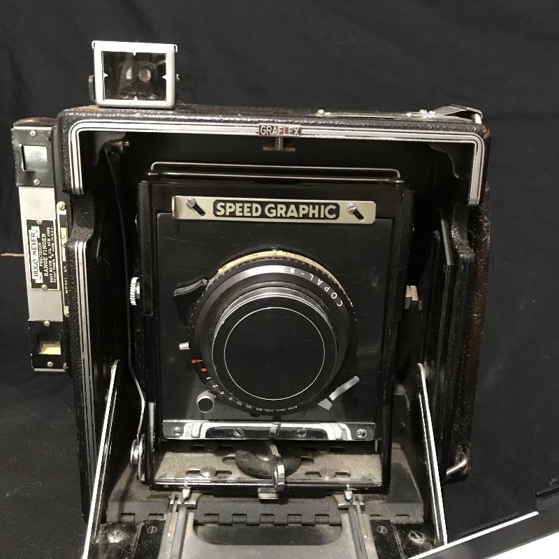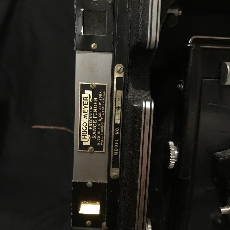 Graflex Speed Graphic Camera by The Folmer Graflex Corporation with Hugo Meyer Precision Range Finder Model 4C. Piece appears in mostly good condition, but the bellow seems a little fragile. Four Lisco Regal II double film holders for two sheets of 4 x 5 format film. Shipping available.