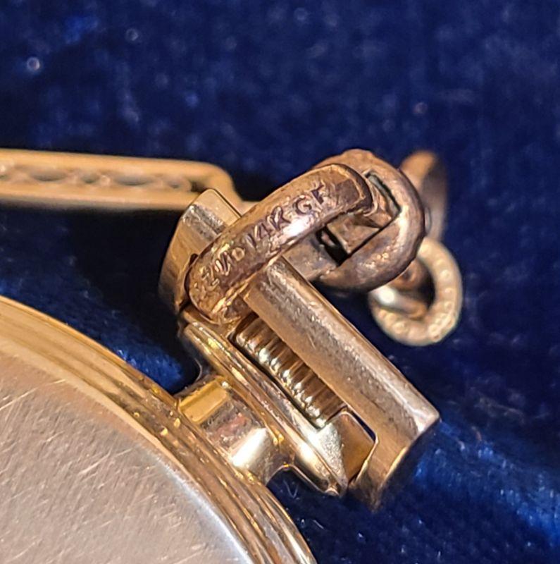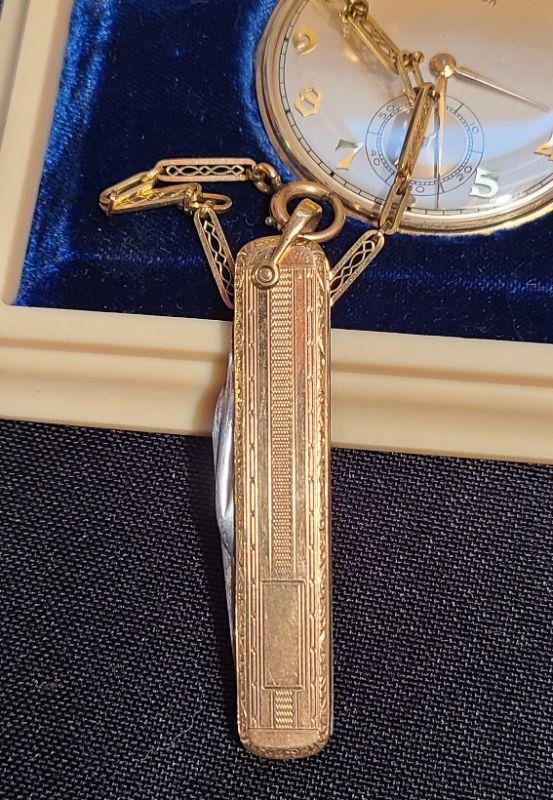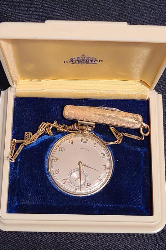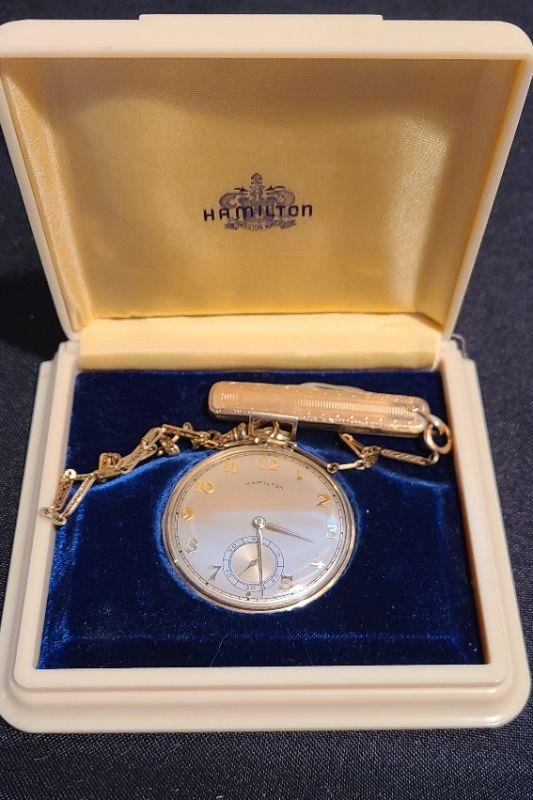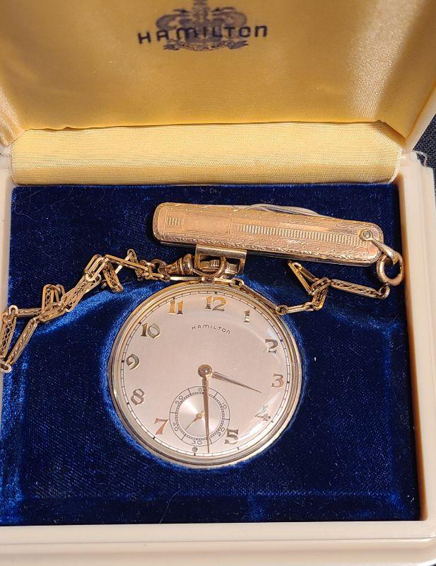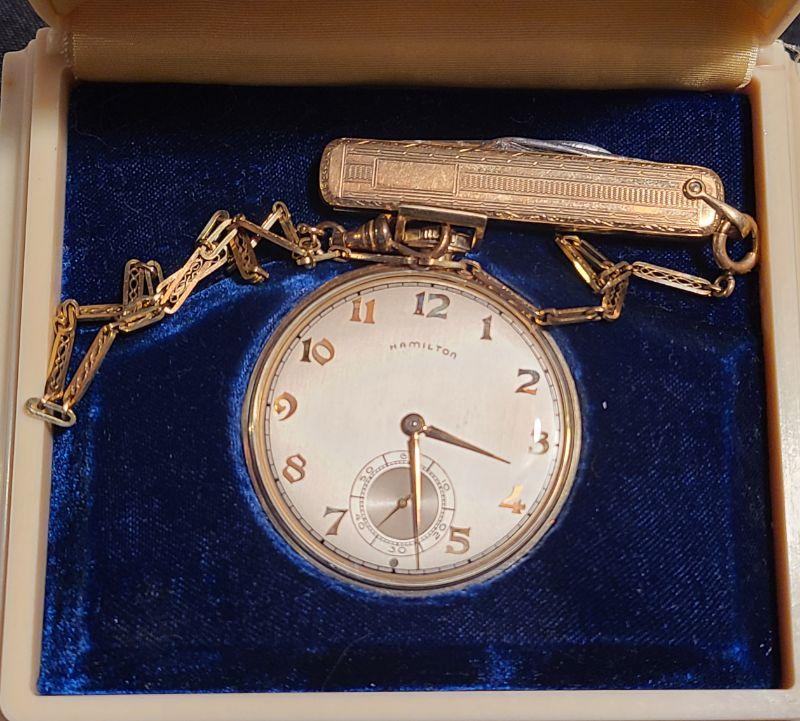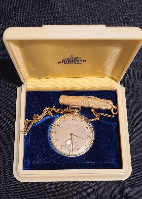 Hamilton pocket watch marked 14K Gold Filled. Watch chain marked 14k gold filled, watch chain clasp marked 14K gold filled. Hayward pocket knife. Watch is running but hasn't been tested for accuracy. Please see all pics for condition. CLS