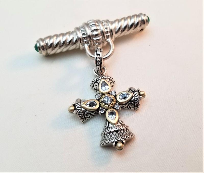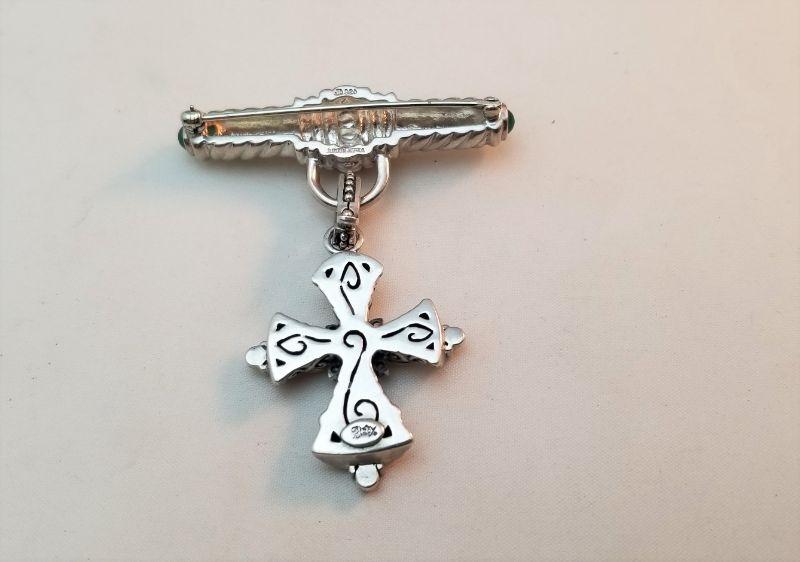 Judith Ripka Charm holder/brooch - sterling silver with green cabochons at the ends - attached is a Barbara Bixby Cross enhancer - sterling silver with 18kt gold accent (marked). Heavy and Oh....so pretty. Enhancer can be easily removed and worn on something else. Bar pin is 1.75" long, enhancer is 1.5" long. Nice condition. No box.