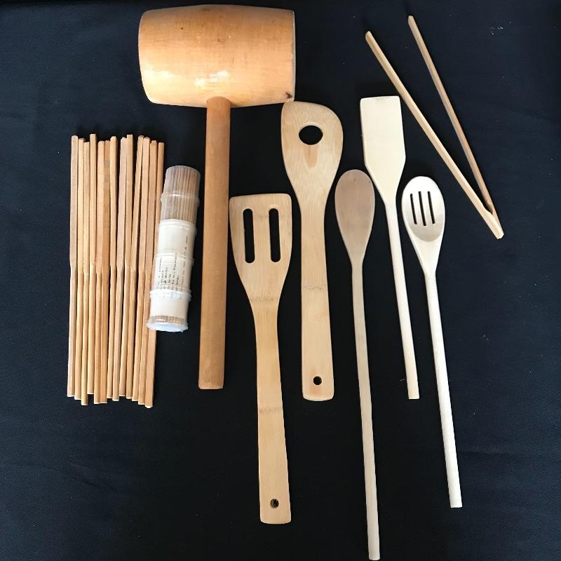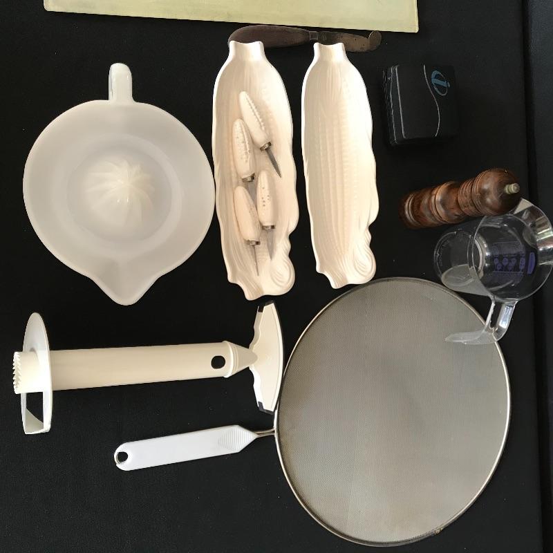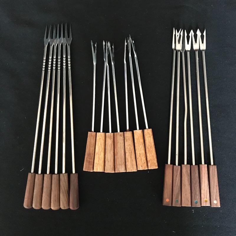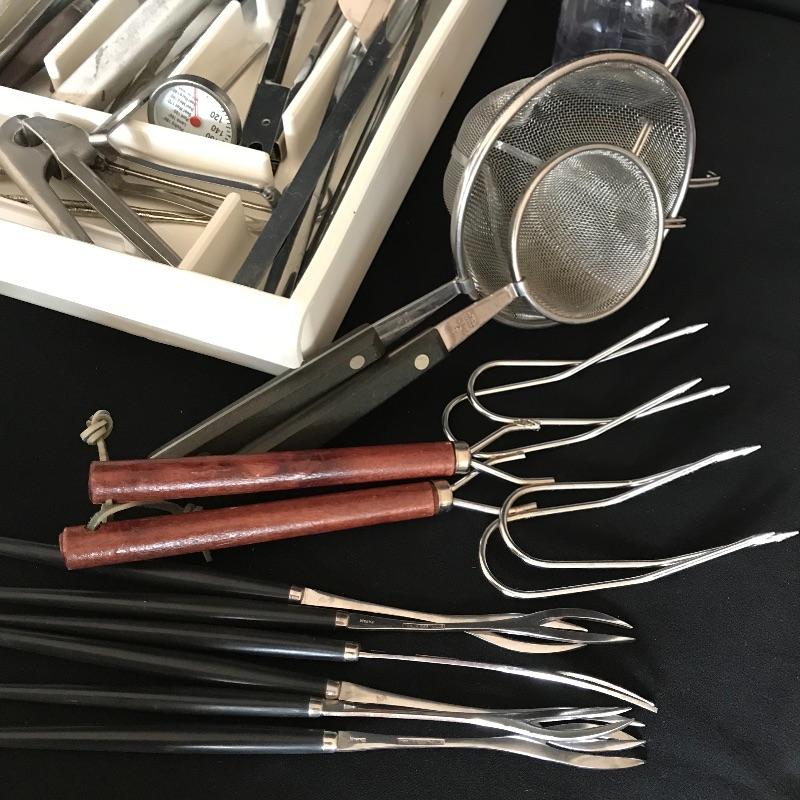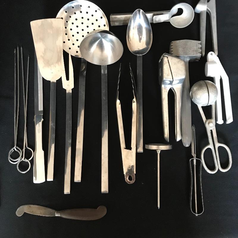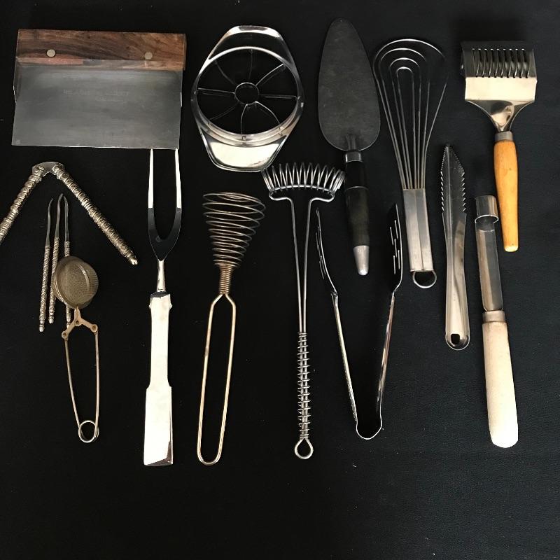 Begin or upgrade your kitchen utensils. This lot is full of vintage and newer usefulness! From a wooden spoon collection to a pineapple corer, it has it all! Fondue fork sets, heavy wooden mallet, serving forks, a knife sharpener and more! See photos for entire lot inventory. The glass counter cutting board has a lovely green hue and measures approximately 15” x 12”. No shipping.