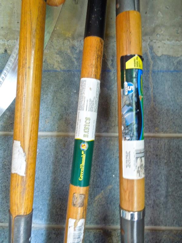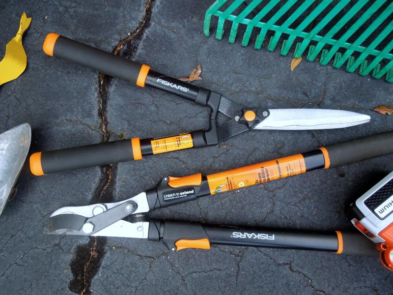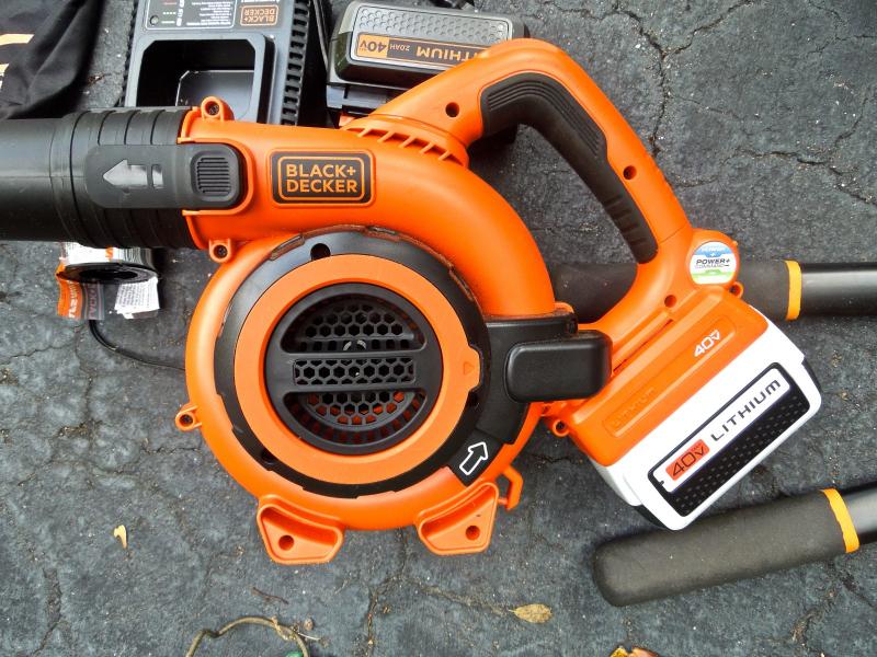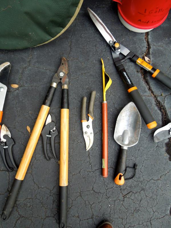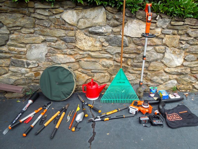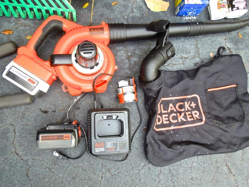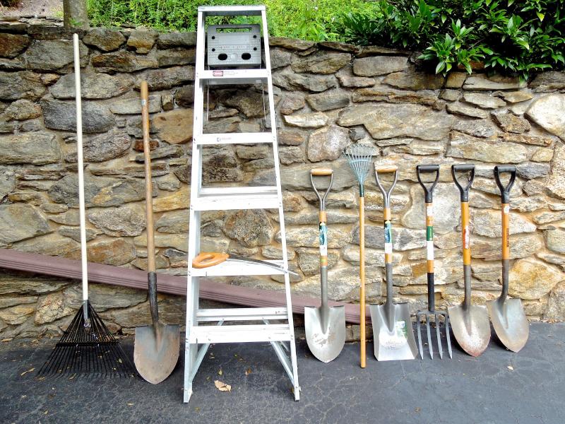 B&D lithium rechargable leaf vac/blower with charger and bagger; B&D 13" weed eater with two full rolls of line; Keller aluminum 6 ft folding ladder; Collapsible canvas leaf bag; red plastic watering can (missing spray cap); plastic tine leaf rake; wood handle curved limb handsaw; square shovel; four spade shovels; pitch fork; metal rake; 3 long-handled pruners; 3 pruning sheers; Bug Zooka, hand trowel; four types of plant food.
