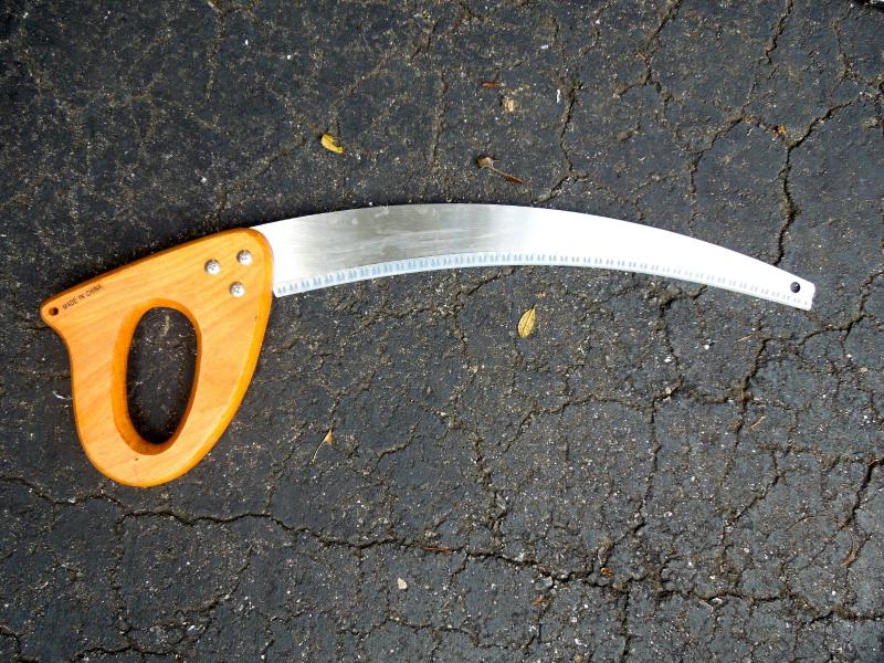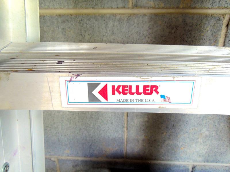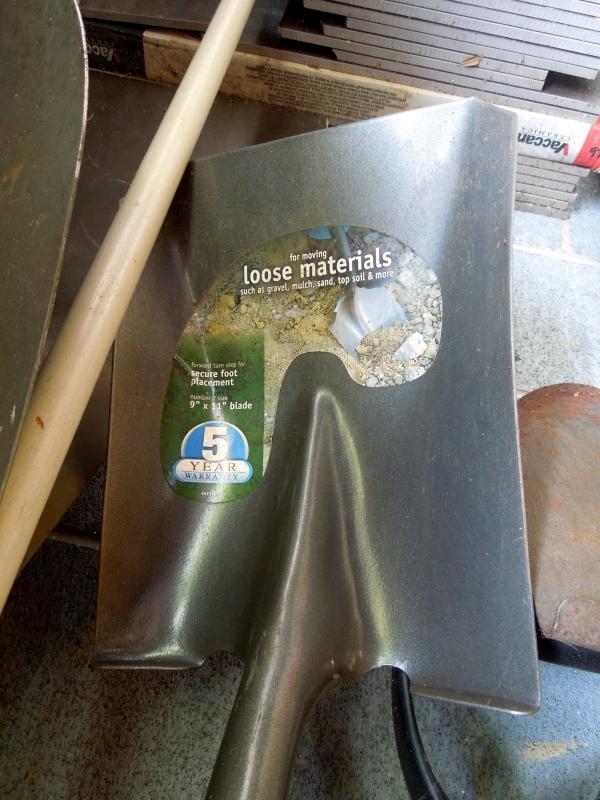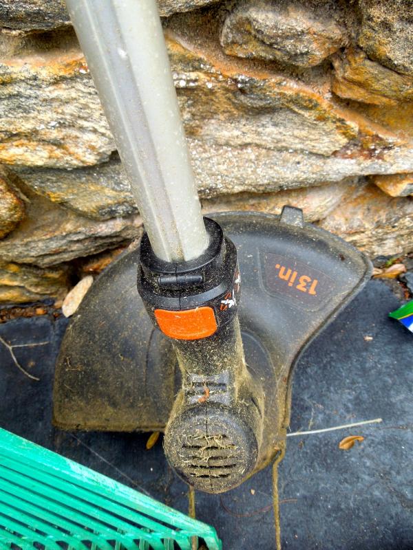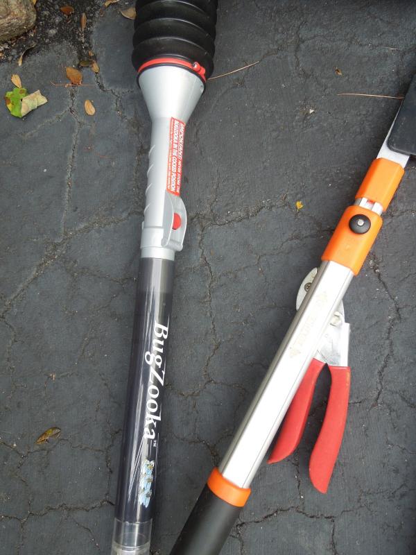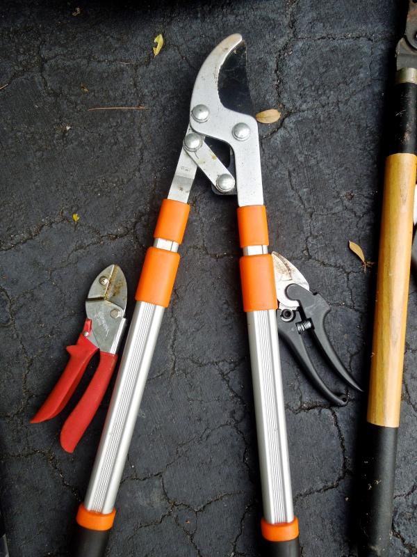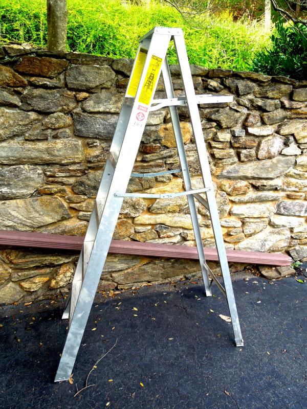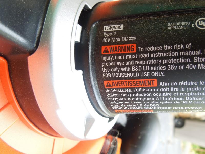 B&D lithium rechargable leaf vac/blower with charger and bagger; B&D 13" weed eater with two full rolls of line; Keller aluminum 6 ft folding ladder; Collapsible canvas leaf bag; red plastic watering can (missing spray cap); plastic tine leaf rake; wood handle curved limb handsaw; square shovel; four spade shovels; pitch fork; metal rake; 3 long-handled pruners; 3 pruning sheers; Bug Zooka, hand trowel; four types of plant food.