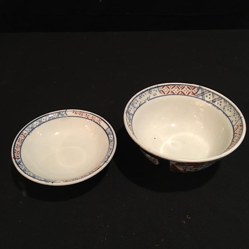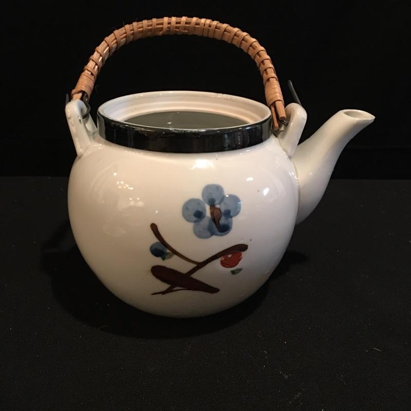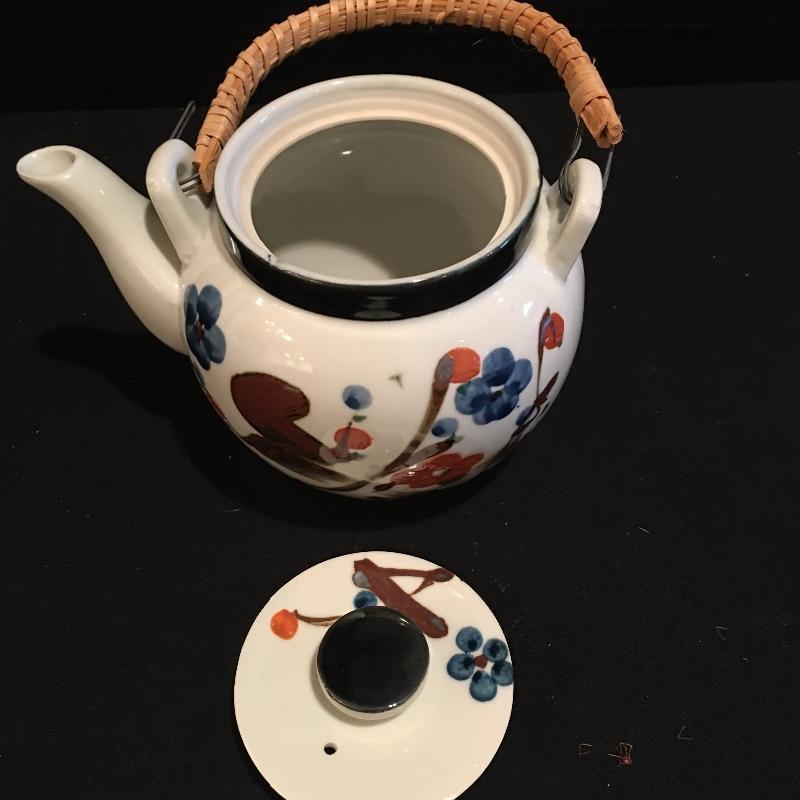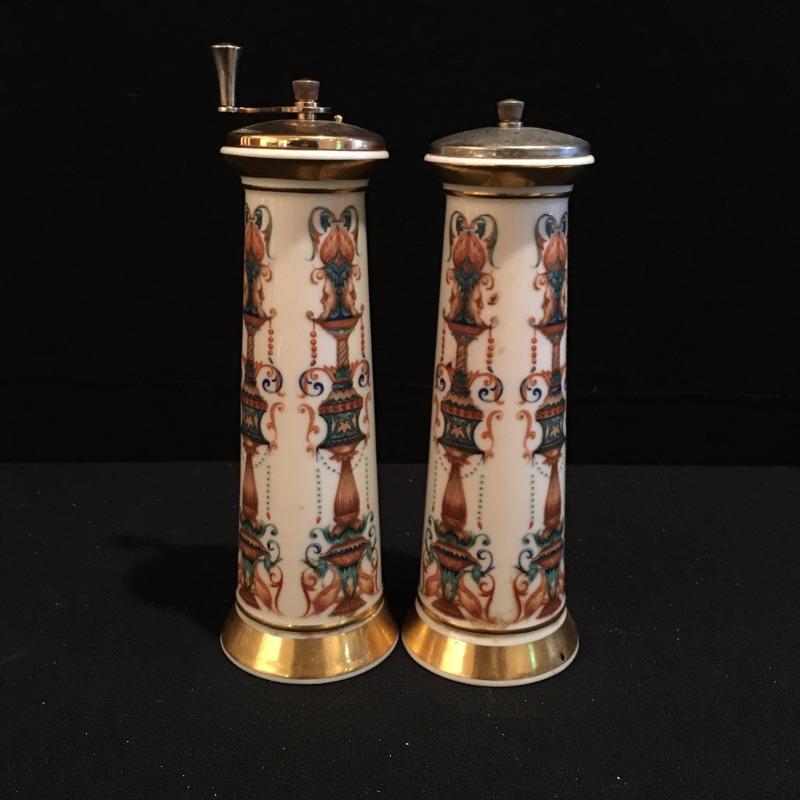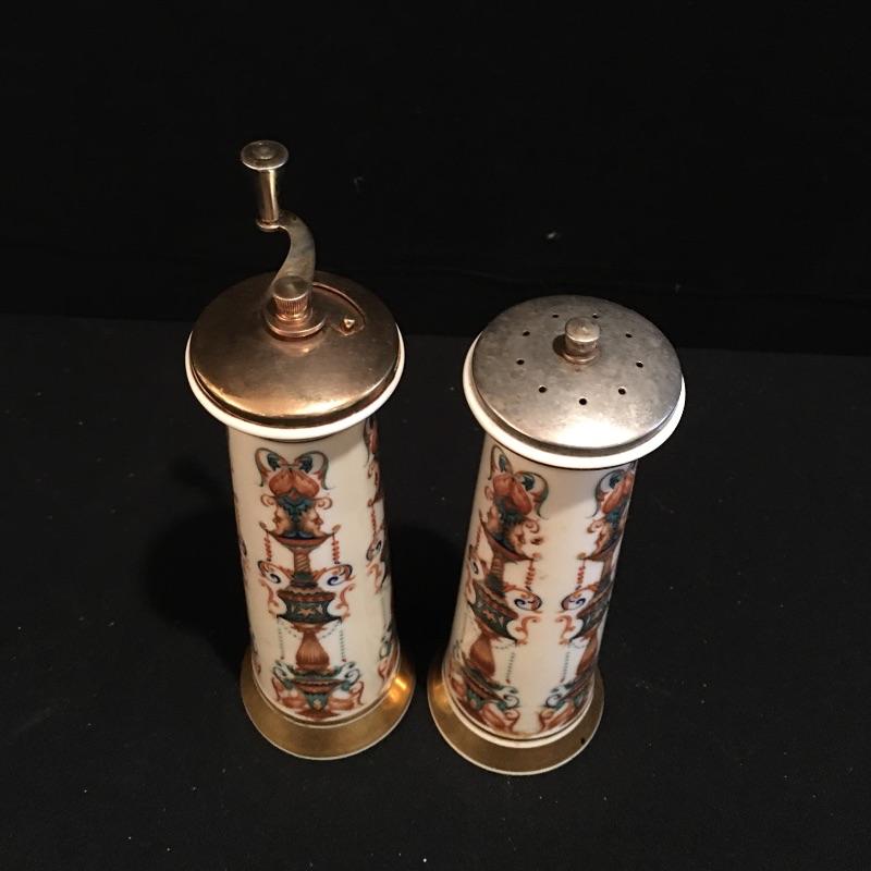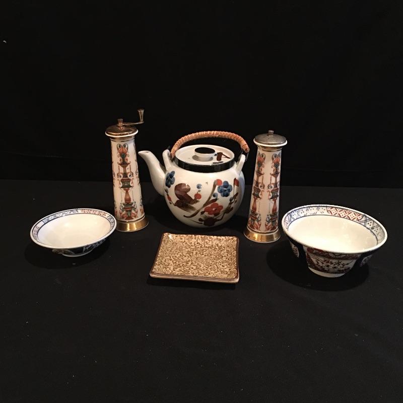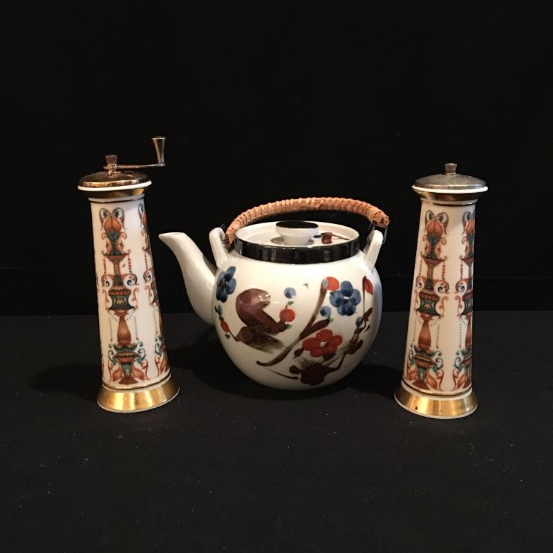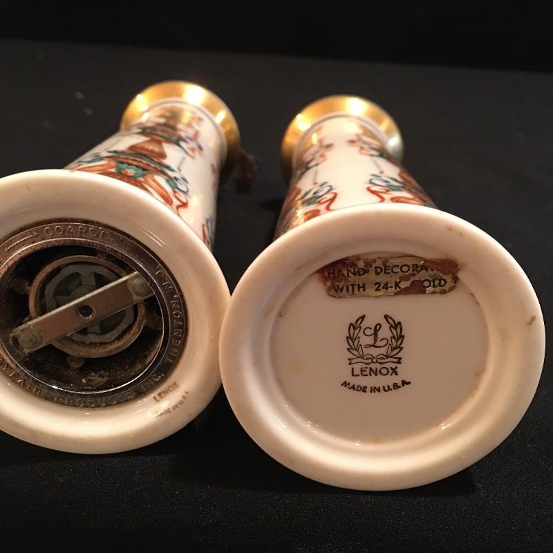 This set of Lenox salt shaker and pepper mill in the Lido design have been hand decorated with 24k gold. Also included is Kwangsi Ware teapot, two Asian inspired bowls and a small square plate. Salt and pepper shakers measure 2.5”D x 7” tall.
