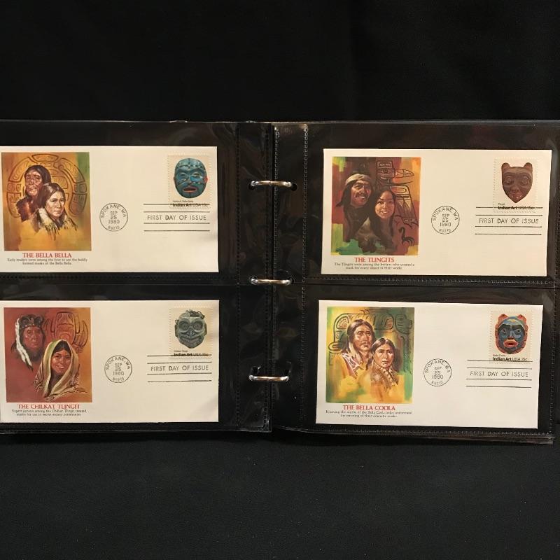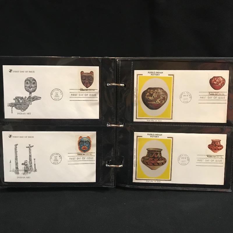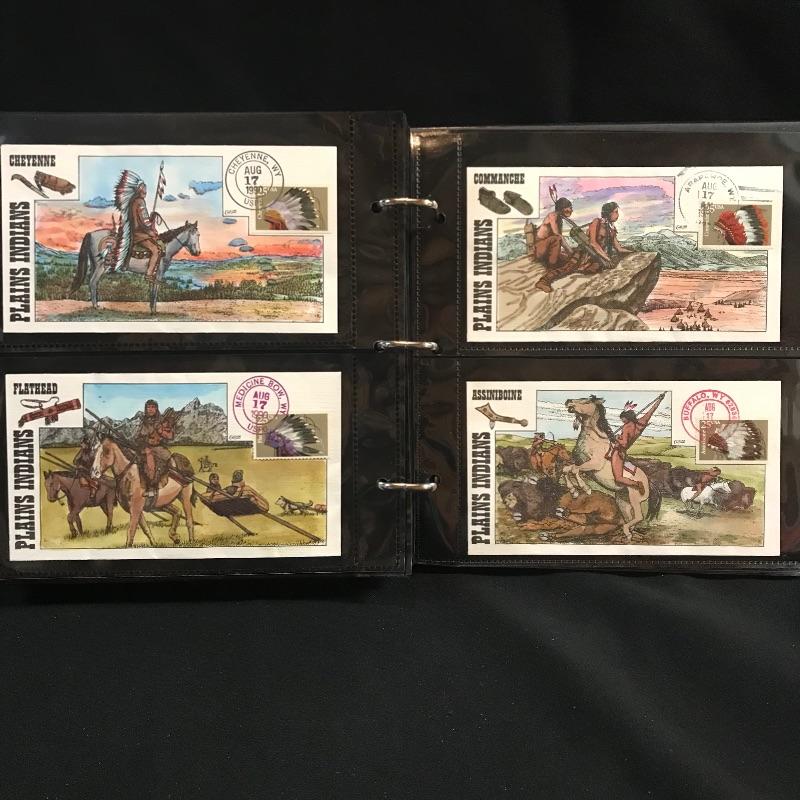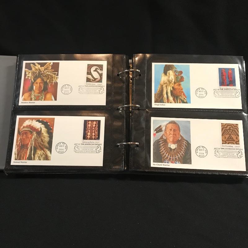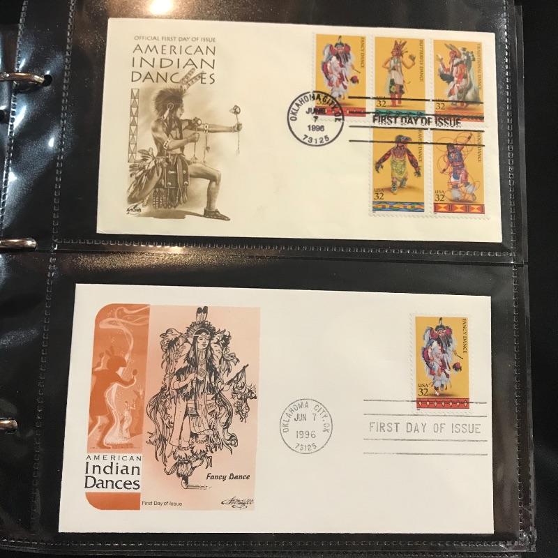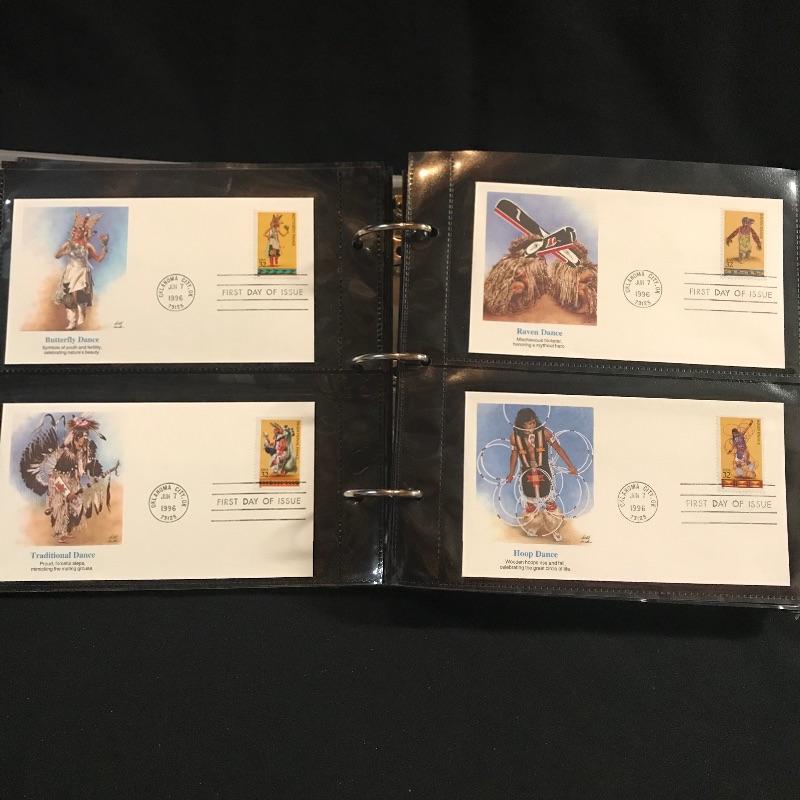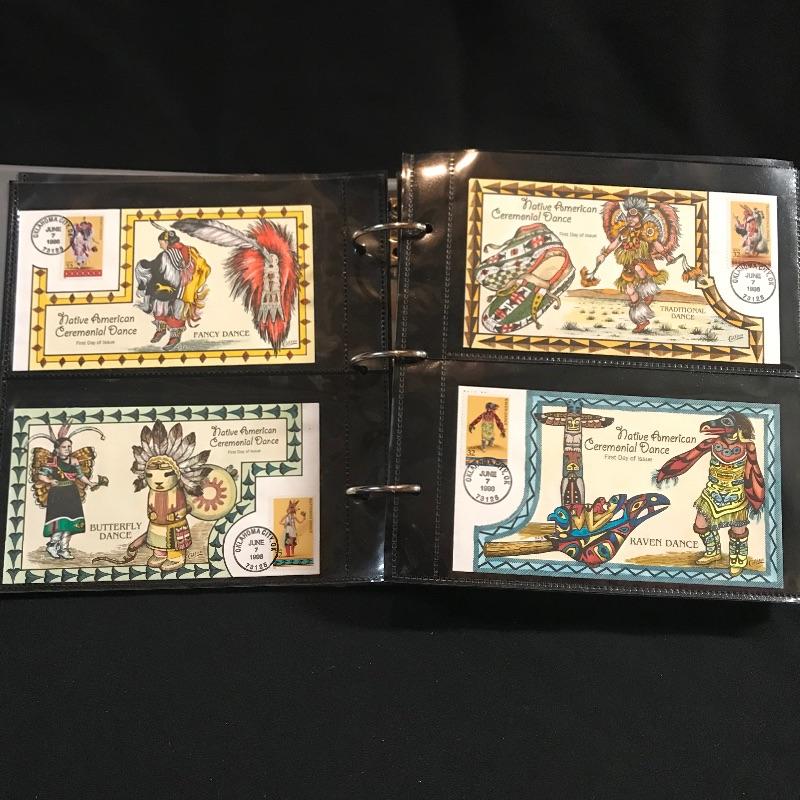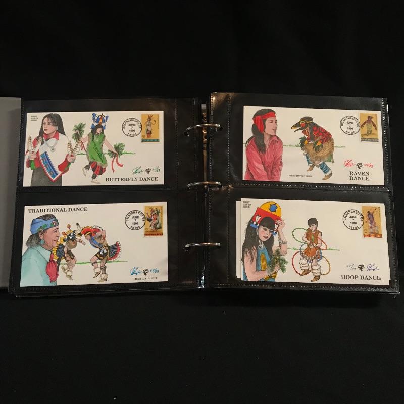 Two binders full of commemorative 1st day covers about Native Americans. Pages covering arts, dances, people, tribes and more. Many stamps are duplicated on a variety of cachet’s. Most stamps are dated in the 1980-1990s, but one can be found as early as 1948. At least five were found numbered and signed. The gray binder has about 1/3 empty sheets for you to add your own collection.