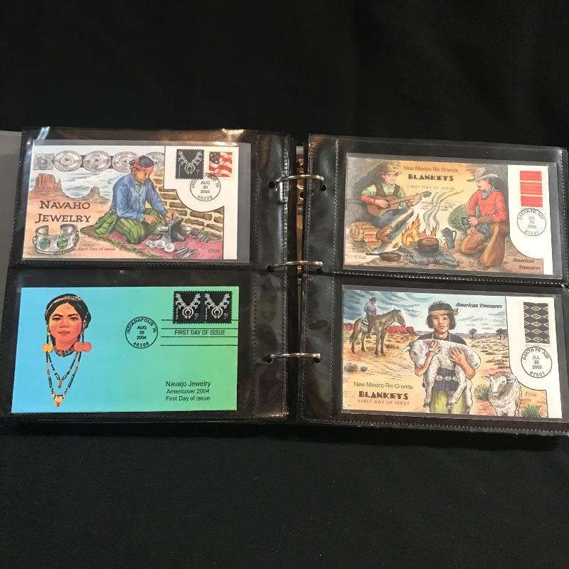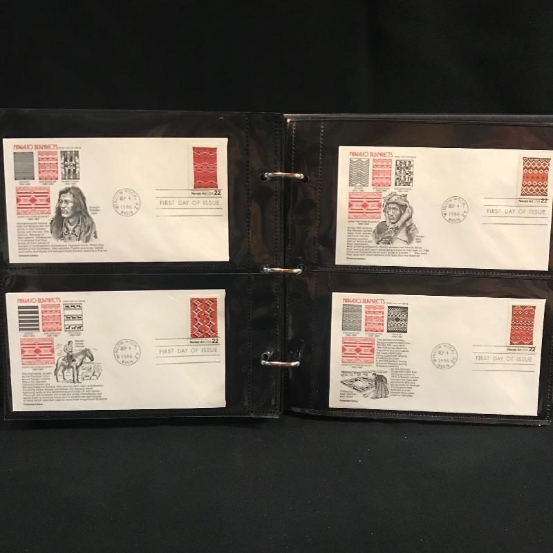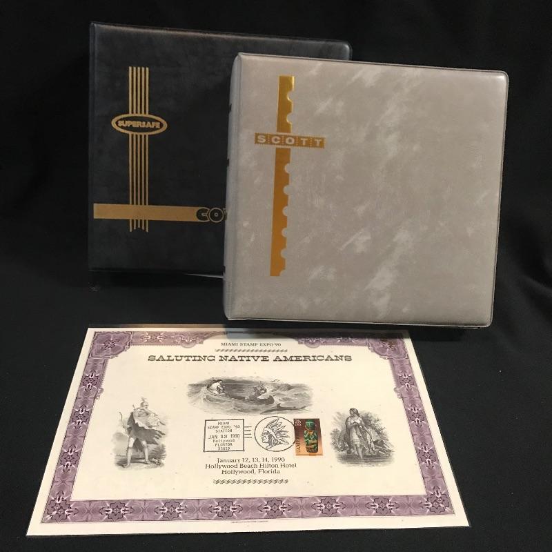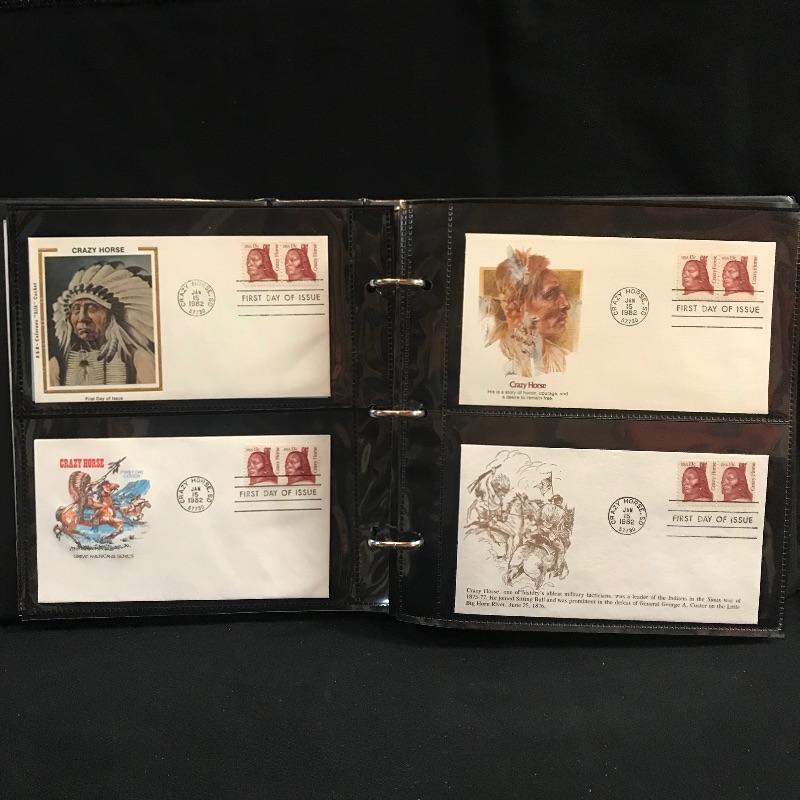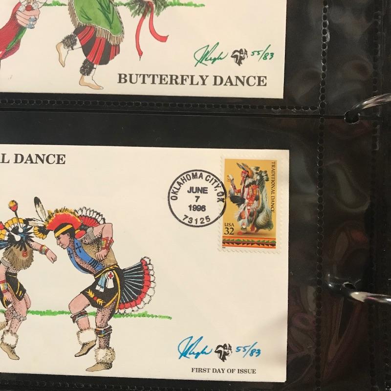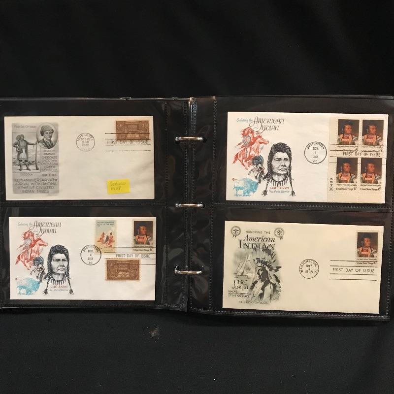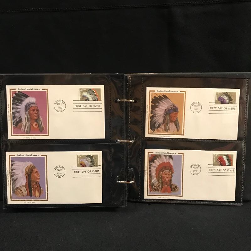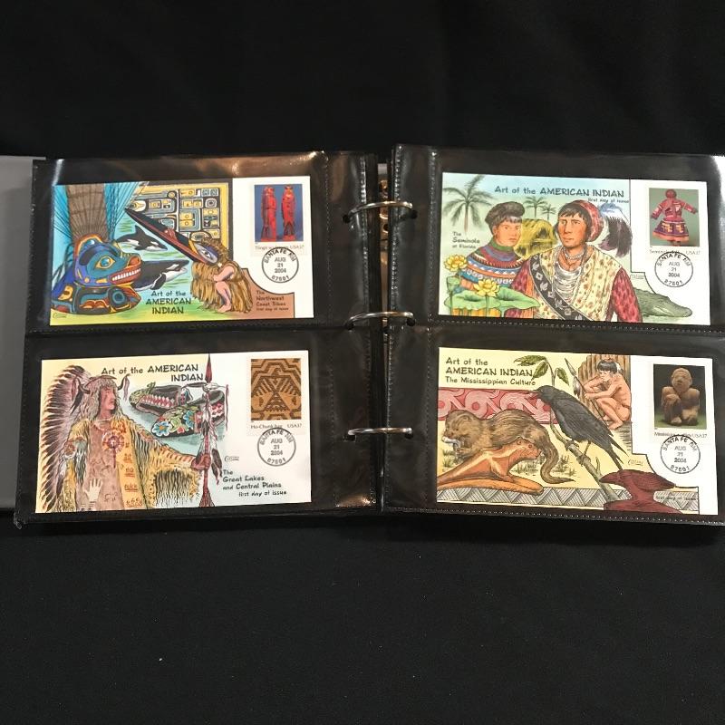 Two binders full of commemorative 1st day covers about Native Americans. Pages covering arts, dances, people, tribes and more. Many stamps are duplicated on a variety of cachet’s. Most stamps are dated in the 1980-1990s, but one can be found as early as 1948. At least five were found numbered and signed. The gray binder has about 1/3 empty sheets for you to add your own collection.