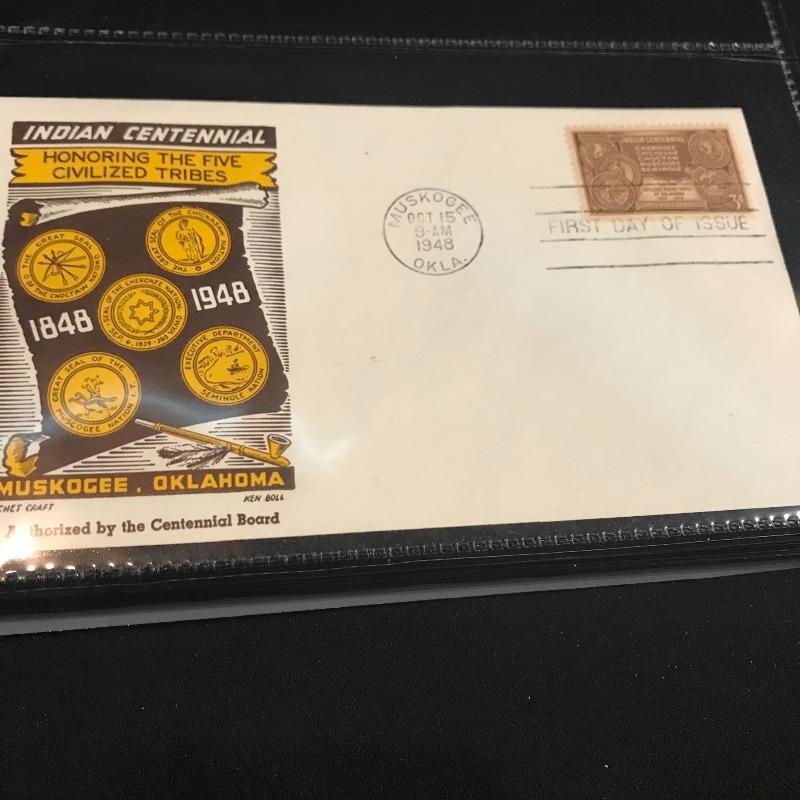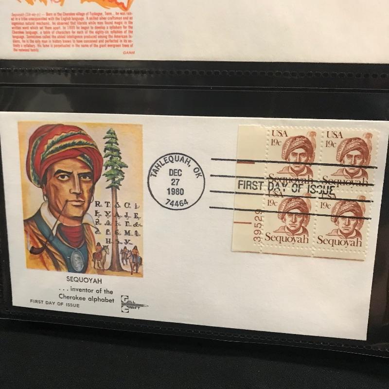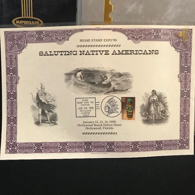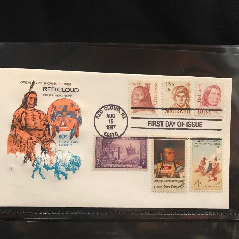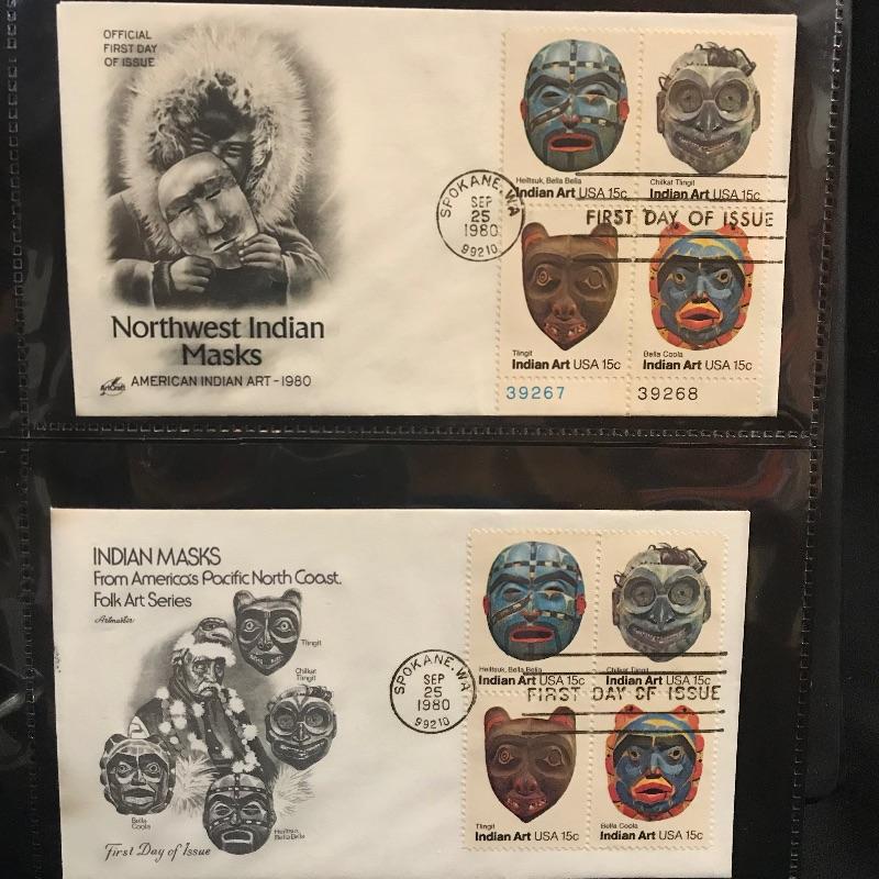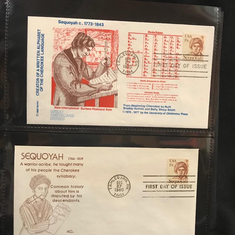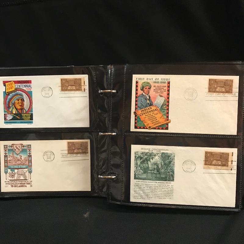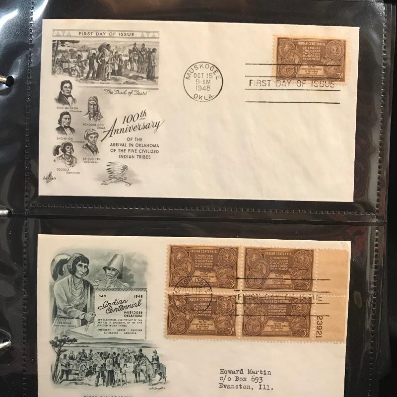 Two binders full of commemorative 1st day covers about Native Americans. Pages covering arts, dances, people, tribes and more. Many stamps are duplicated on a variety of cachet’s. Most stamps are dated in the 1980-1990s, but one can be found as early as 1948. At least five were found numbered and signed. The gray binder has about 1/3 empty sheets for you to add your own collection.