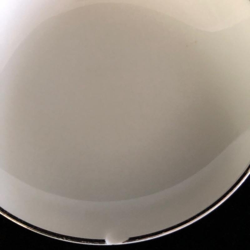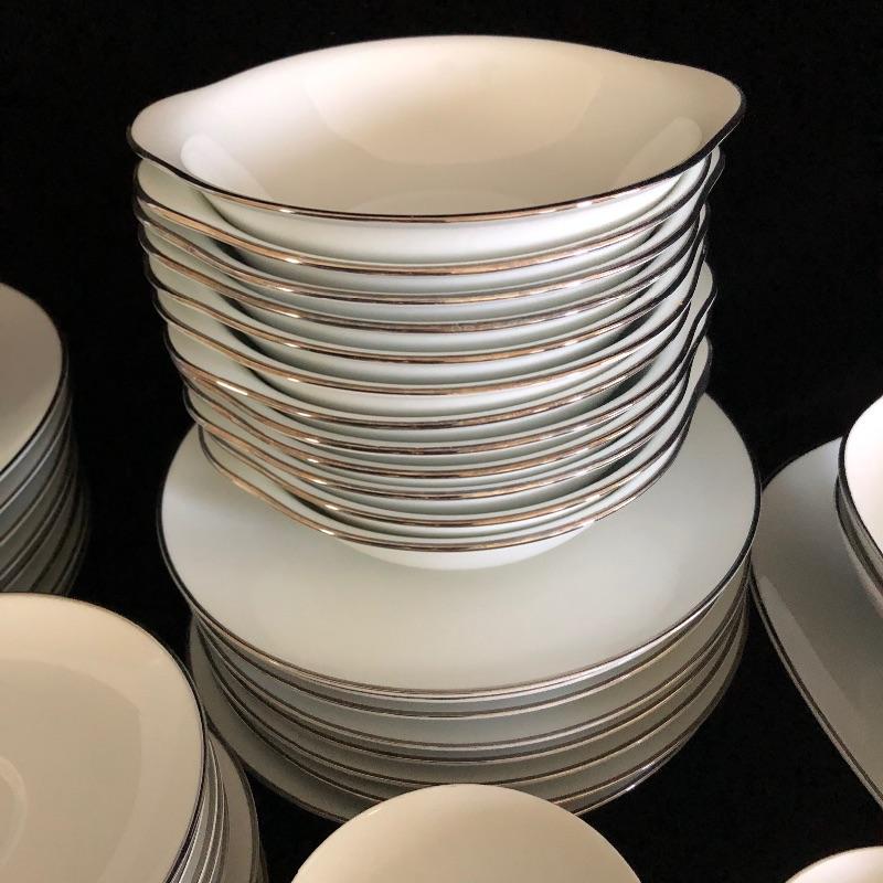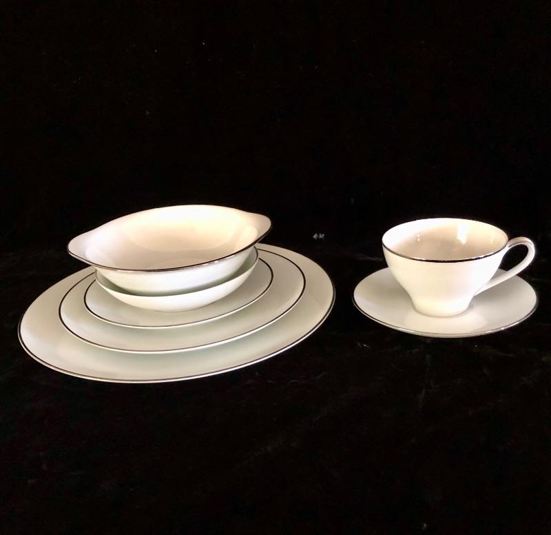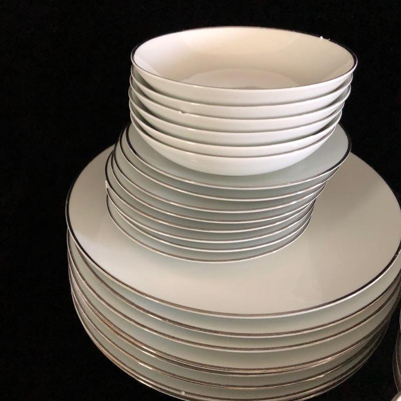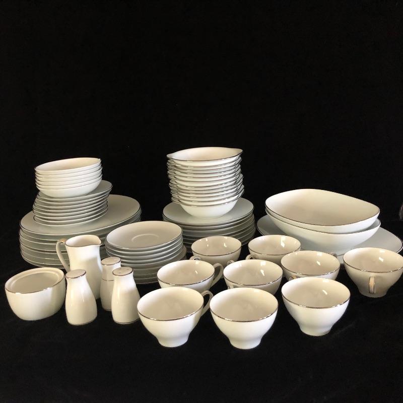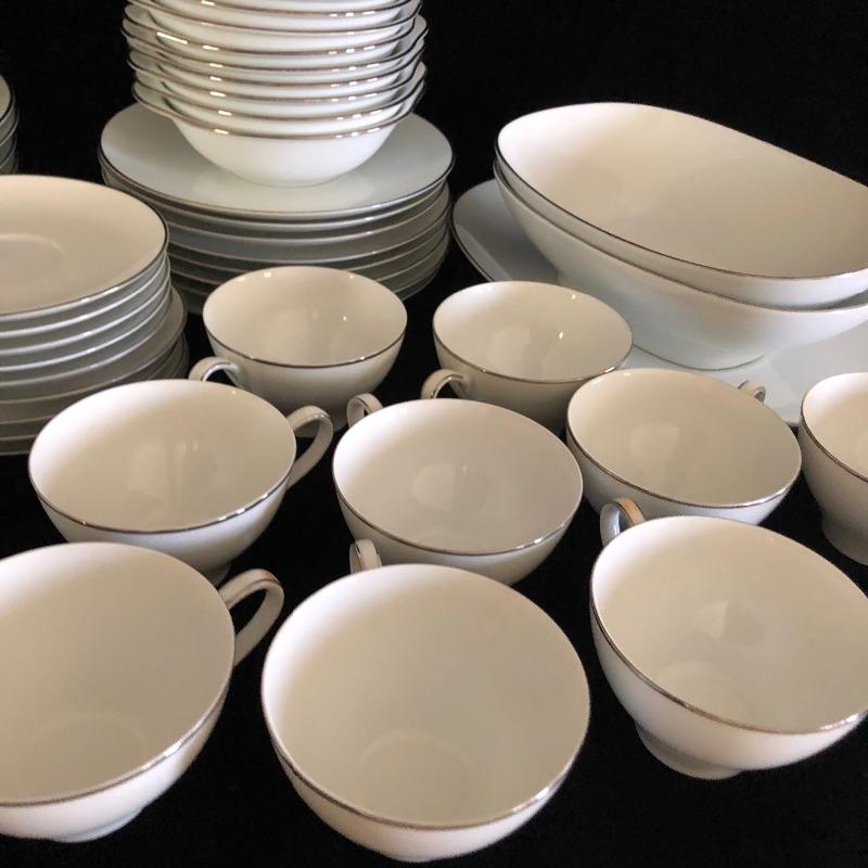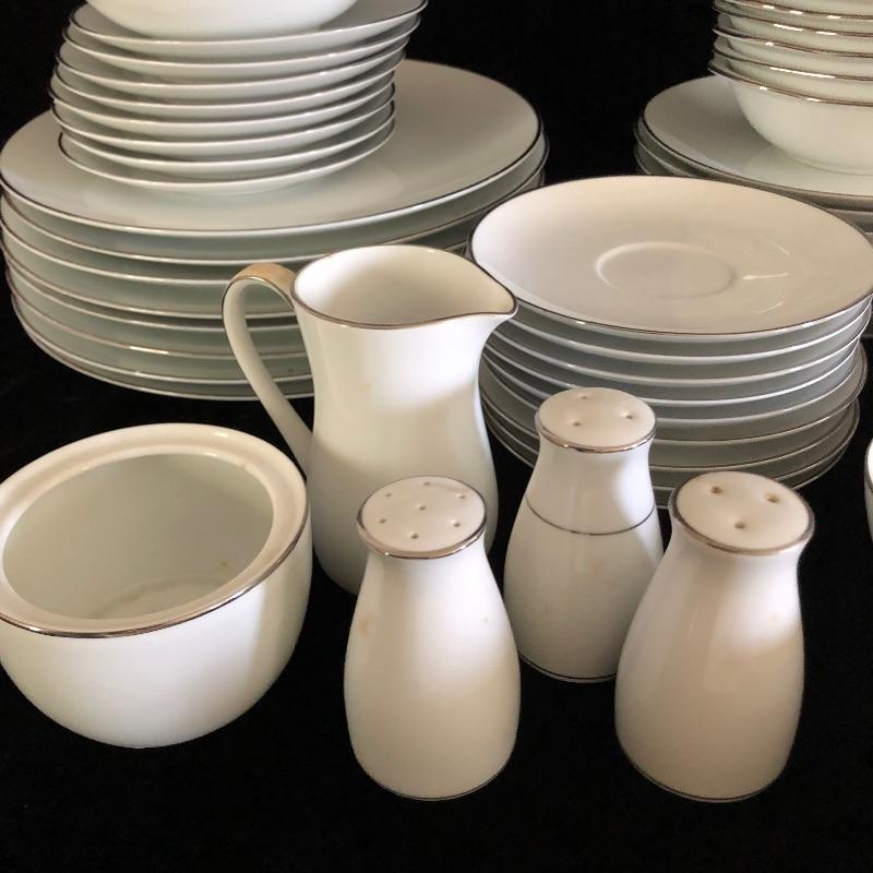 Large china dinnerware set by Noritake. The white with platinum rims gives this set a classic and sleek look. There are different amounts of each, these are listed here and also please see more in images. Eight dinner plates, six smaller side plates (two are chipped). Eight saucers, Nine cups, eleven bowls, two serving bowls, one platter, salt and pepper, creamer and more. One large dinner plate also has a chip.