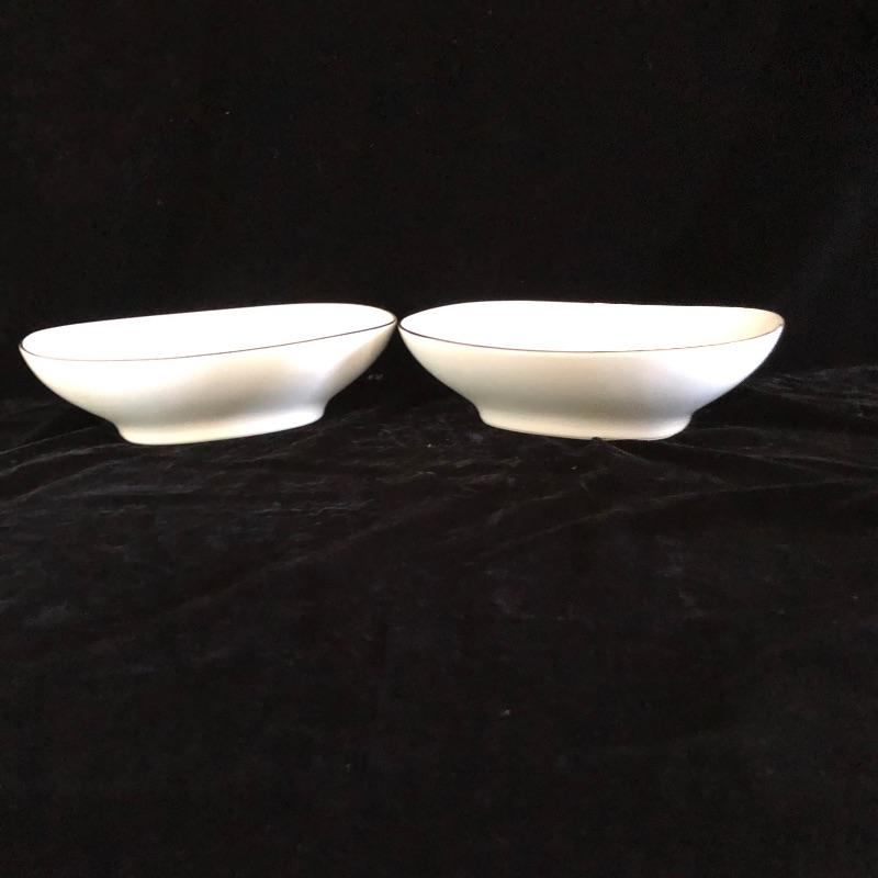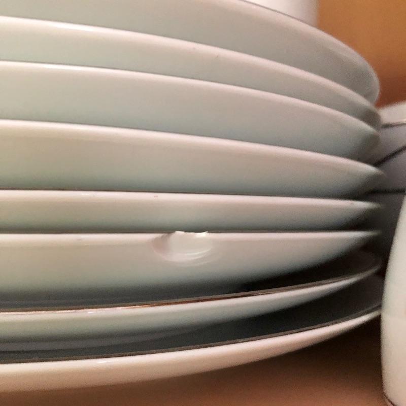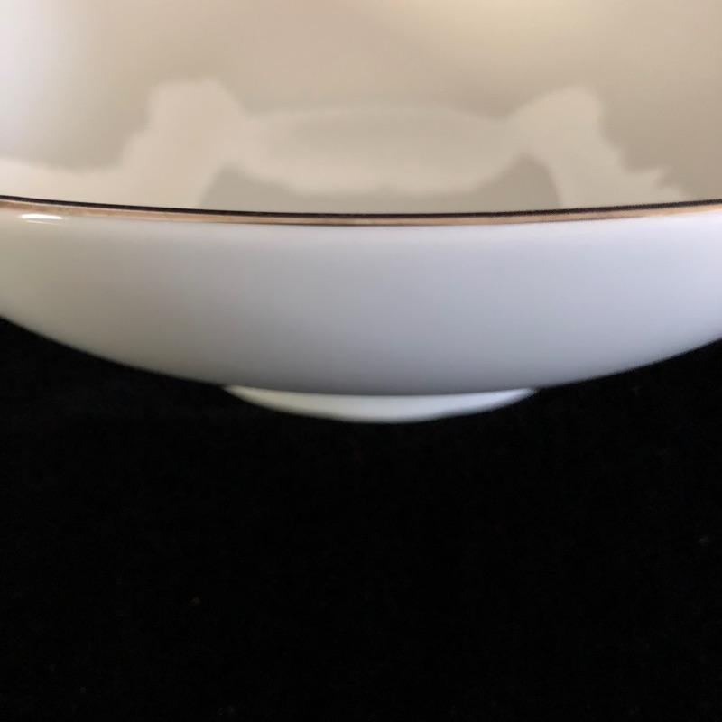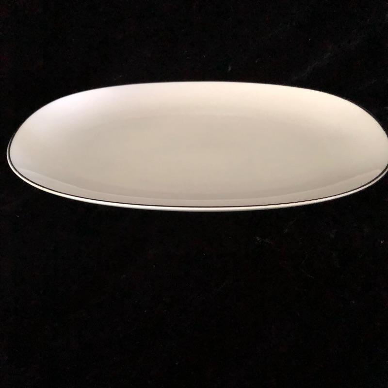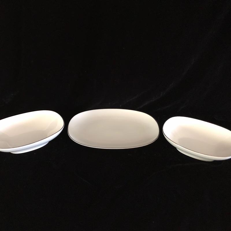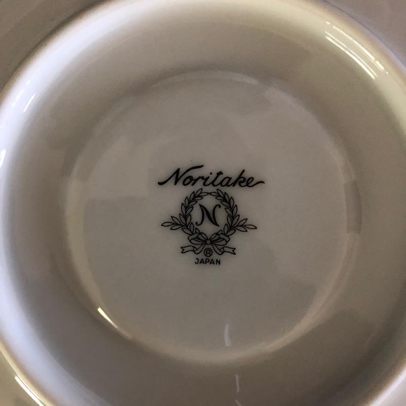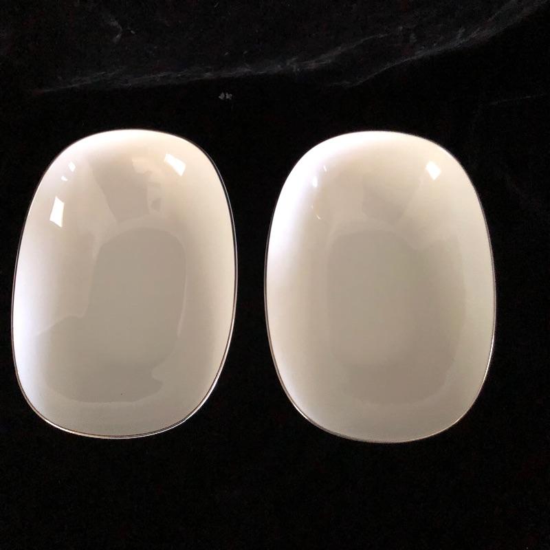 Large china dinnerware set by Noritake. The white with platinum rims gives this set a classic and sleek look. There are different amounts of each, these are listed here and also please see more in images. Eight dinner plates, six smaller side plates (two are chipped). Eight saucers, Nine cups, eleven bowls, two serving bowls, one platter, salt and pepper, creamer and more. One large dinner plate also has a chip.