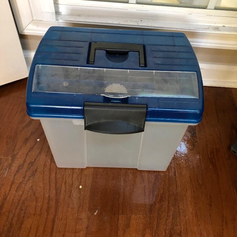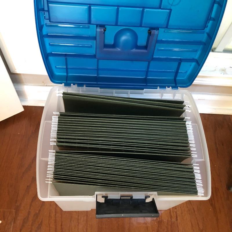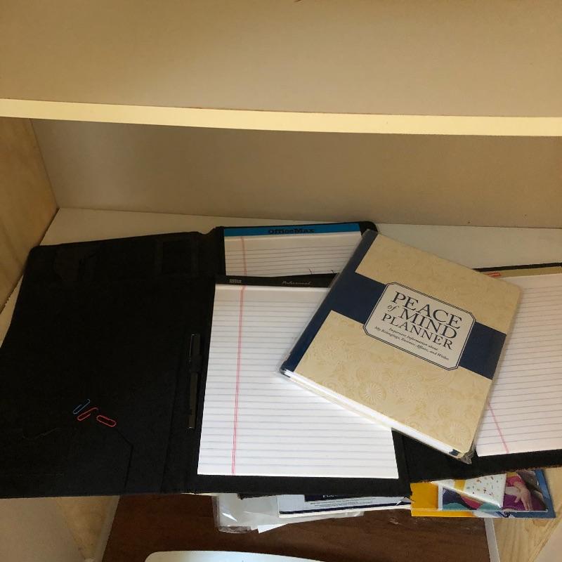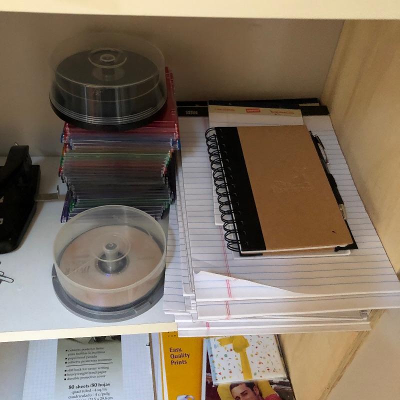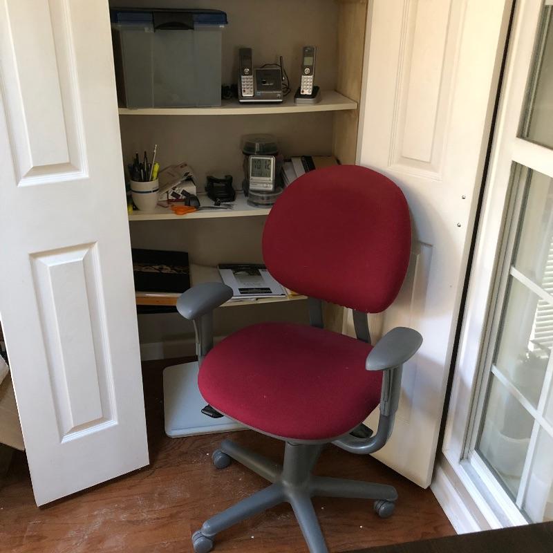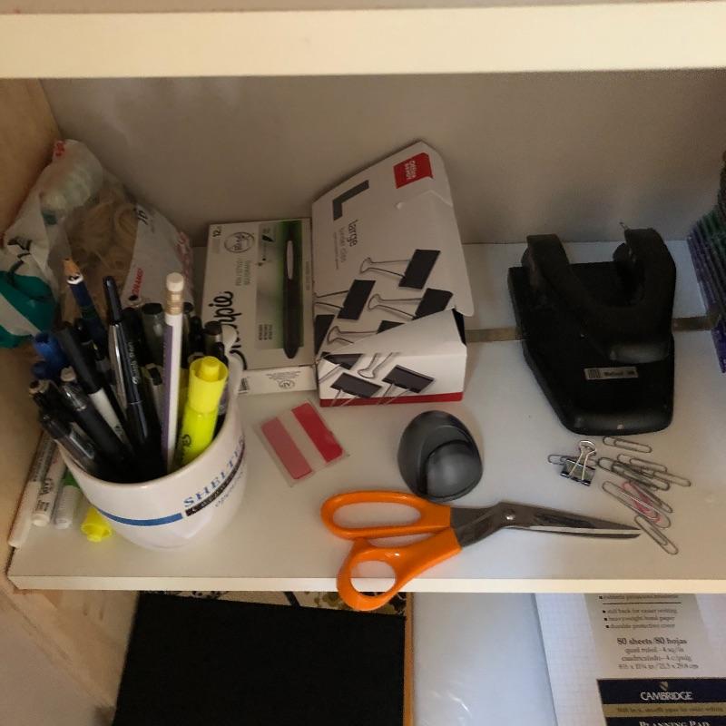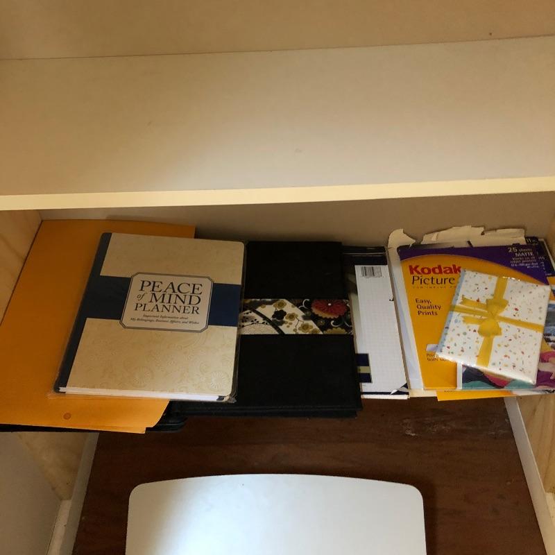 This large contains too much to list here so see all our images, but to name a few things that are included - office chair, 2 AT&T phones, file storage box and lots of paper that includes notepads, Kodak picture and more. The grey keyboard holder pictured last would be great to raise your keyboard at a standing desk.