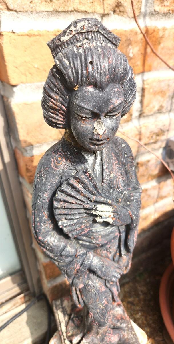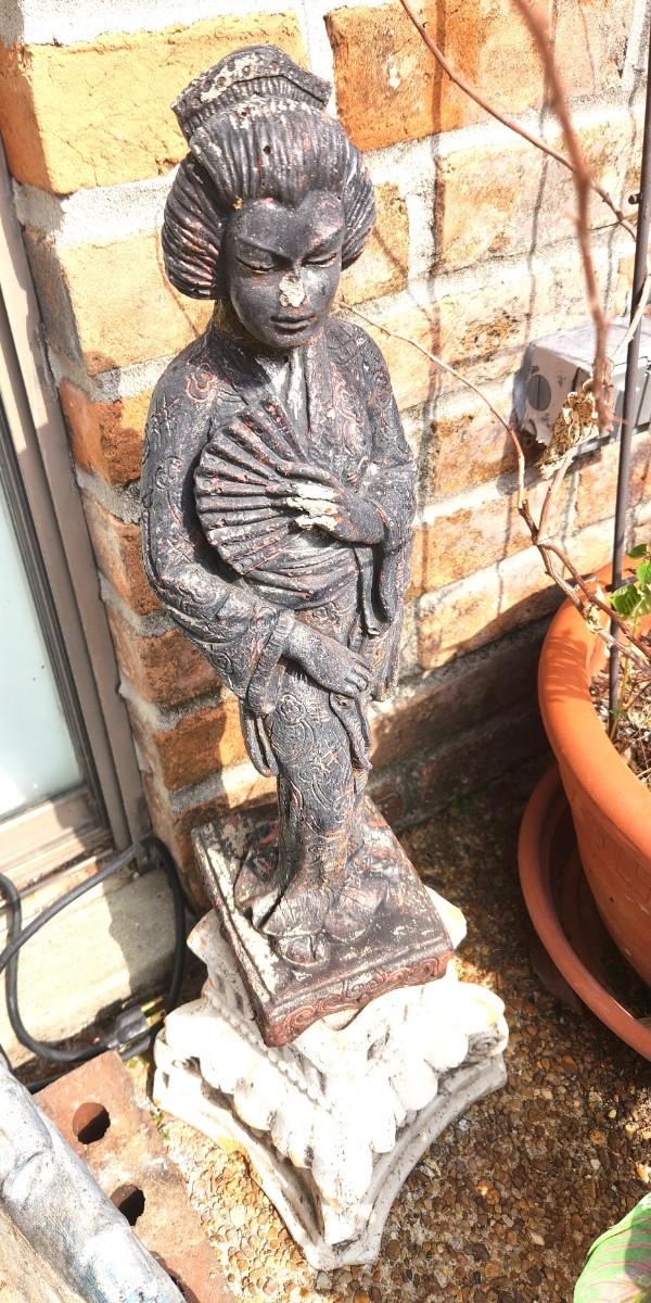 Plaster Statue on Base of a Geisha - 2 pieces. 20" tall. Has been outdoors for awhile - chips, etc. Weathered look.