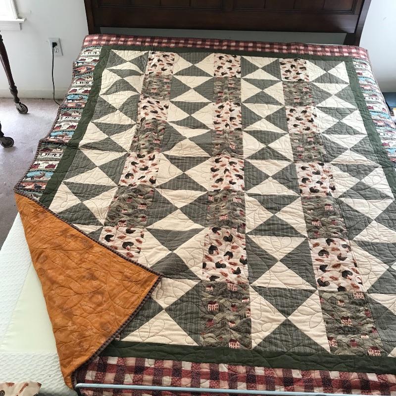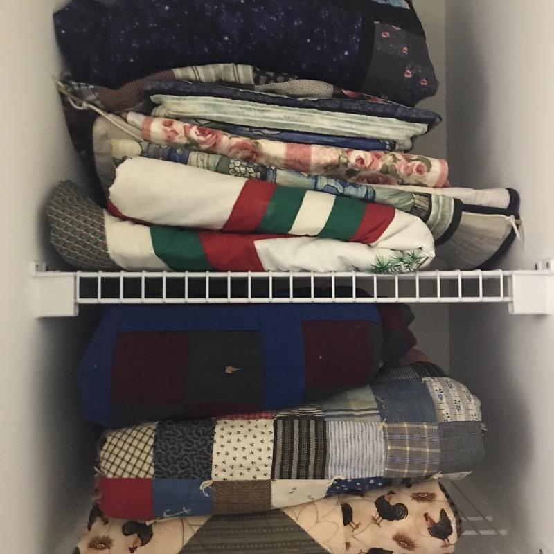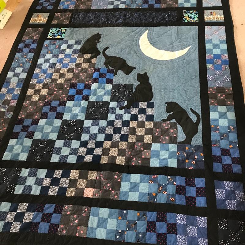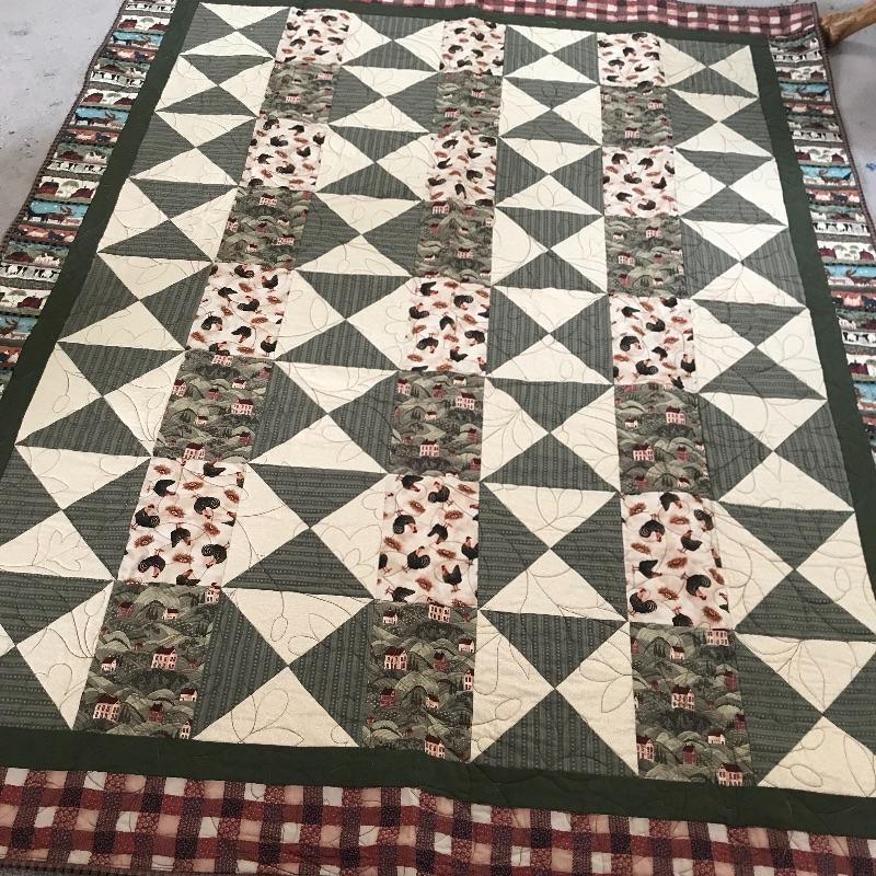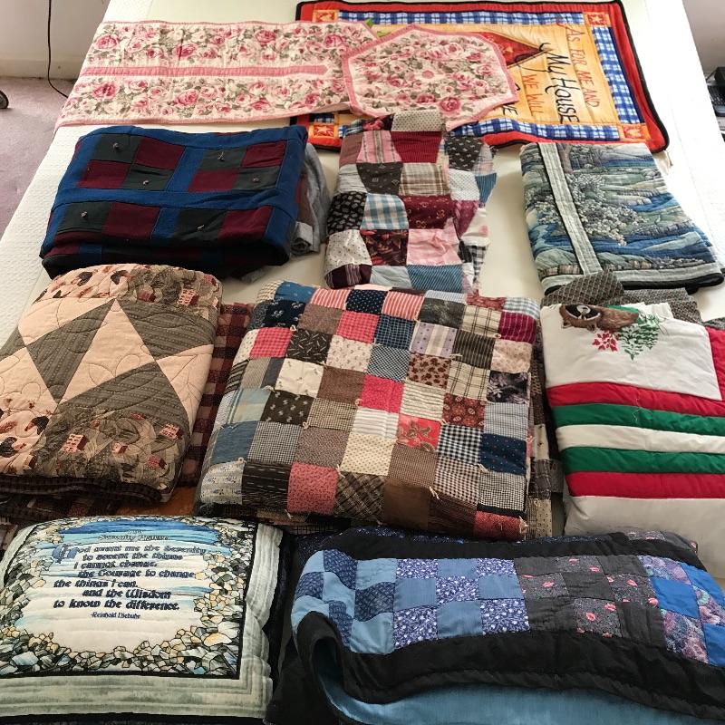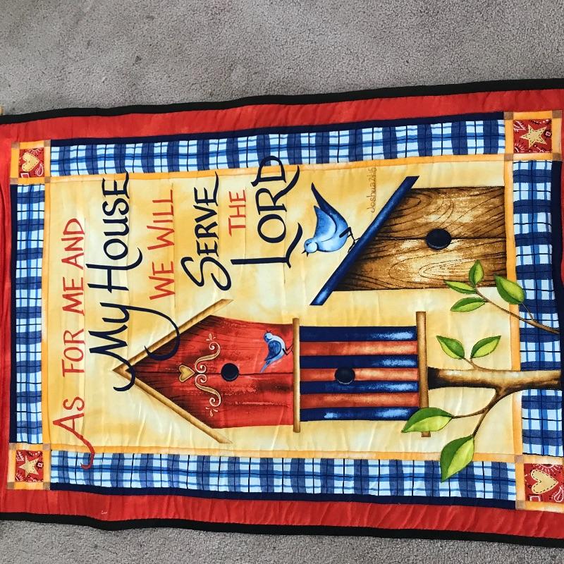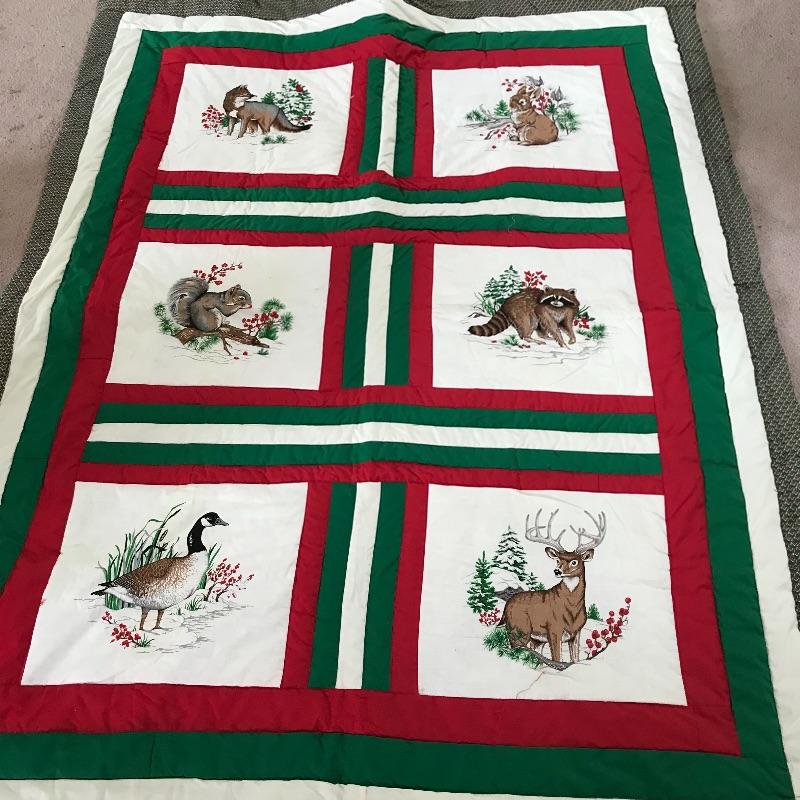Lot includes 10 quilted items of many shapes, sizes, and designs including a sweet cat quilt, a Serenity Prayer quilted pillow, one with wild life, one with patchwork squares and more. Lot also includes a runner and matching centerpiece and a large incomplete quilt. The birdhouse quilt is a banner with a horizontal flagpole, string needs to be reattached to hang, but appears to be an easy fix. There is also a farm themed quilt with two matching pillowcases. See pics. Shipping available.