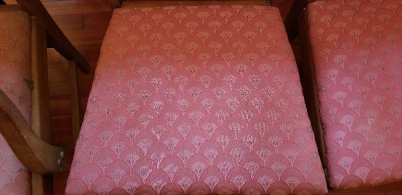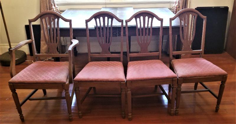 Set of four matching vintage dining room chairs - one is an armchair, the others have no arms. Vintage condition - upholstery ok. A couple of the chairs could be reglued. Each is 37.5" tall, 19" deep, and 18" across. These were being used with the table in the previous lot. You get all the chairs you see here.