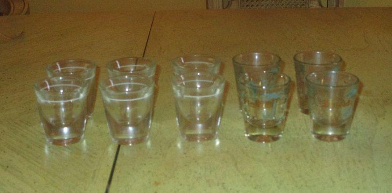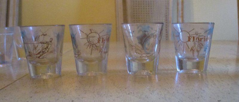 The ones that have the single white stripe are a traditional shot glass. The other four are all the same, but they have a wrapping around picture that highlights that they are from Florida.