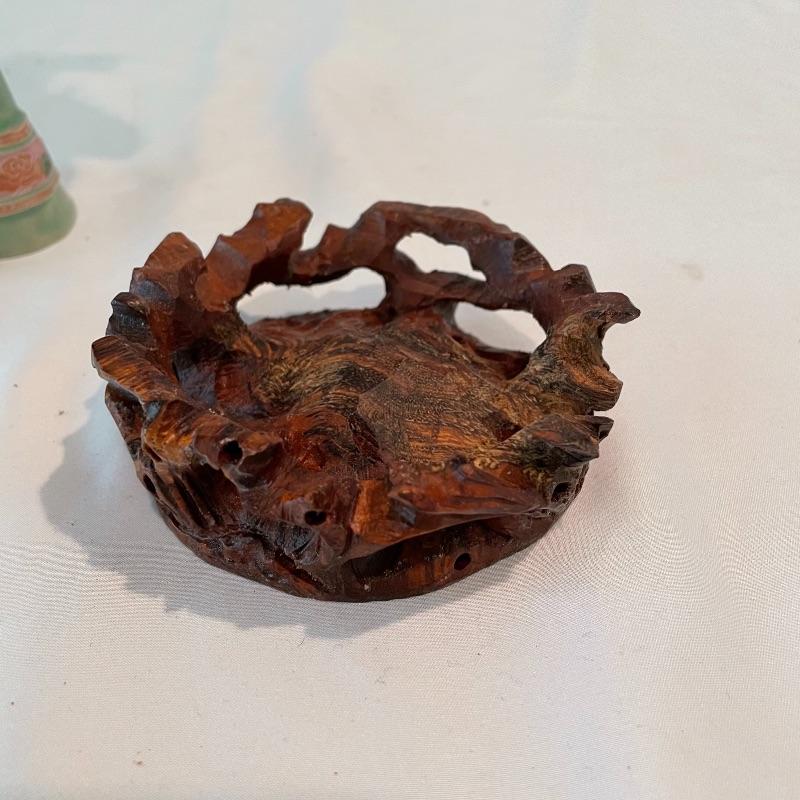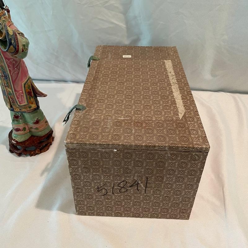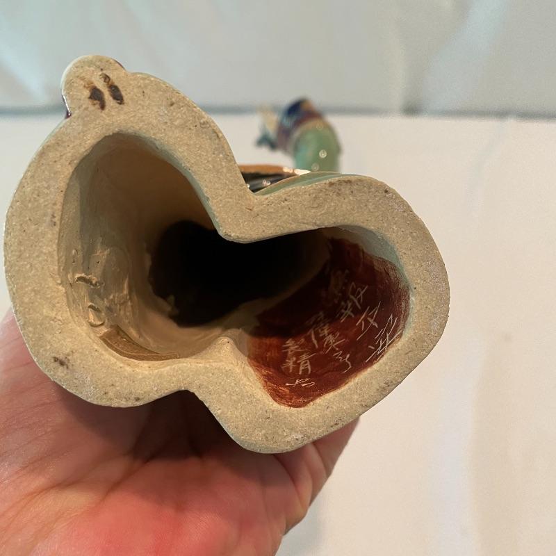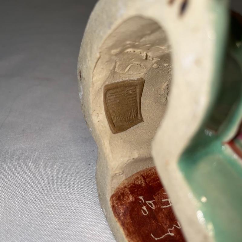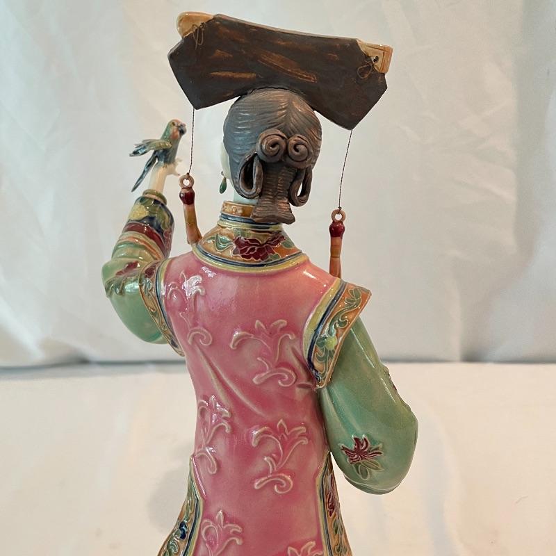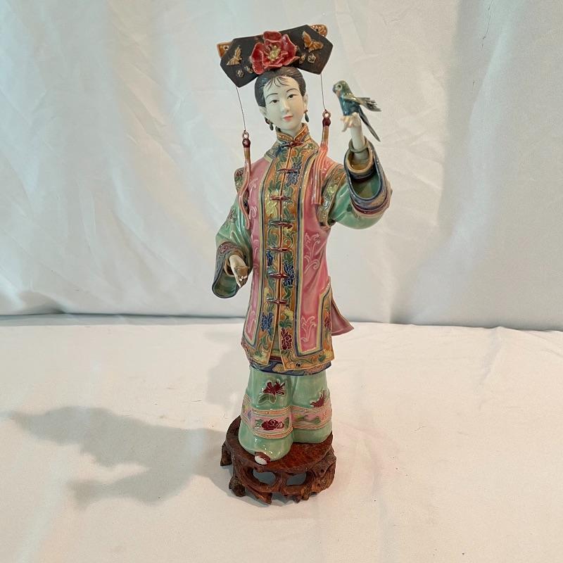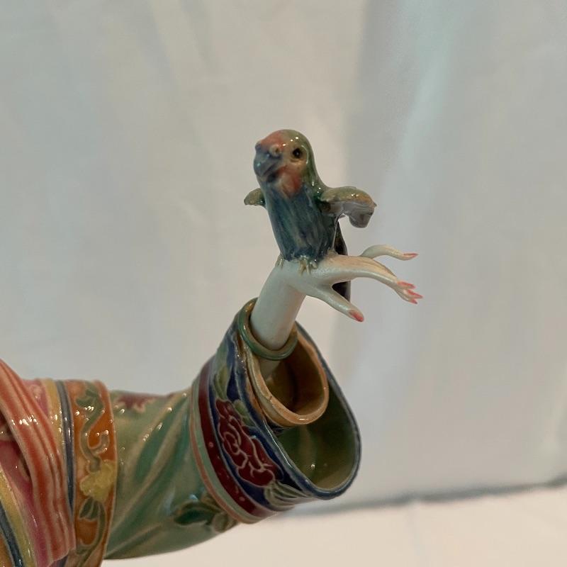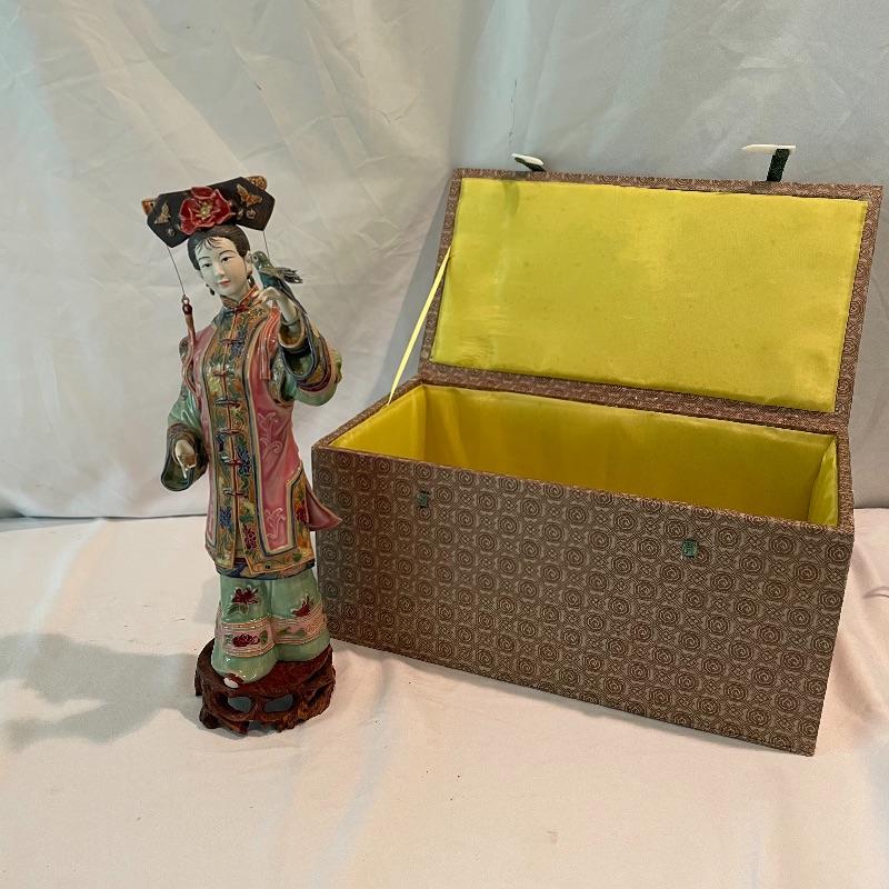Intricate detail throughout including the tiny bowl handles and bird feathers. Paperwork found on property states “Girl with Bird”, lot includes burlwood style stand and lined carrying box. The inner parts have 19 and many other symbols inscribed. Her face and hands are without color, similar to the mud men found in earlier lots. She is about 12” tall without her stand. Box measures approximately 14” x 7.75” x 6.75”. See images. Shipping available.