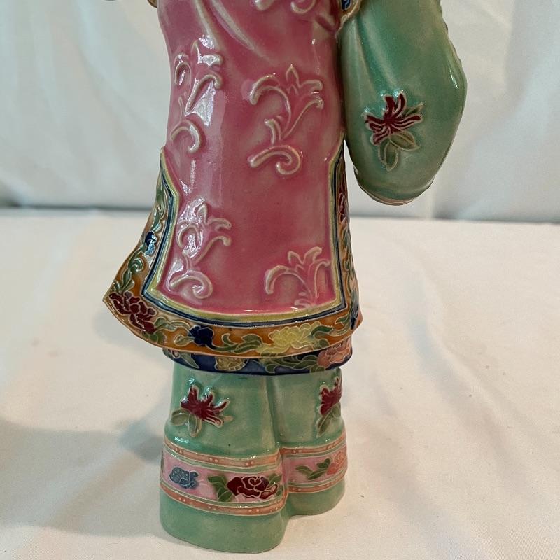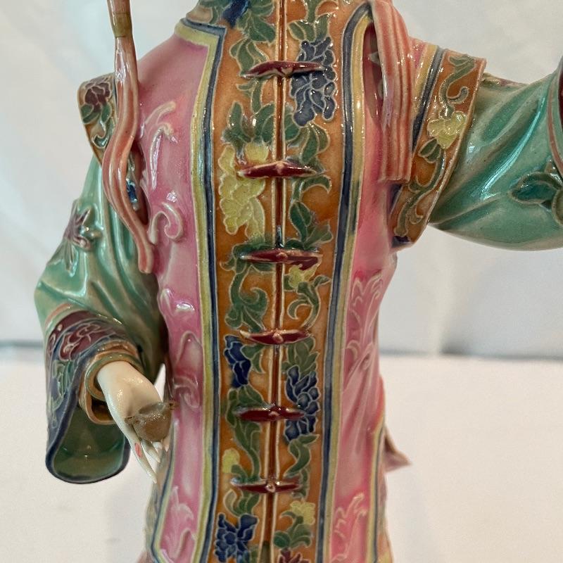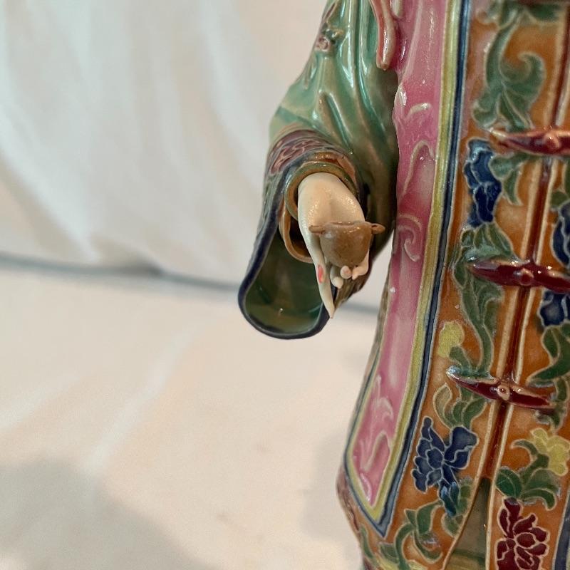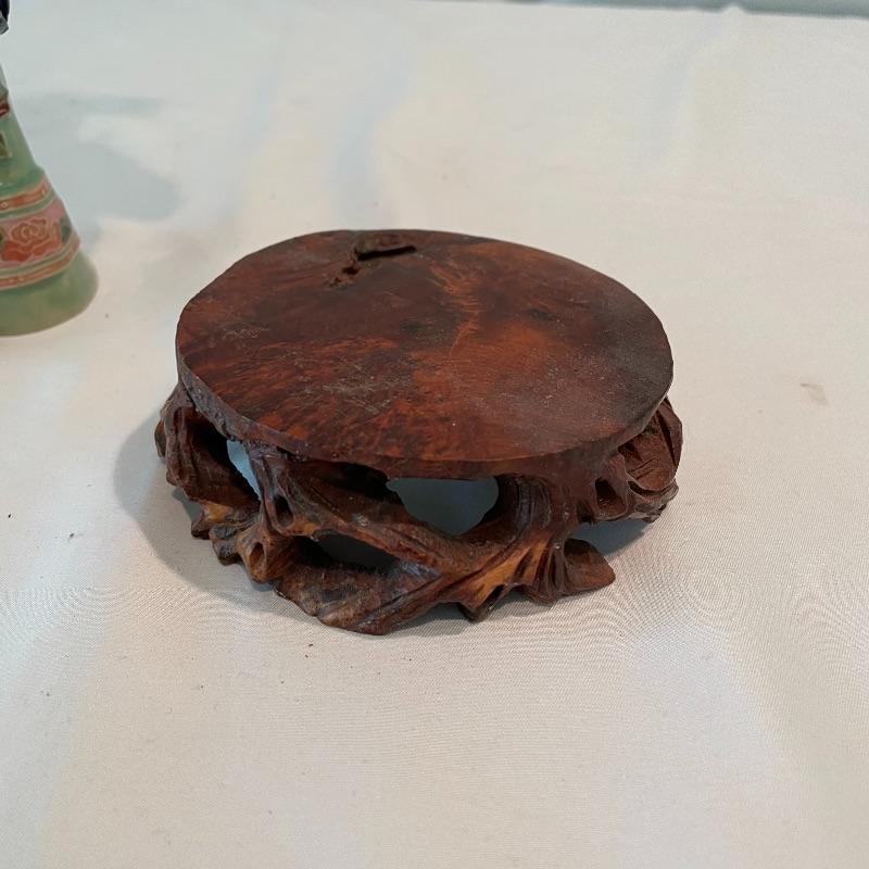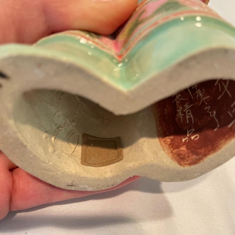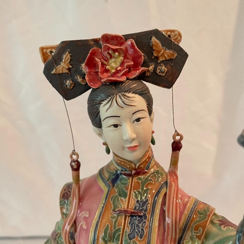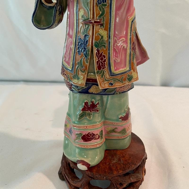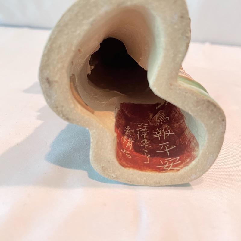 Intricate detail throughout including the tiny bowl handles and bird feathers. Paperwork found on property states “Girl with Bird”, lot includes burlwood style stand and lined carrying box. The inner parts have 19 and many other symbols inscribed. Her face and hands are without color, similar to the mud men found in earlier lots. She is about 12” tall without her stand. Box measures approximately 14” x 7.75” x 6.75”. See images. Shipping available.