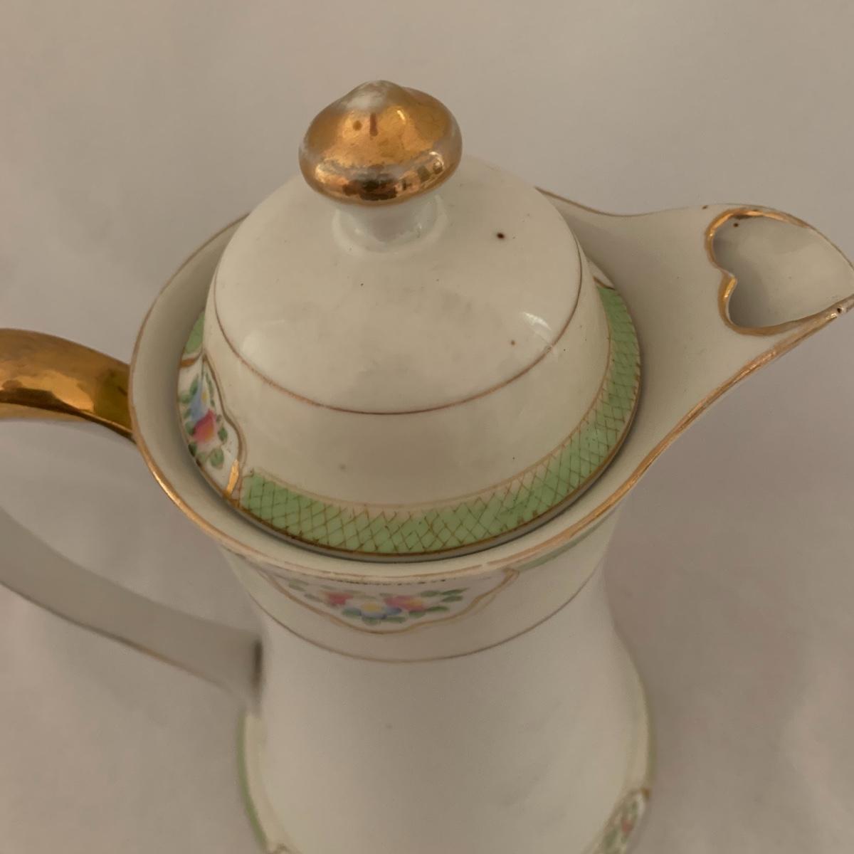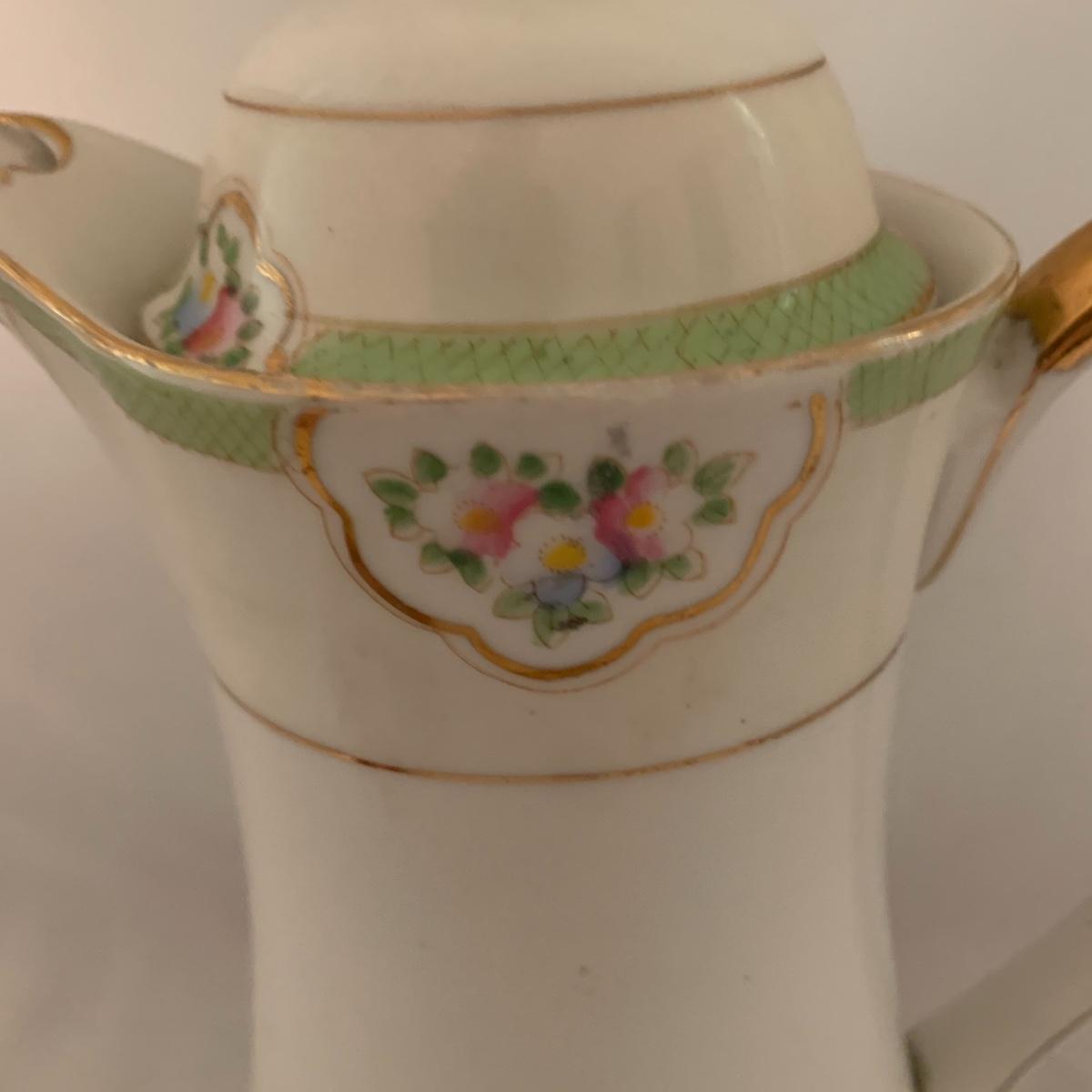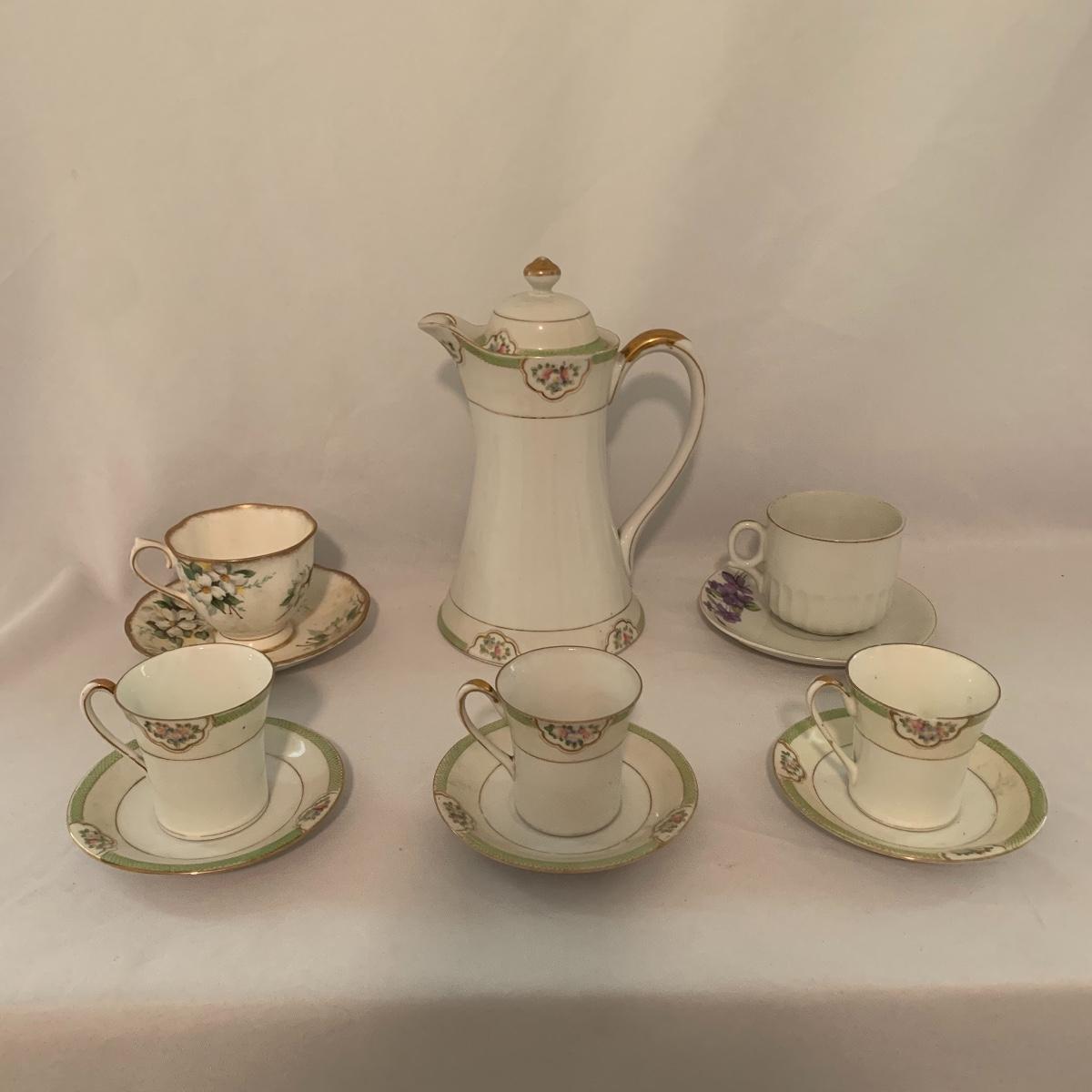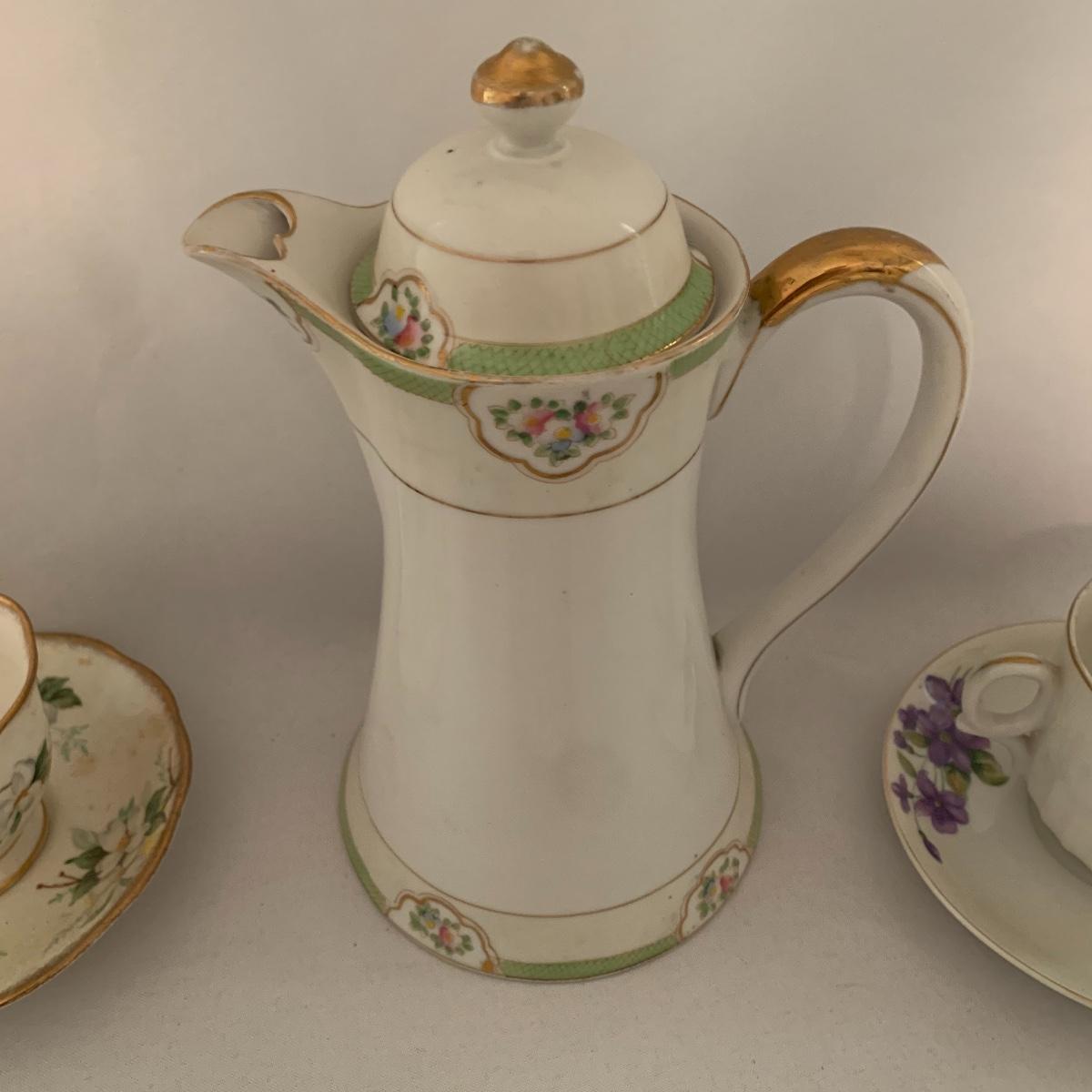 Enjoy tea time with this adorable tea set. This set includes a beautiful tea pitcher that stands 10” tall that features a green/floral motif as well as guided trim. There are also three cup and saucer sets that match the pitcher. The other two cup/saucer sets also have a charming floral motif. Everything included in this lot is in good condition. See makers mark pics to determine manufacturer. Shipping available