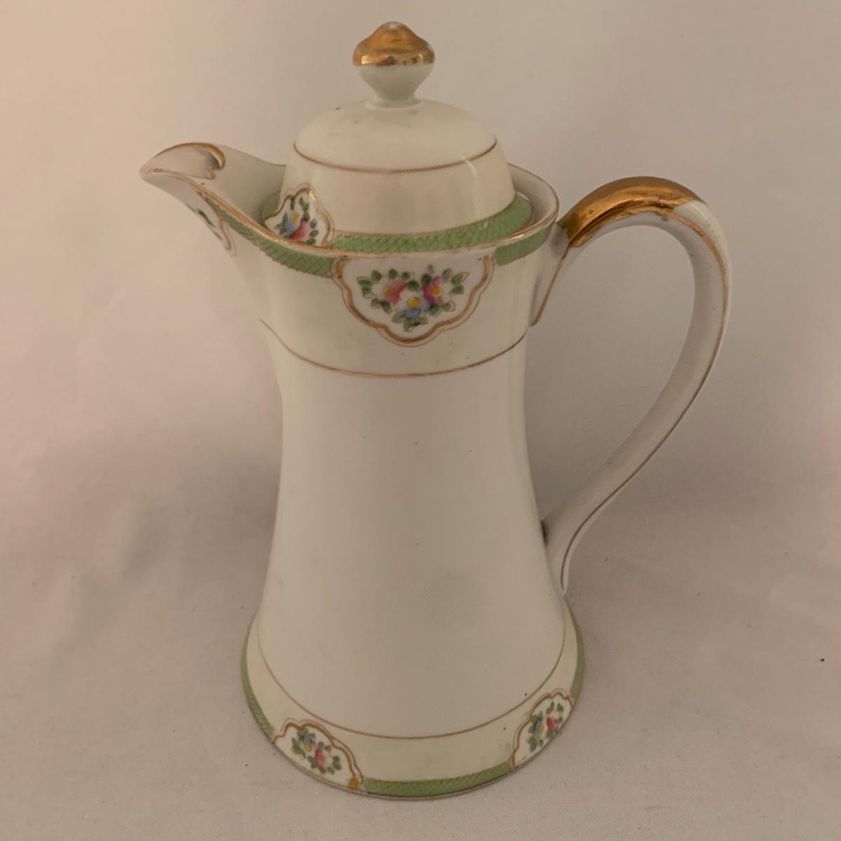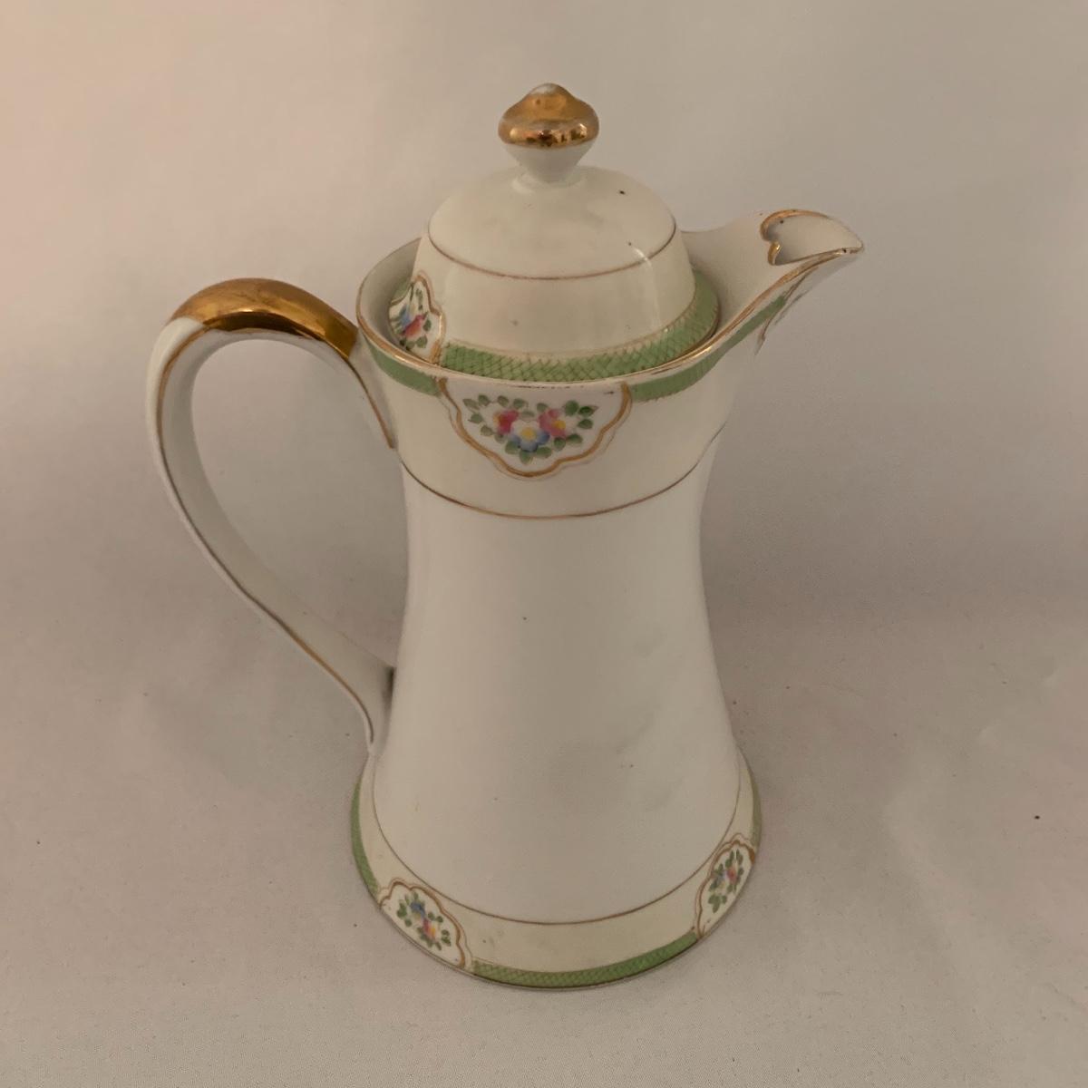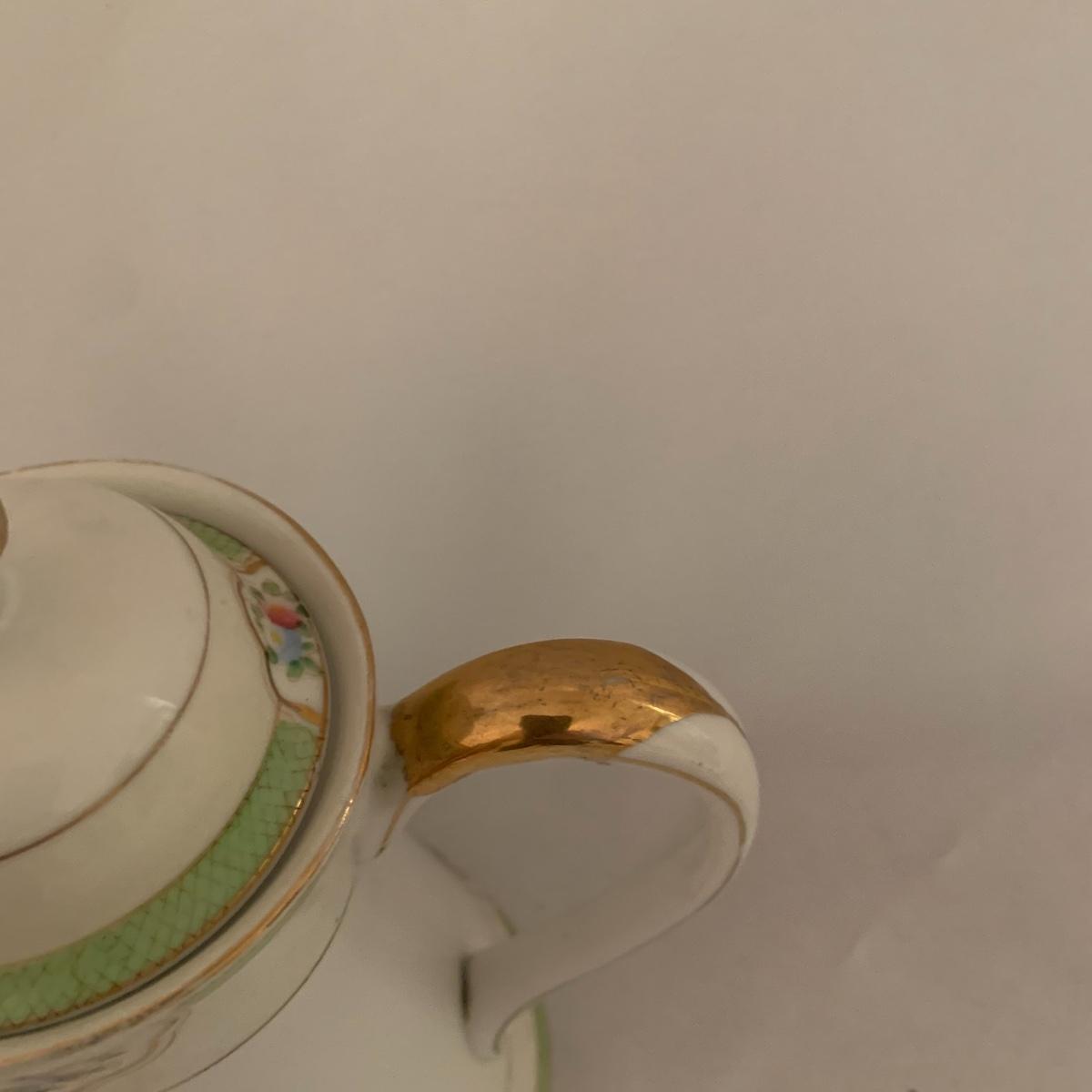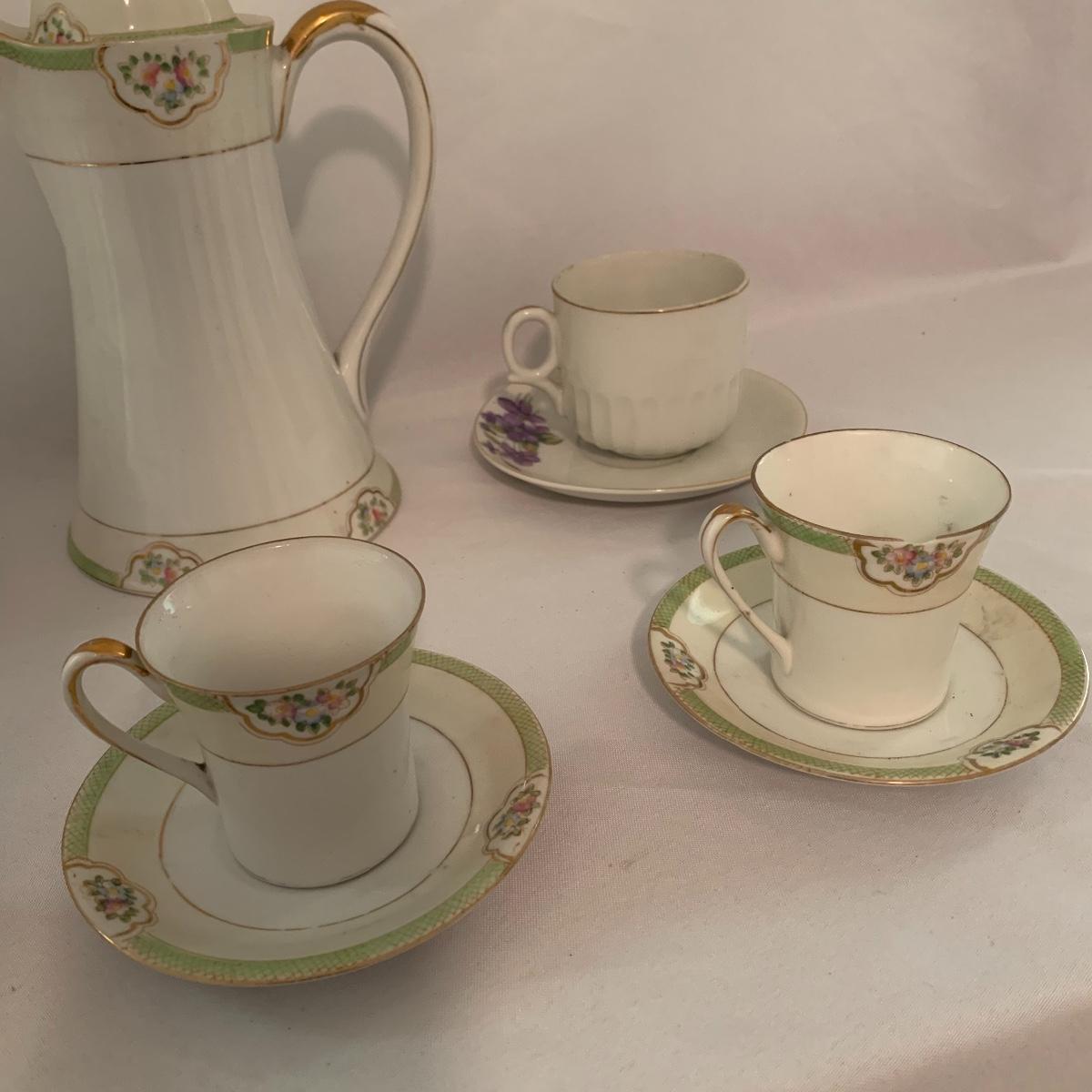 Enjoy tea time with this adorable tea set. This set includes a beautiful tea pitcher that stands 10” tall that features a green/floral motif as well as guided trim. There are also three cup and saucer sets that match the pitcher. The other two cup/saucer sets also have a charming floral motif. Everything included in this lot is in good condition. See makers mark pics to determine manufacturer. Shipping available