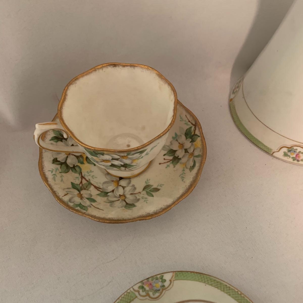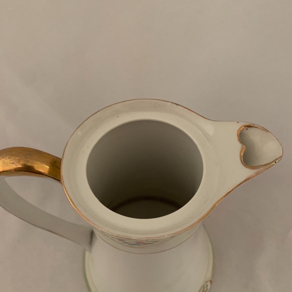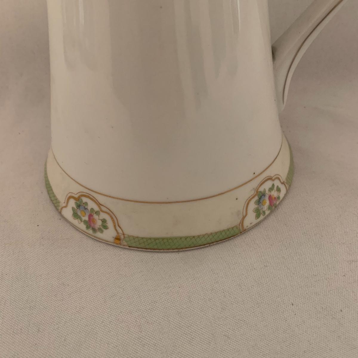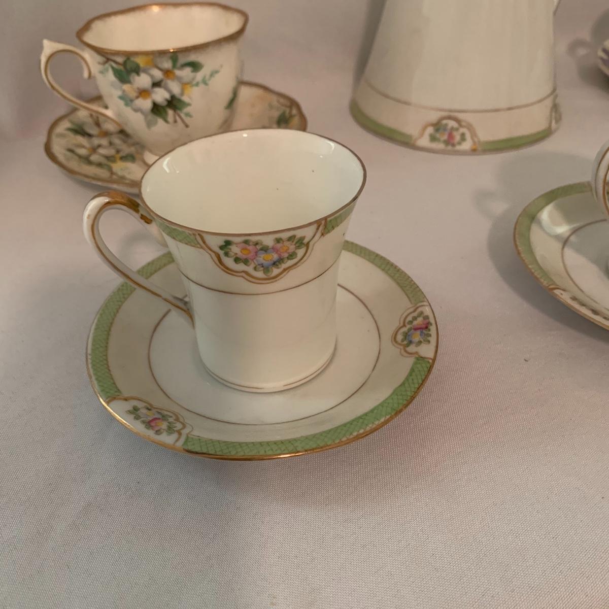 Enjoy tea time with this adorable tea set. This set includes a beautiful tea pitcher that stands 10” tall that features a green/floral motif as well as guided trim. There are also three cup and saucer sets that match the pitcher. The other two cup/saucer sets also have a charming floral motif. Everything included in this lot is in good condition. See makers mark pics to determine manufacturer. Shipping available