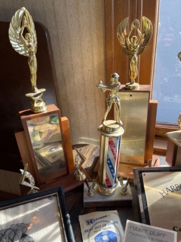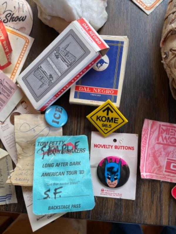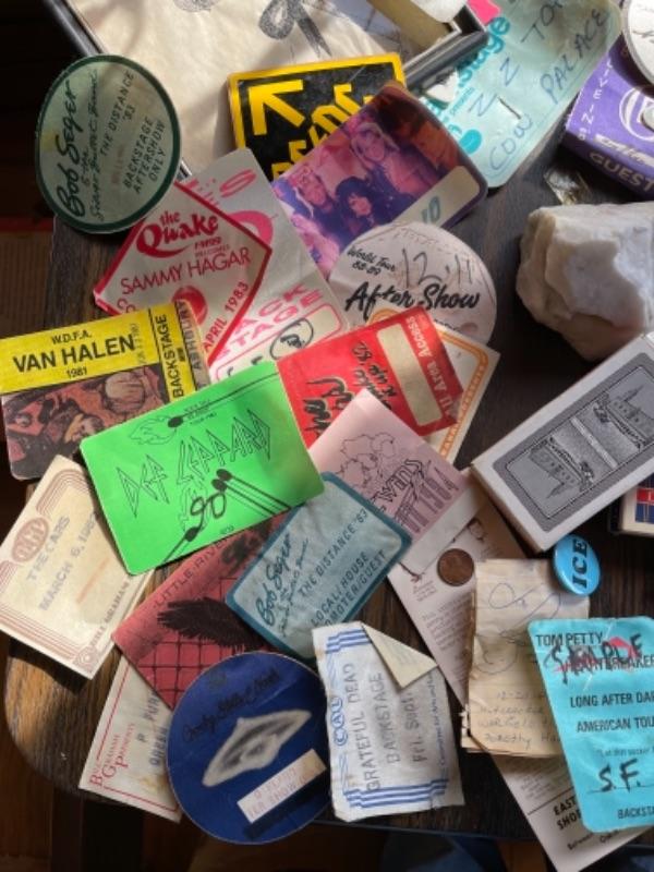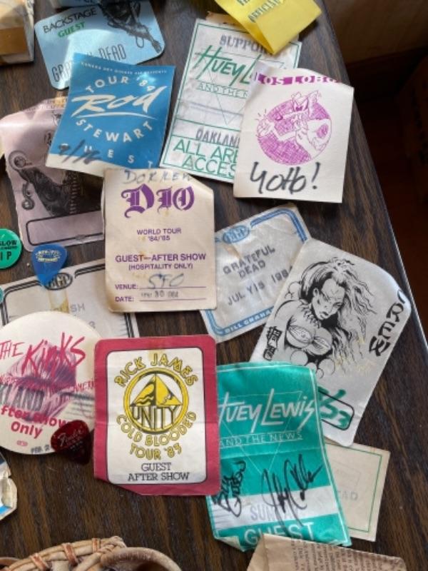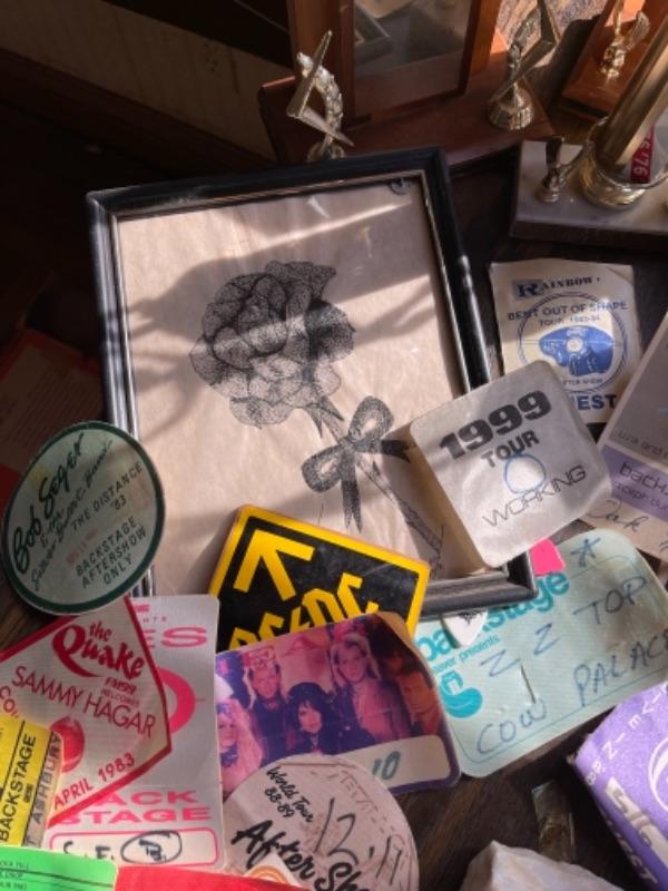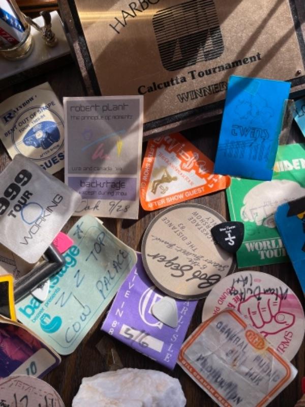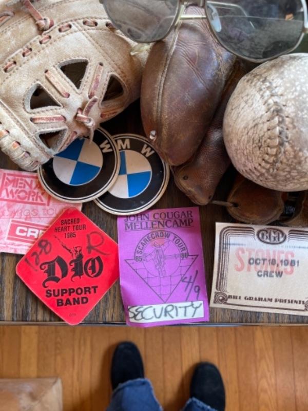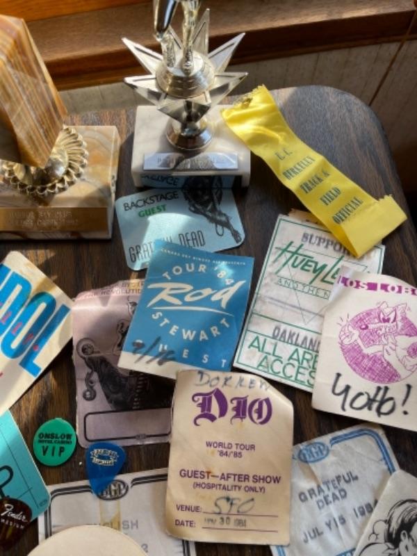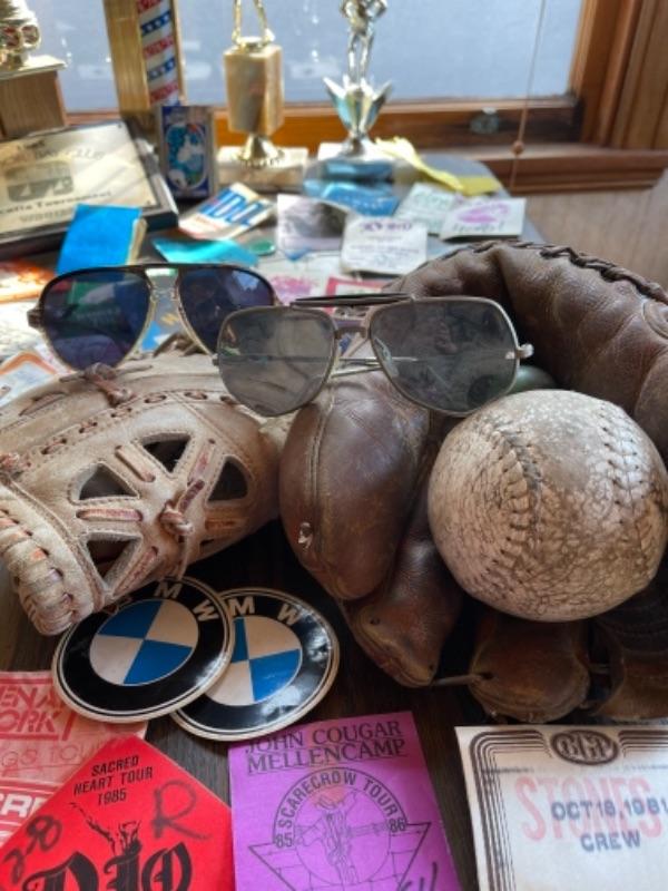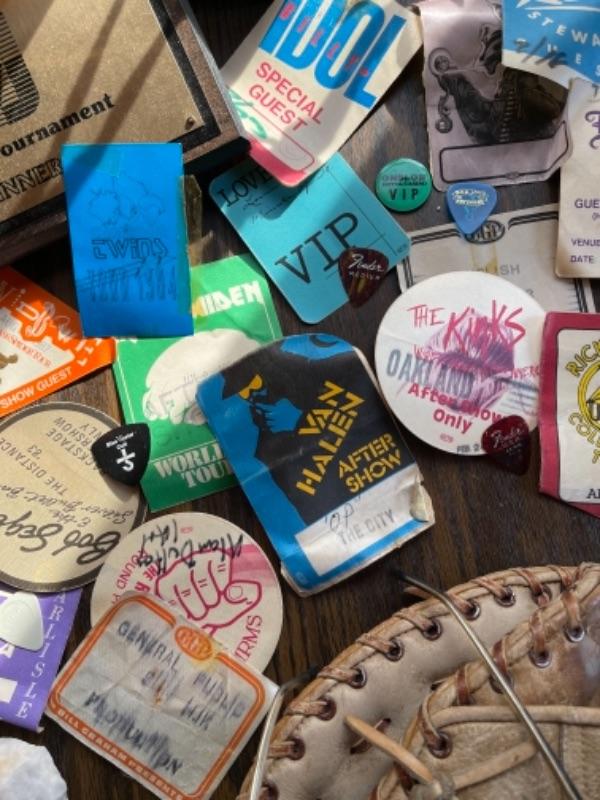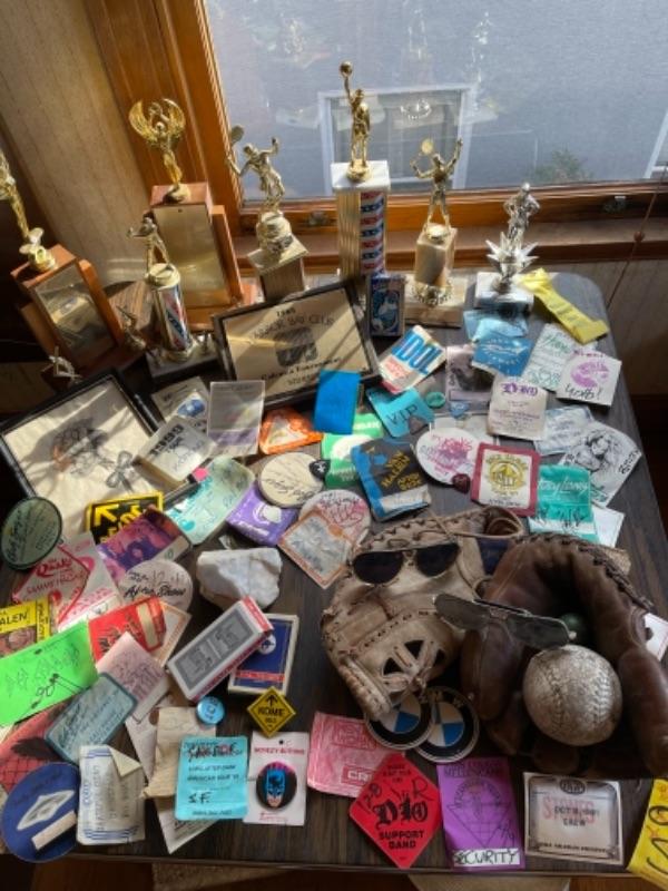 Lot 104. Trophies, vintage baseball mitts, softball, concert tickets/stickers/passes; guitar picks, sunglasses“”$45