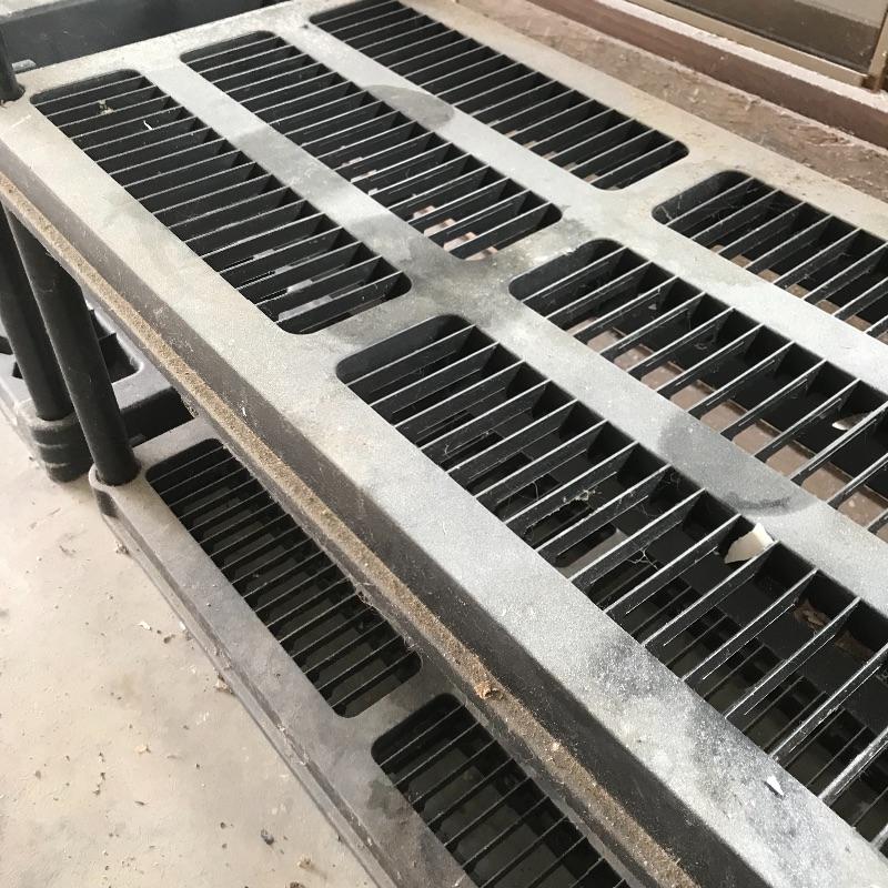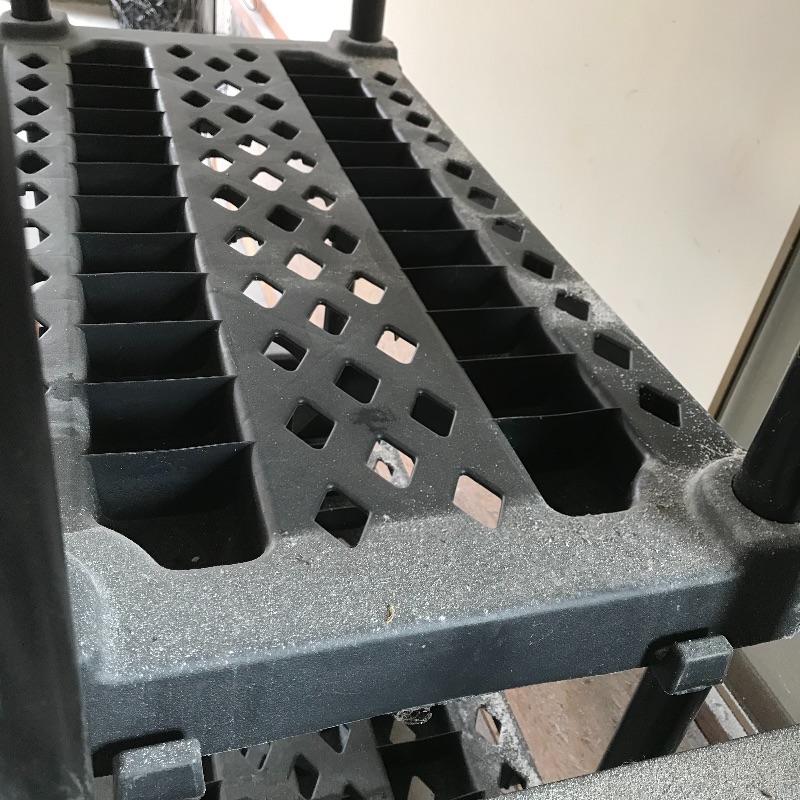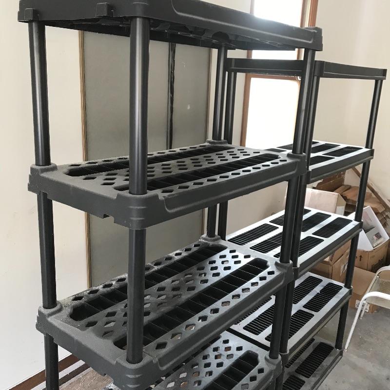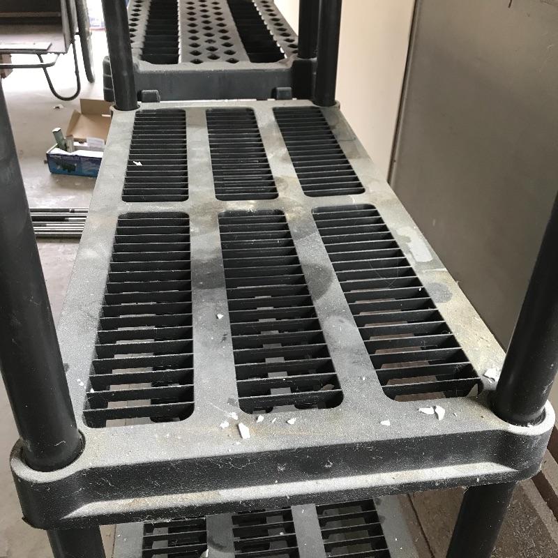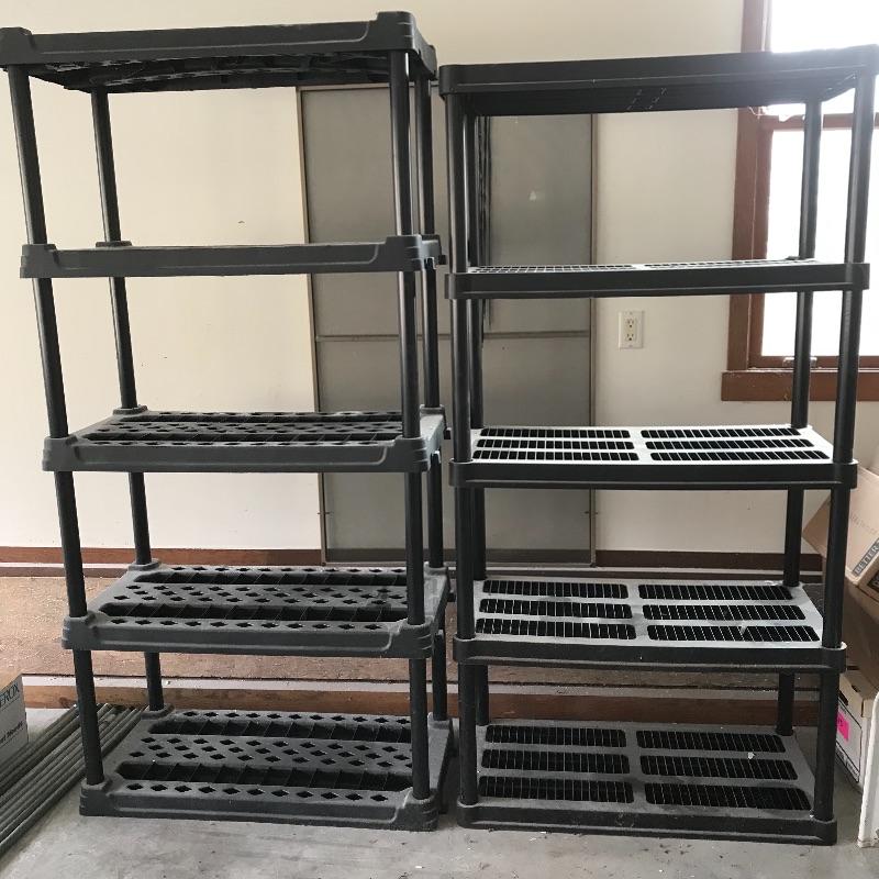 Two black heavy duty plastic shelf units. Both appear in great shape, but need a good cleaning. The taller shelf with a diamond pattern measures approximately 35.5” x 18” x 74”. No shipping.