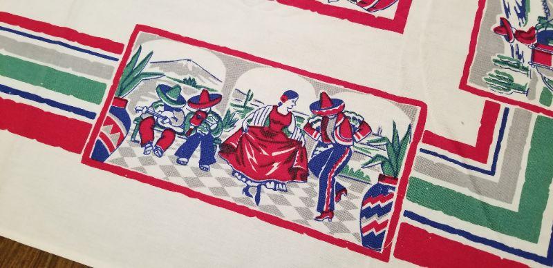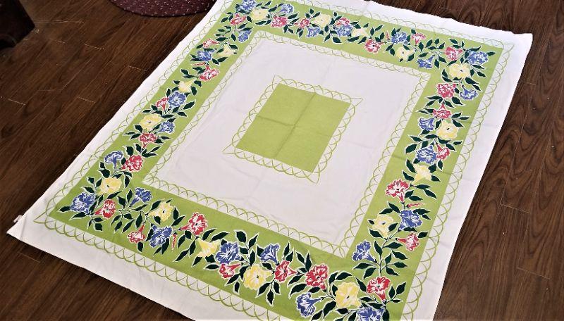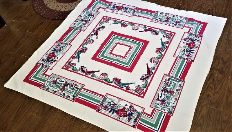 These color-stamped cotton table cloths were very popular in the 50's and 60's - two good examples here - one with a Mexican motif, the other a floral design. Mexican one measures 46" x 48" - floral is 49.5" x 44.5". Both are very clean - however, there may be one or two old faded spots. Look closely at photos.