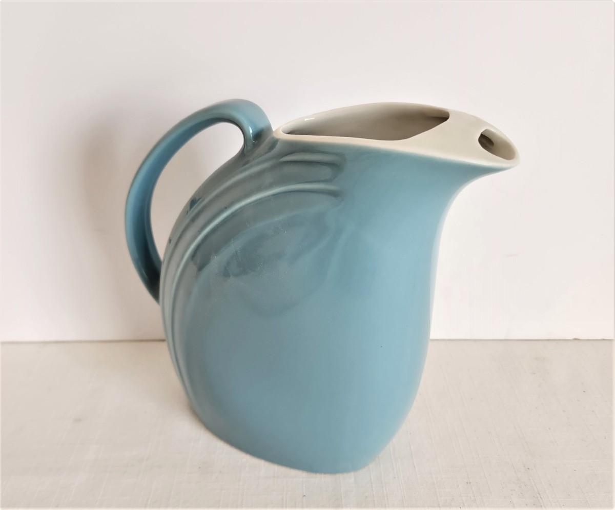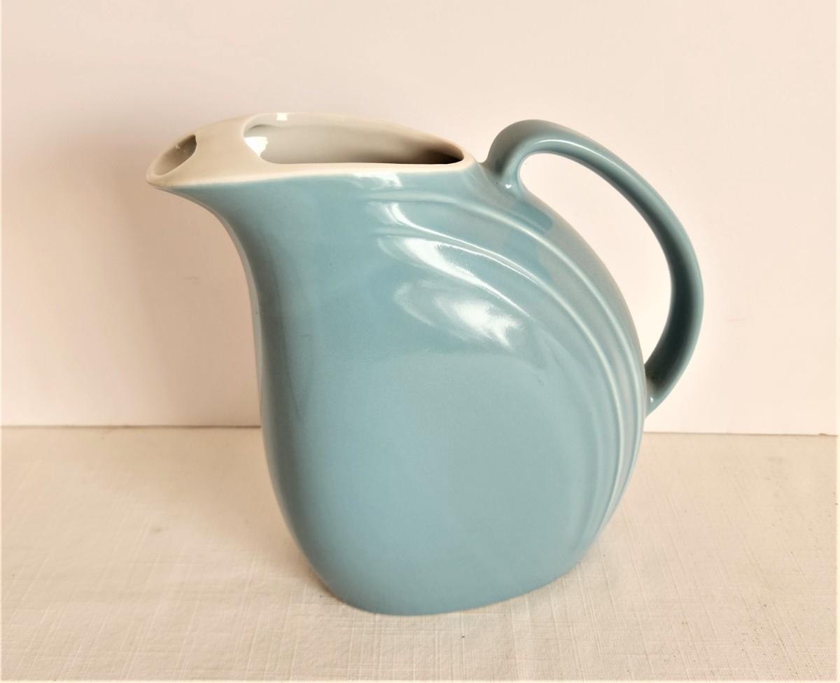 Vintage HALL Teal Pitcher in the "Nora" pattern with ice catcher - 1950's/60's. Great condition. About 9" tall.
