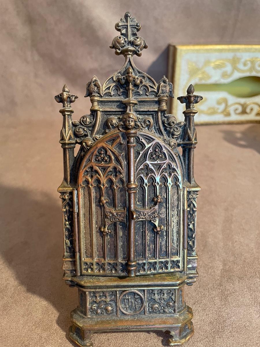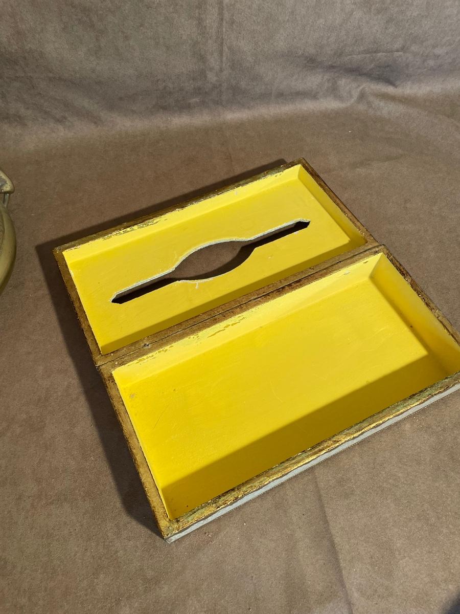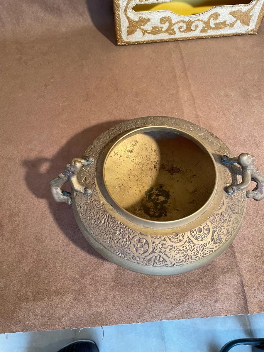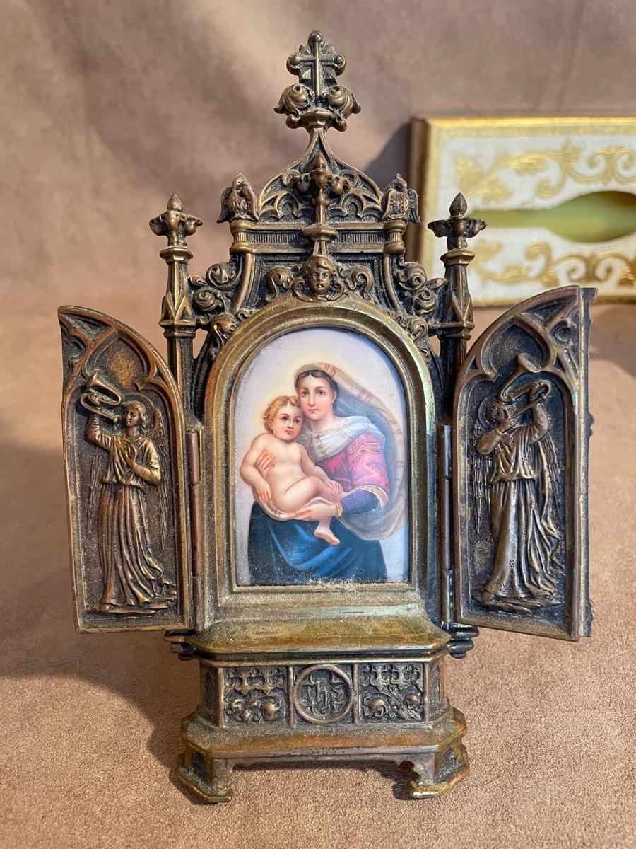 Brass planter, picture of Mary & Jesus in a fancy Cathredal-looking frame and a wooden tissue box cover