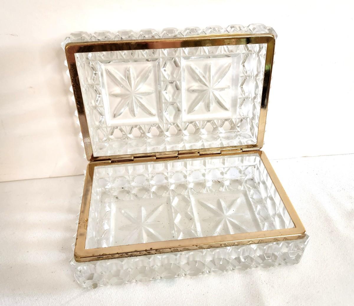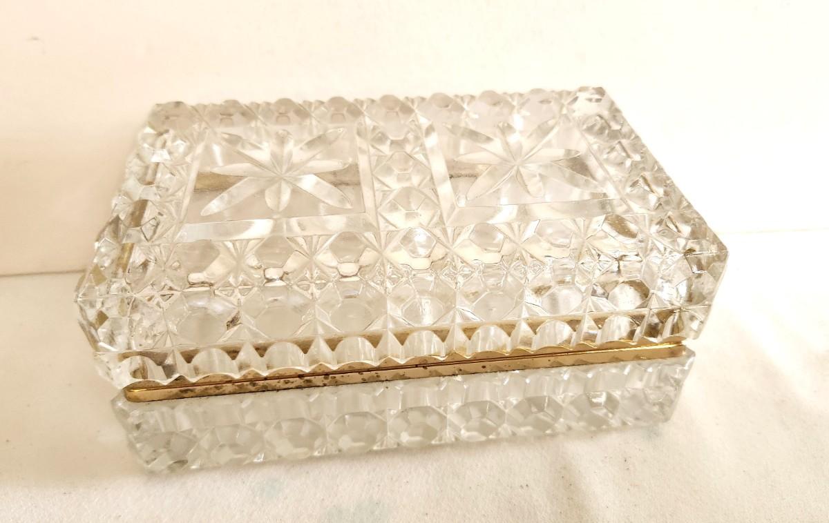 Nice vintage hinged pressed glass vanity/dresser box. Good condition - 7.5" x 5" x 3" tall.
