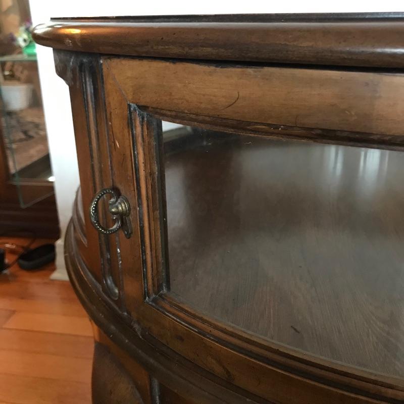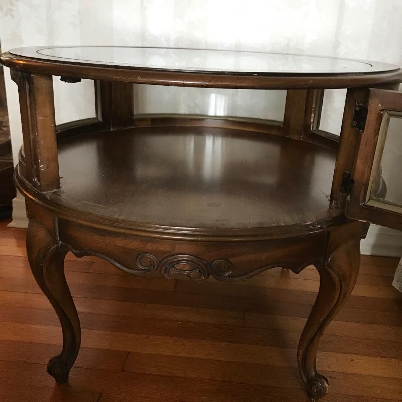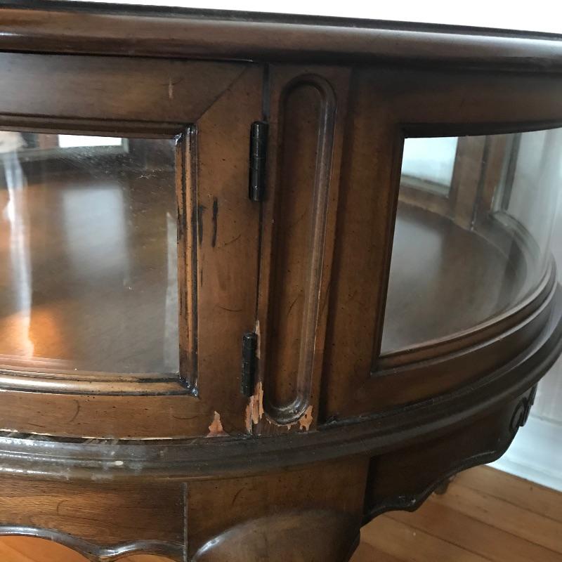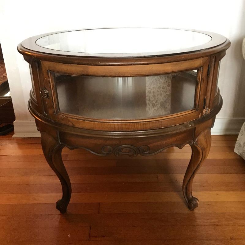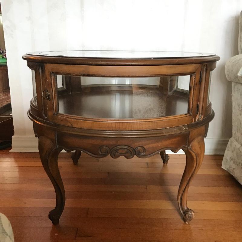 Lovely four legged vintage glass case display side table. Gorgeous wooden frame with four glass sides and a round glass top. One hinged door with antique style metal pull. Each foot has a cute swirl design and piece appears quality made and sturdy with lots of life left. Piece shows mildew and mild wear, see photos. Table measures approximately 28”d x 23”. Glass is in very good condition with minimal scratches. No shipping.