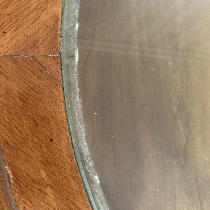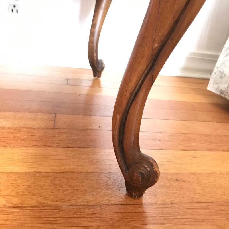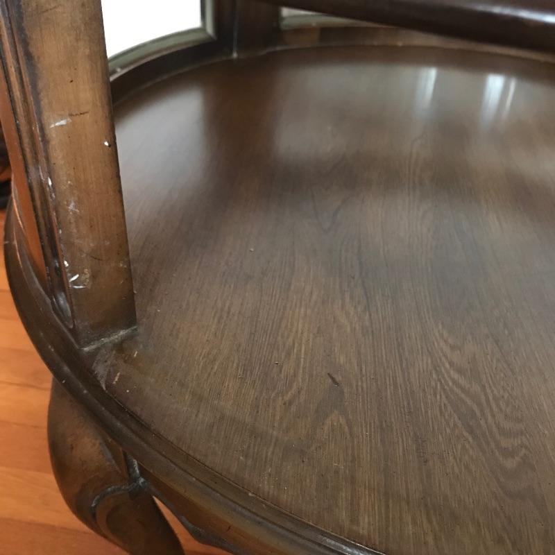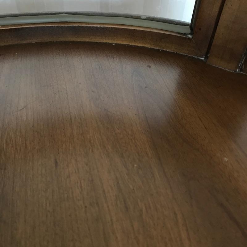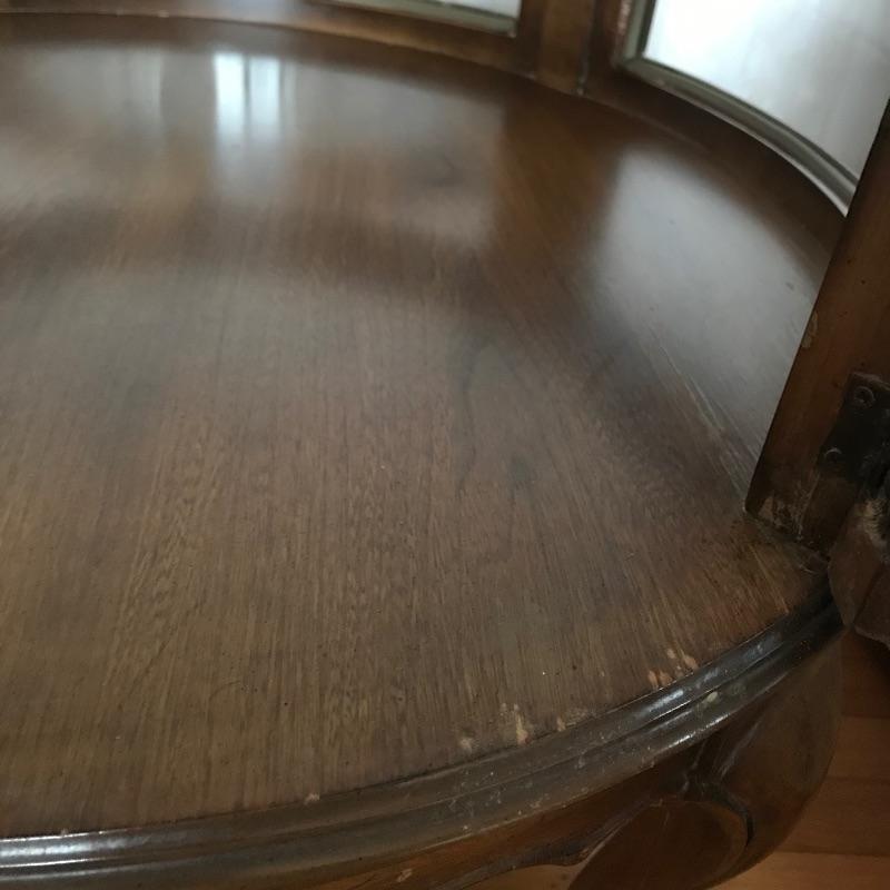Lovely four legged vintage glass case display side table. Gorgeous wooden frame with four glass sides and a round glass top. One hinged door with antique style metal pull. Each foot has a cute swirl design and piece appears quality made and sturdy with lots of life left. Piece shows mildew and mild wear, see photos. Table measures approximately 28”d x 23”. Glass is in very good condition with minimal scratches. No shipping.