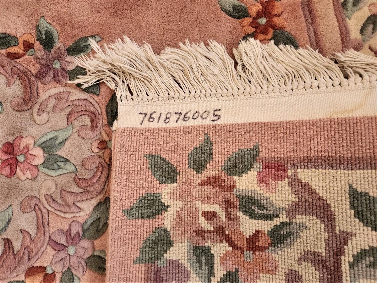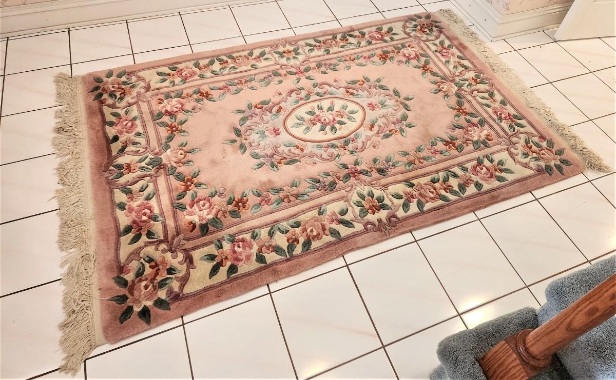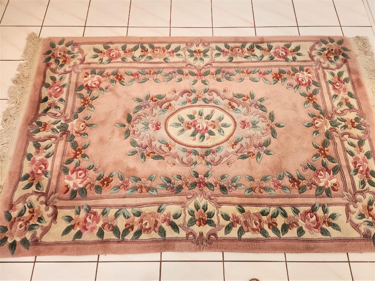 Vintage rug - no label, see stock number on reverse. Measures 45" x 76" (including fringe). Used condition.