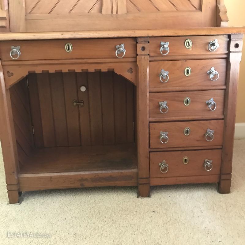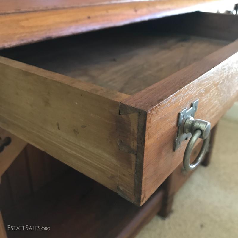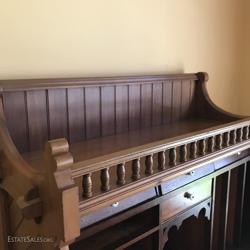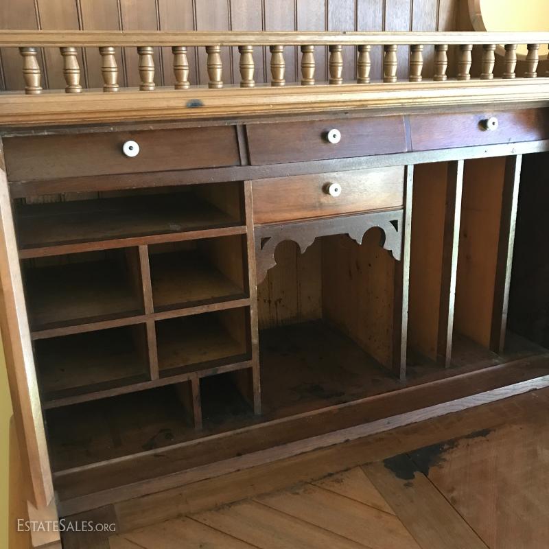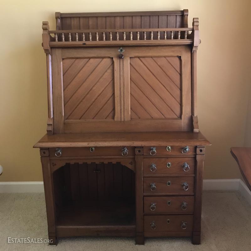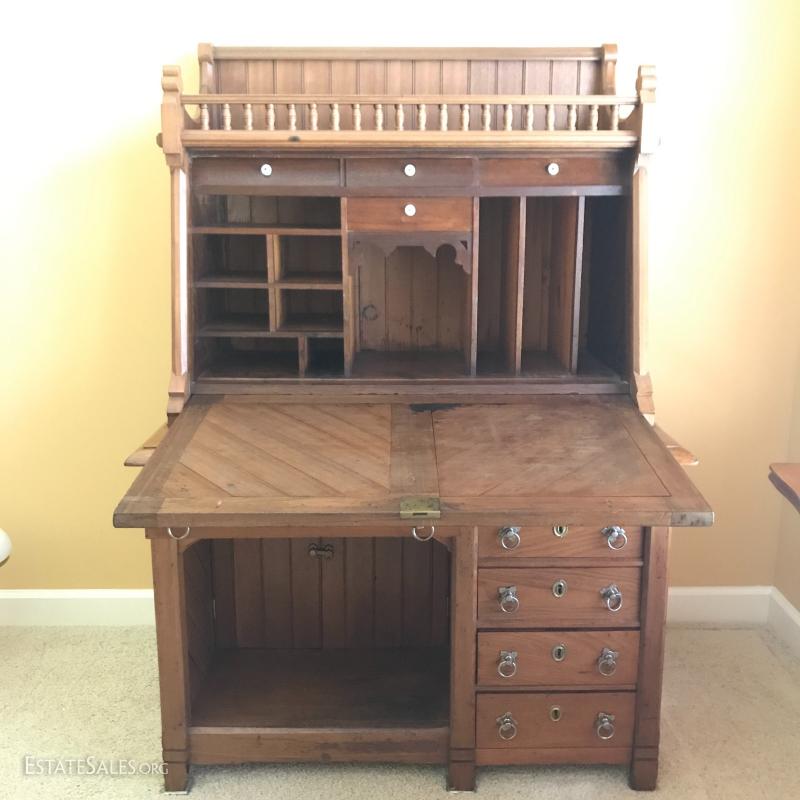 Antique walnut desk with gallant, c. approx 1869 (date provided by current owner). Desk front folds out and it has milk glass knobs and brass hardware. 39.5" l x 25.5"w x 57" h. It's 36"w when front is down.