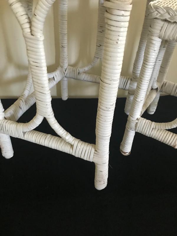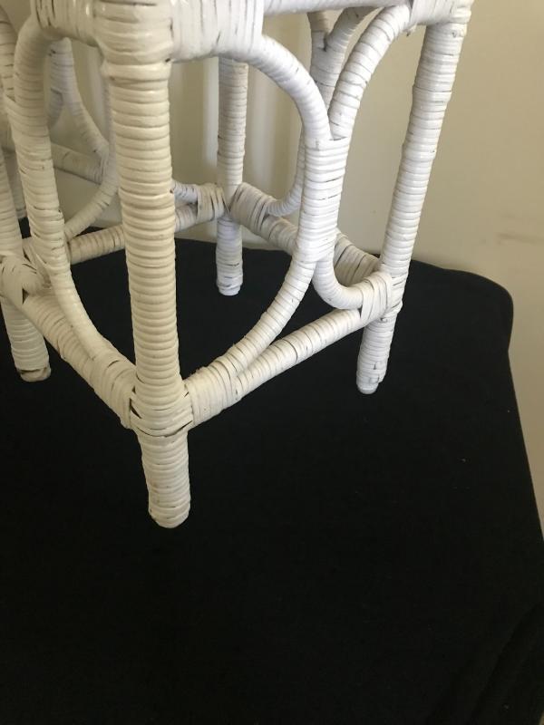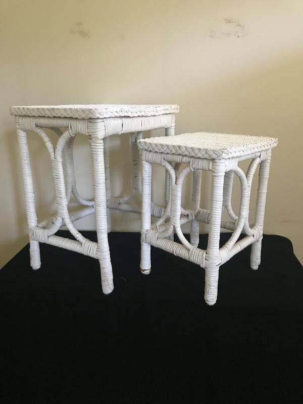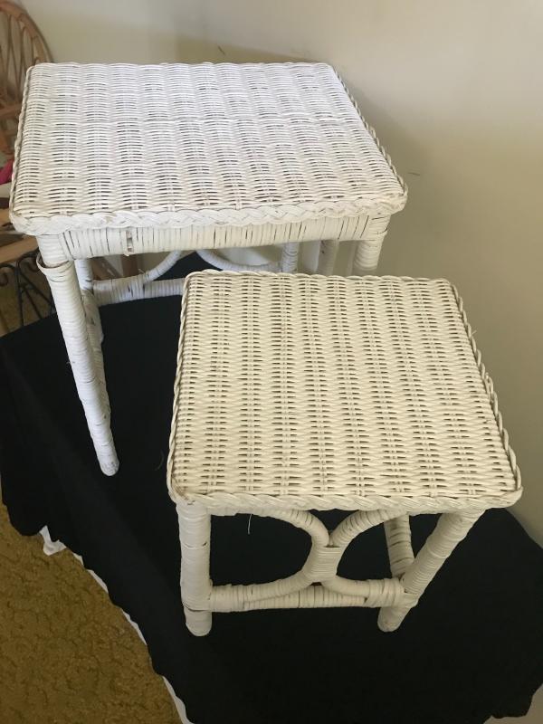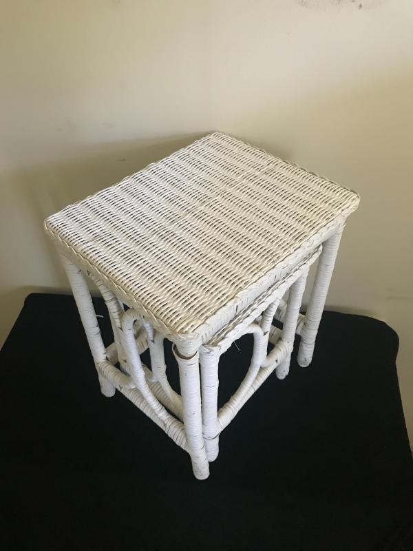 Two small white nesting tables in good condition. One small unraveling spot (see pix) on larger one which measures 16” x13” x19.5”. Local pick up only.