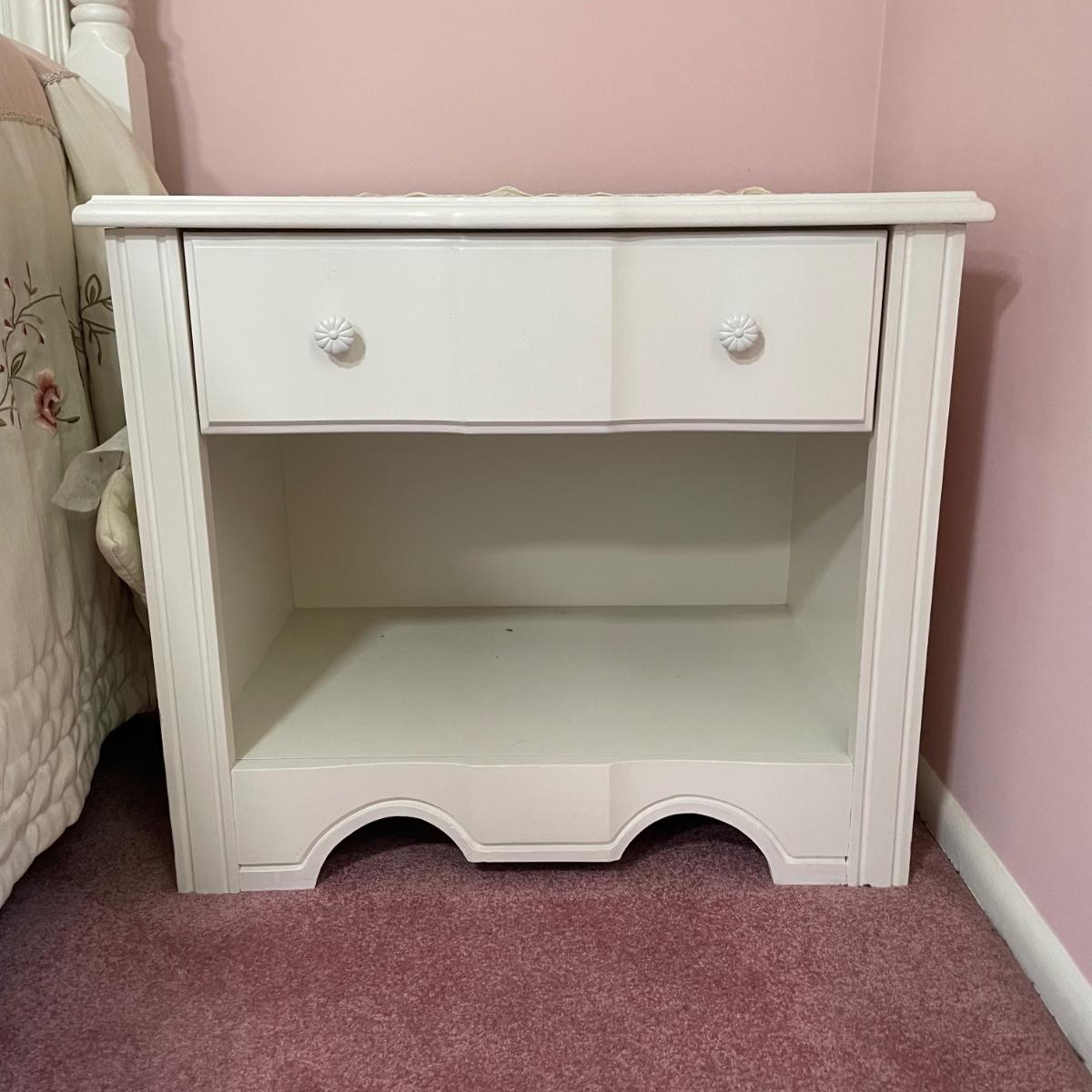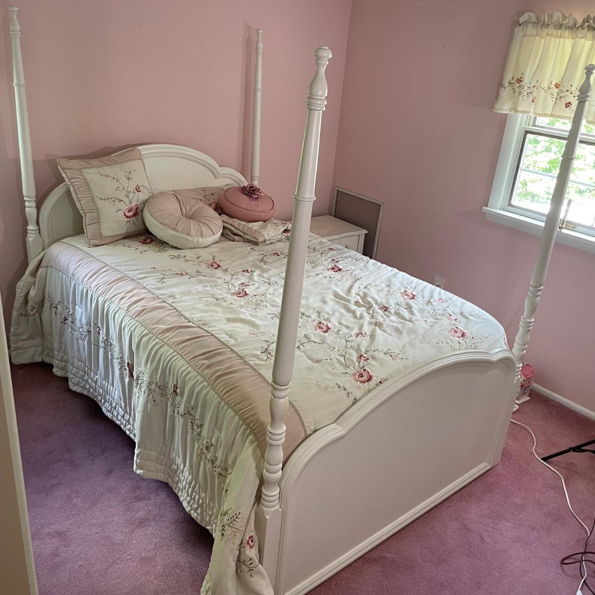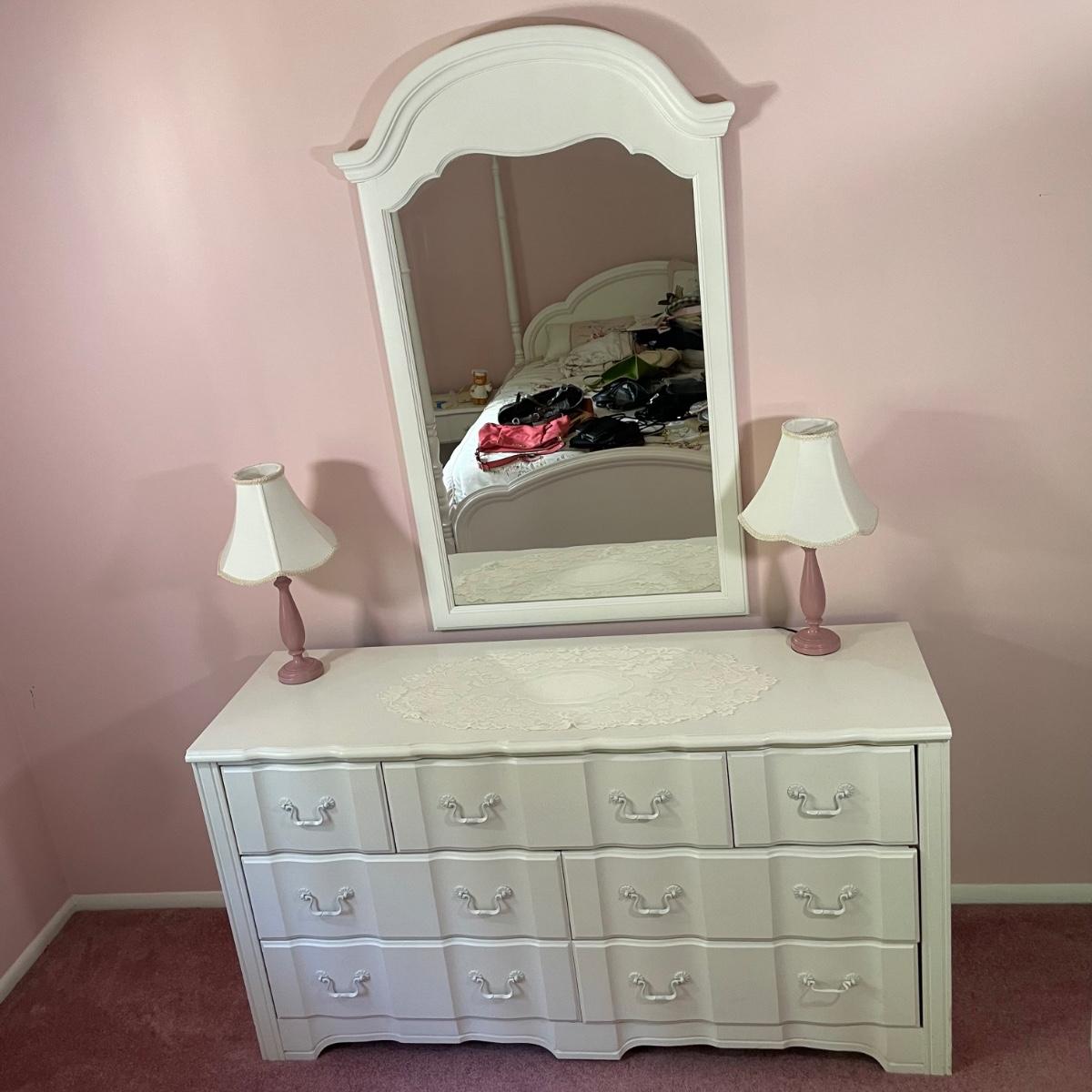 Night stand 22.5x16x22, bed 36x80.5x69.5, dresser 56x18x30, mirror 31x48.5 - Please see all pictures as they are the best representation of the items. The pictures show condition, measurements if taken, and what is included in the lot. Due to the large amount that we photograph and the time frame, we are not always able to take measurements. All items unless noted, are pre-owned and have been used. If you purchased furniture, you must bring help. We do not allow one person to carry large furniture out on their own. Bring help, tools and a truck for the safety of our client’s homes, and your personal safety. Any damages that result to the property including walls, and floors due to moving of the furniture will be charged to the buyer. Company policy. Thank you.