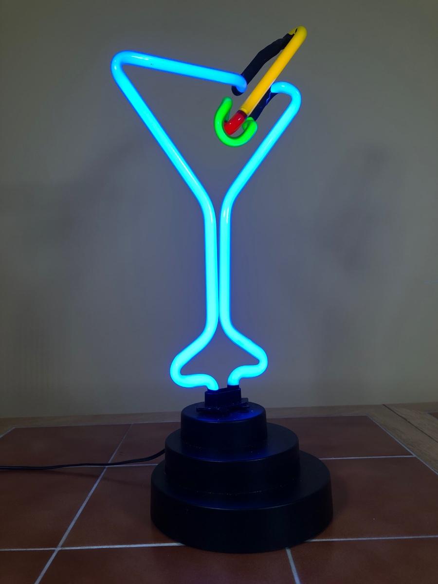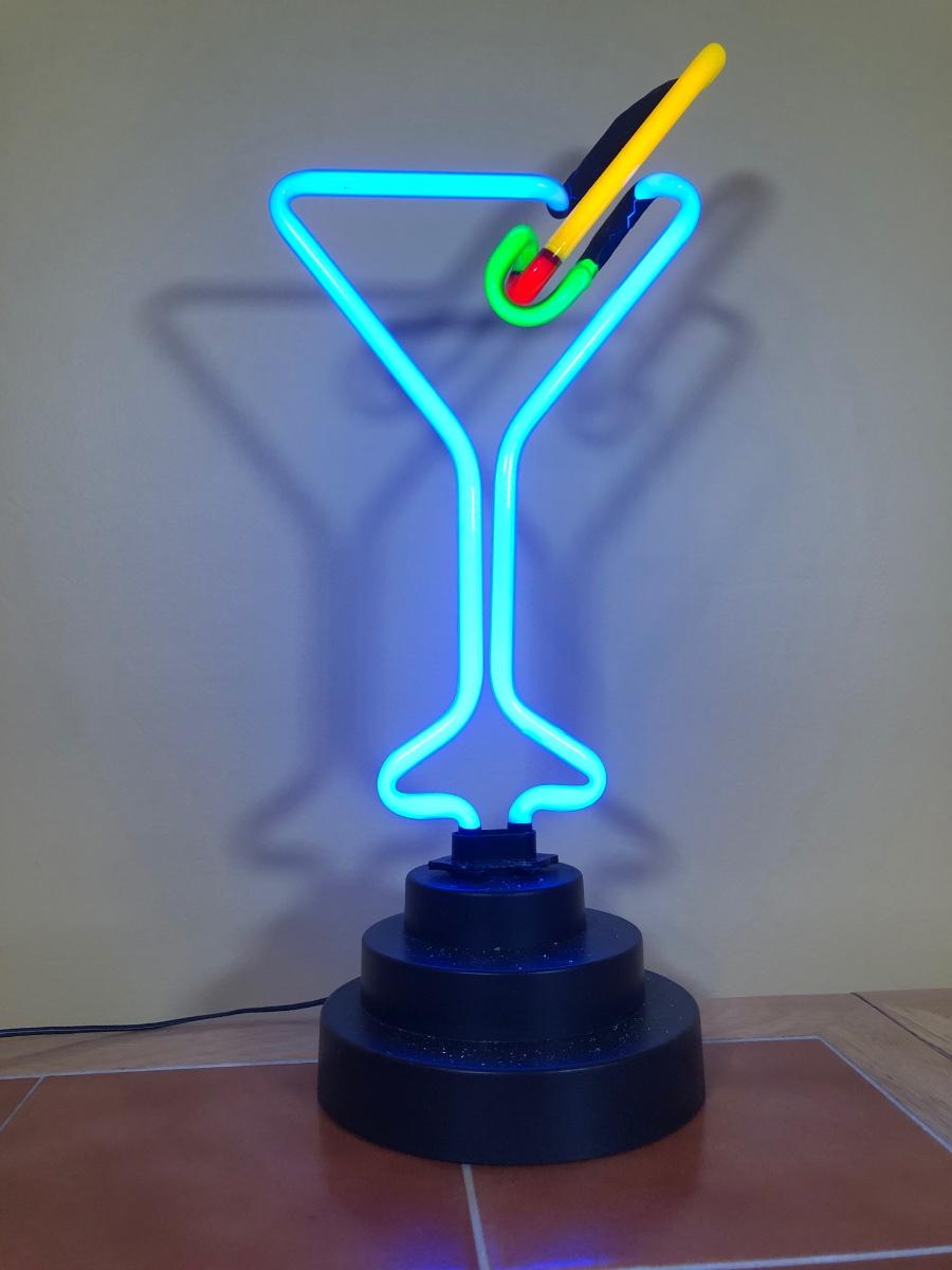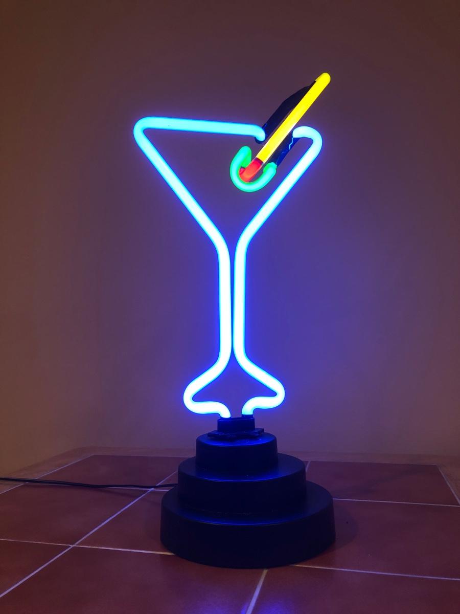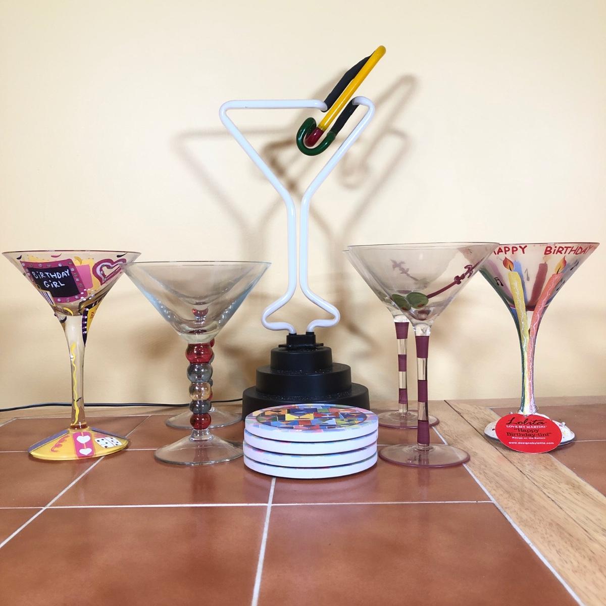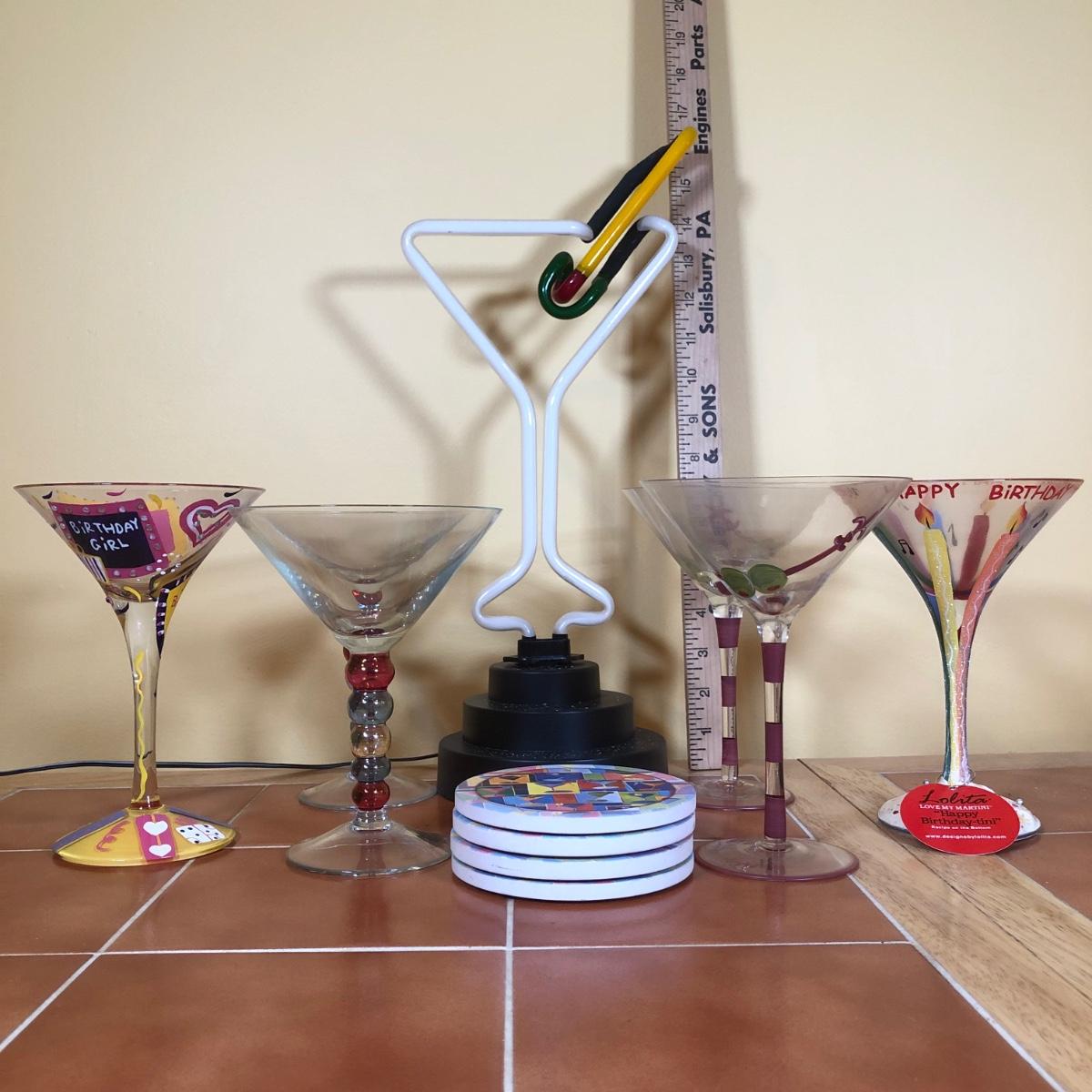 LOT 83B: Advantage Industries Neon Martini Sign Model AD-599 w/ Lolita Birthday Martini Glasses, Colorful Pearl Stem Glasses, Handpainted Glasses & Cork Back Coasters