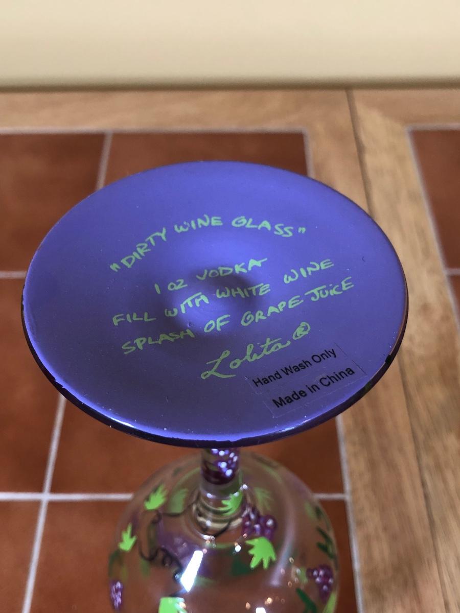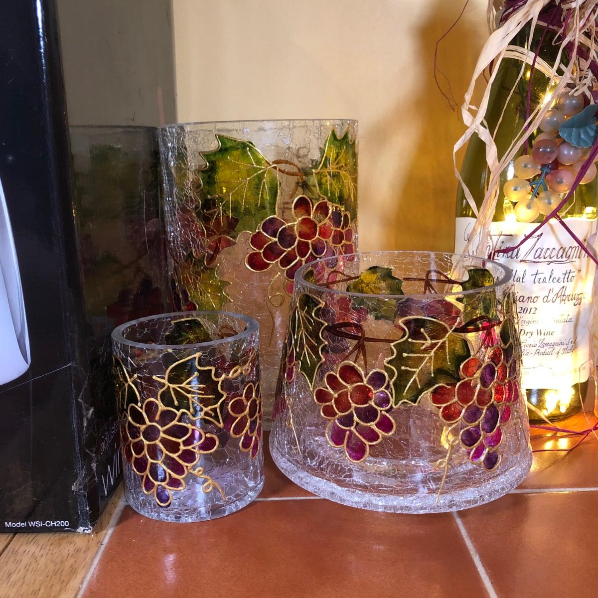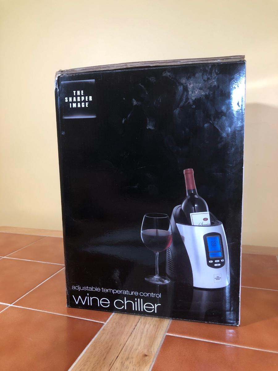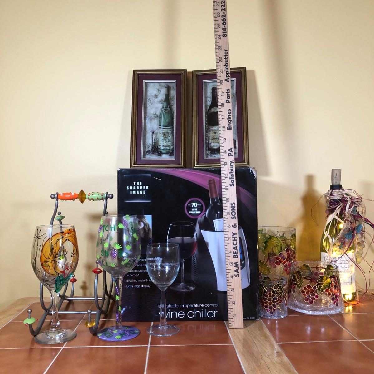 LOT 86B: NIB The Sharper Image Wine Chiller, Lolita "Dirty Wine Glass," Kate McRostie 3D Shadowbox Decor, Hand Painted Wine Queen Glass, Grape Motif Crackle Glass, Lit Decor Bottle & Funky Wine Rack