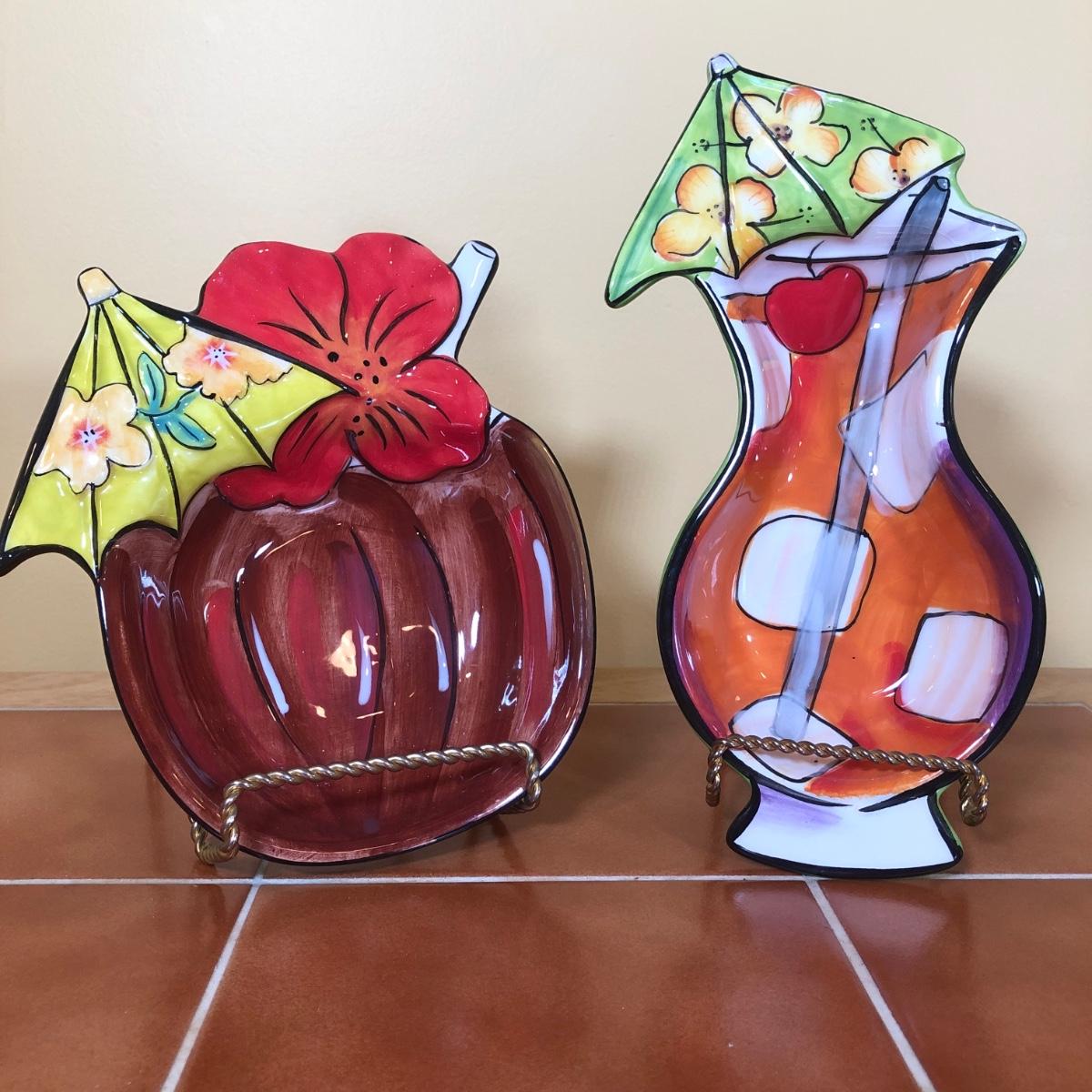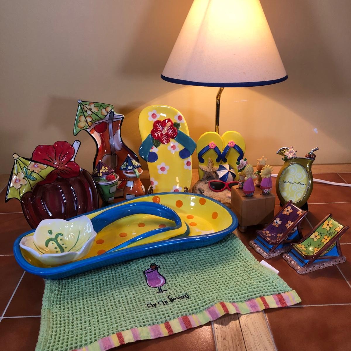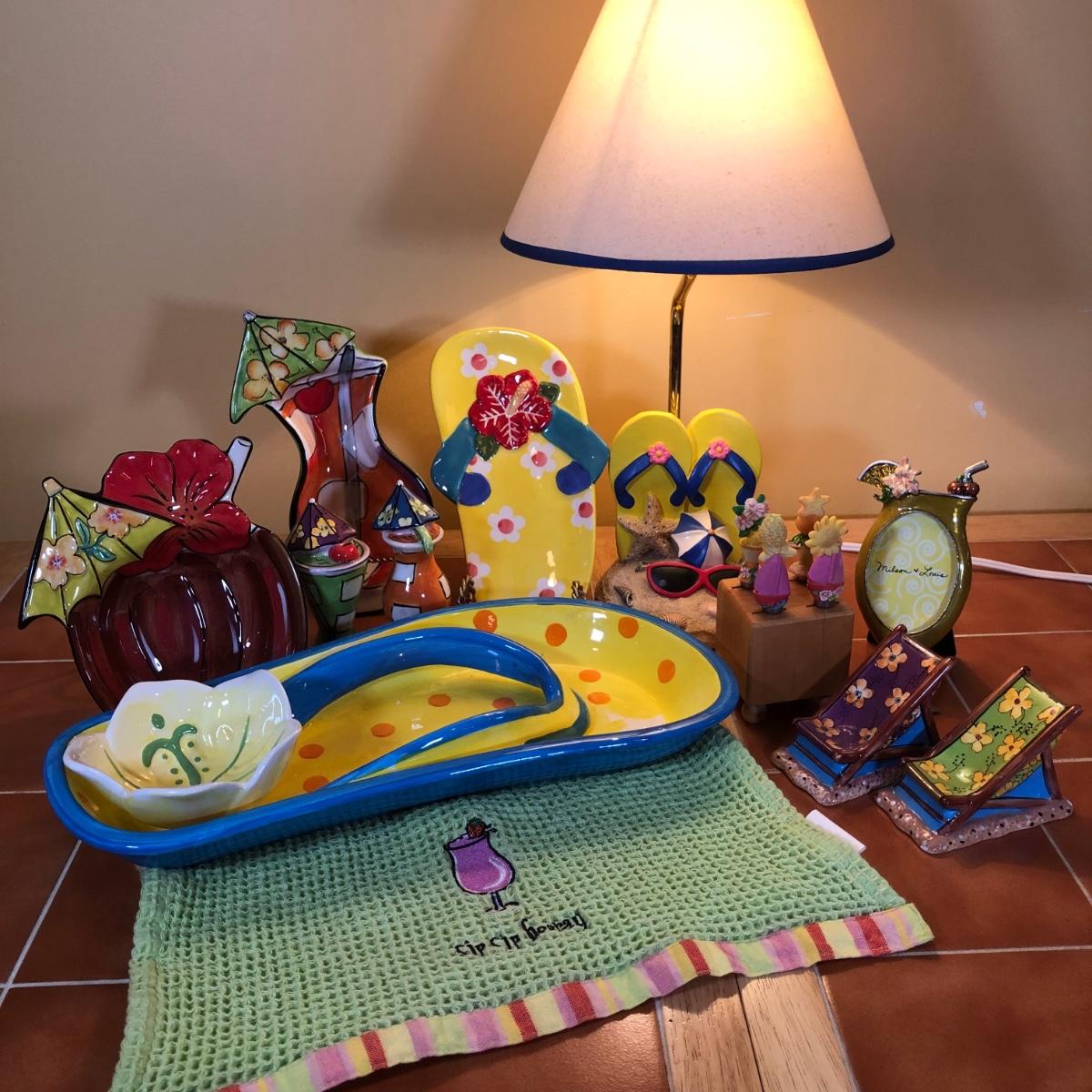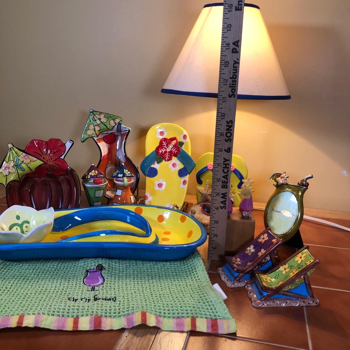 LOT 88B: Dennis East International Flip Flop Lamp & Serving Tray w/ Clay Art S&P Shakers, Cocktail Themed Dishes & More