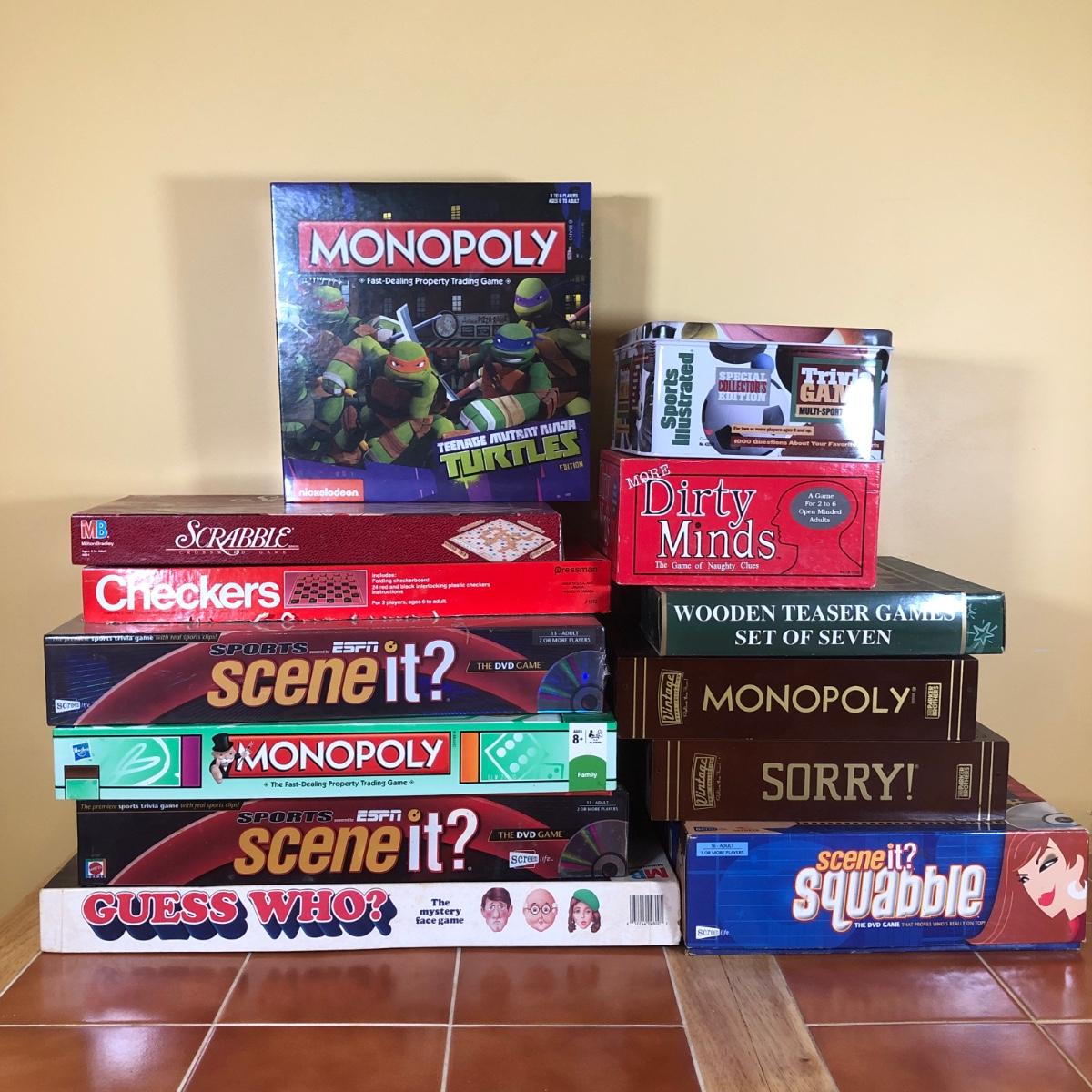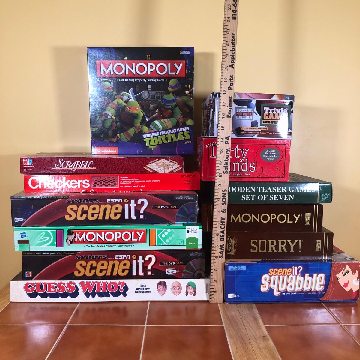LOT 91B: Large Collection of Board Games incl. NIP Teenage Mutant Ninja Turtles Monopoly & ESPN Sports Scene It? DVD Game