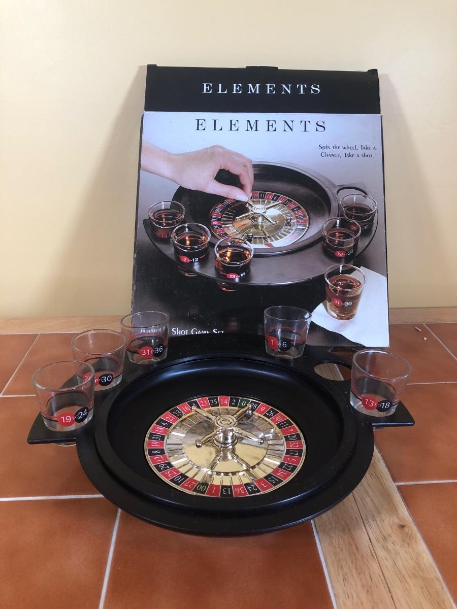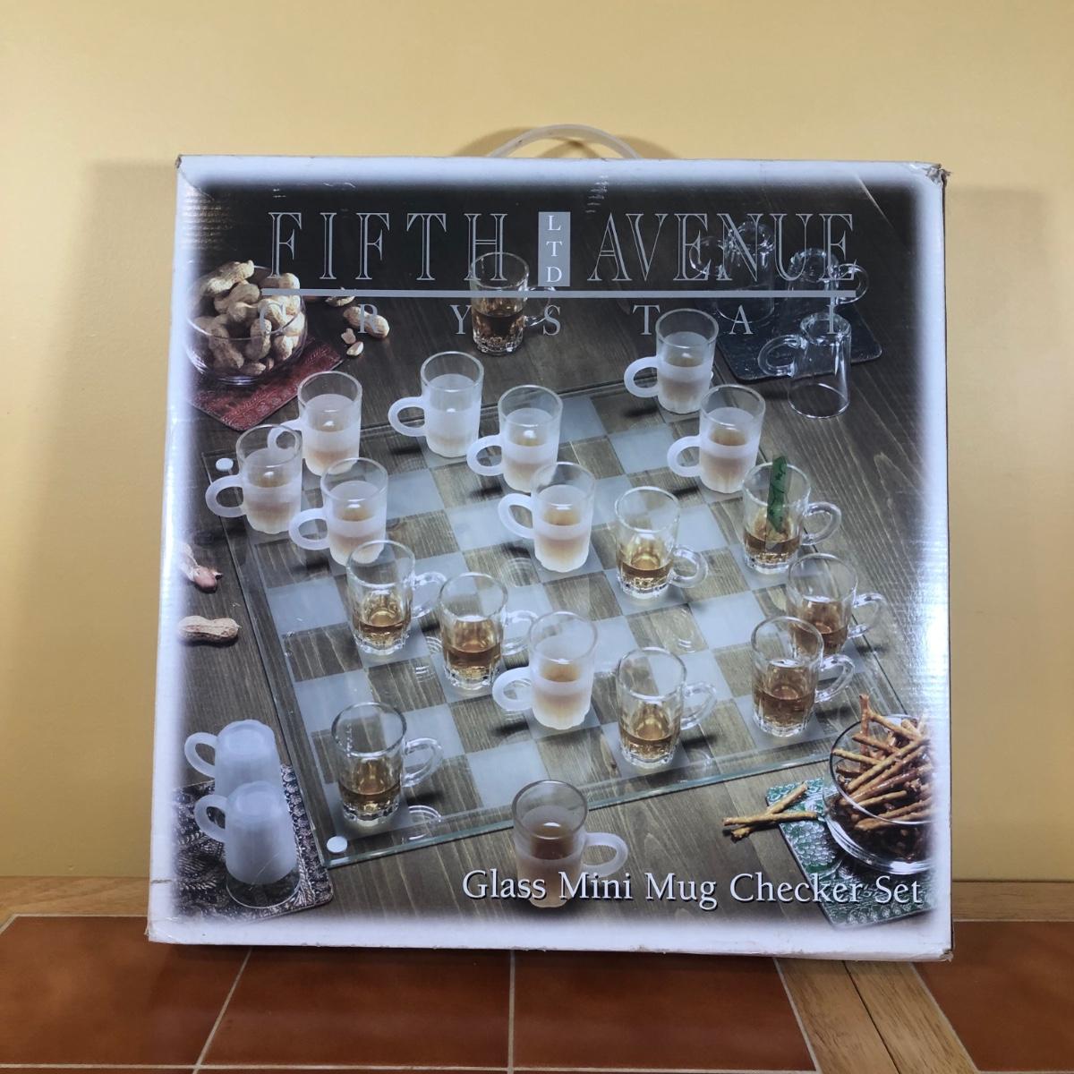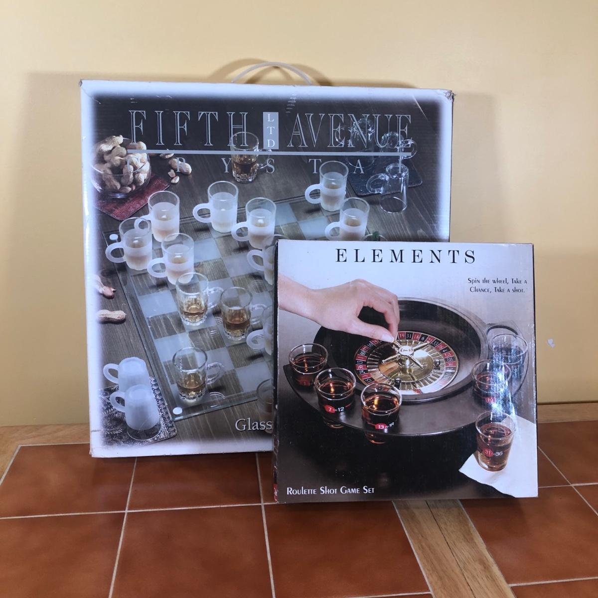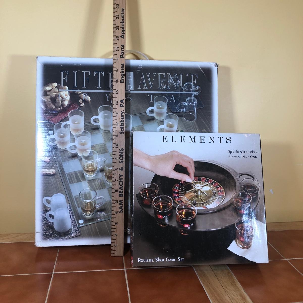 LOT 99B: Fifth Avenue Glass Mini Mug Checker Set w/ Box & Elements Roulette Shot Glass Set w/ Box (Missing 1 Glass)