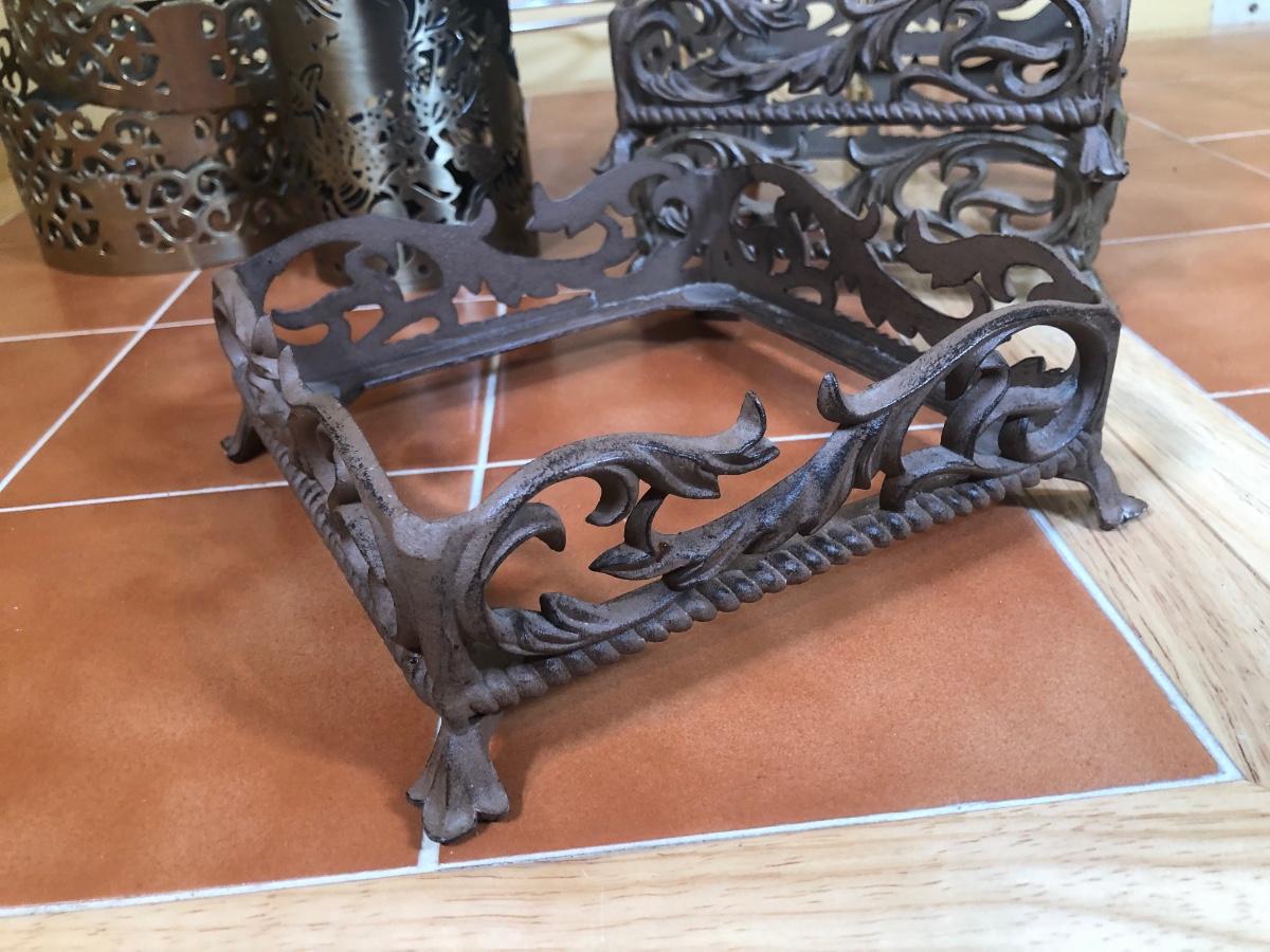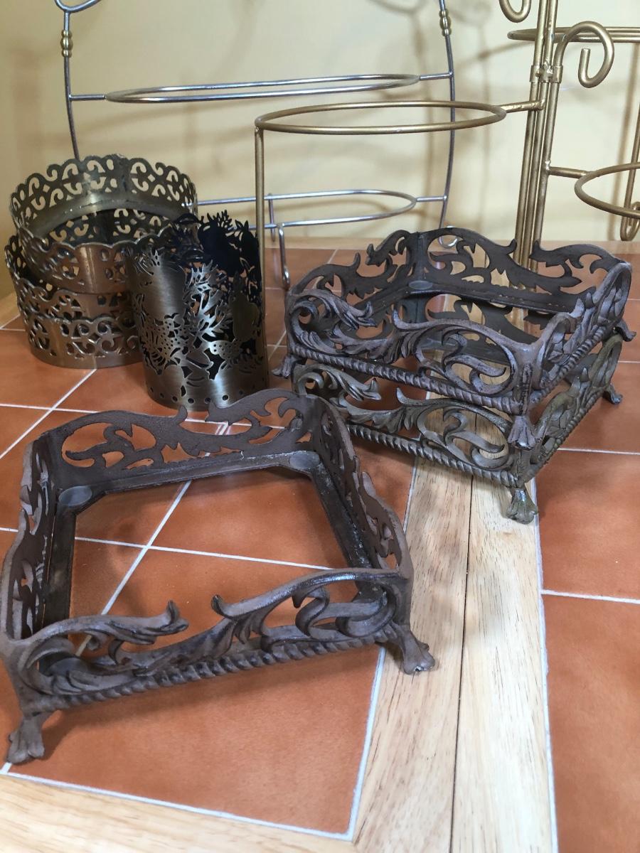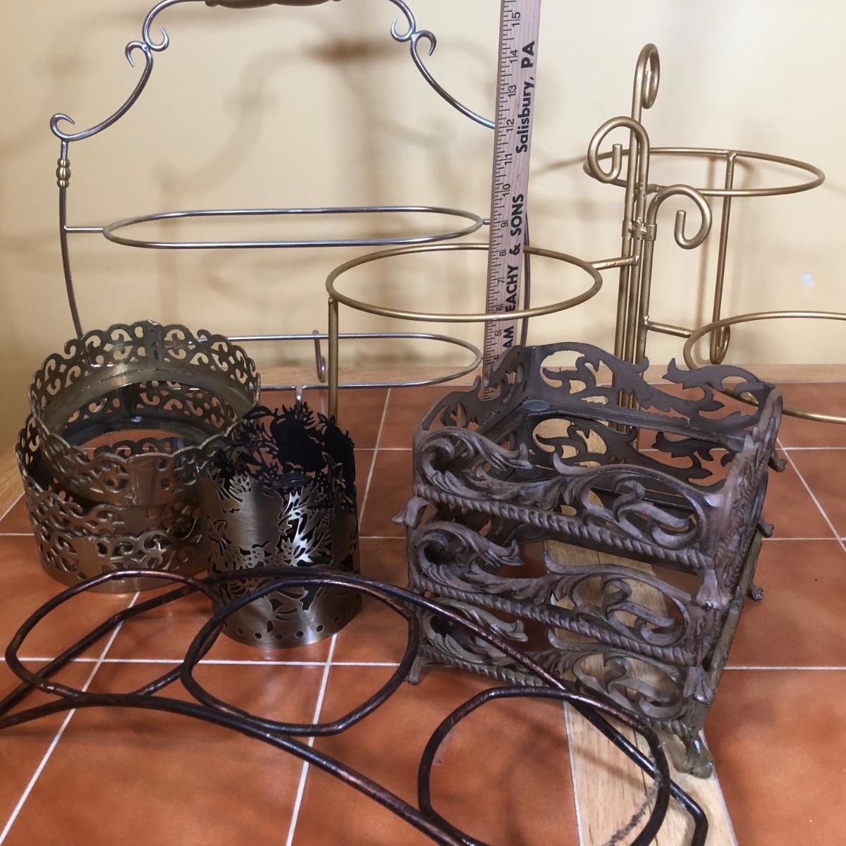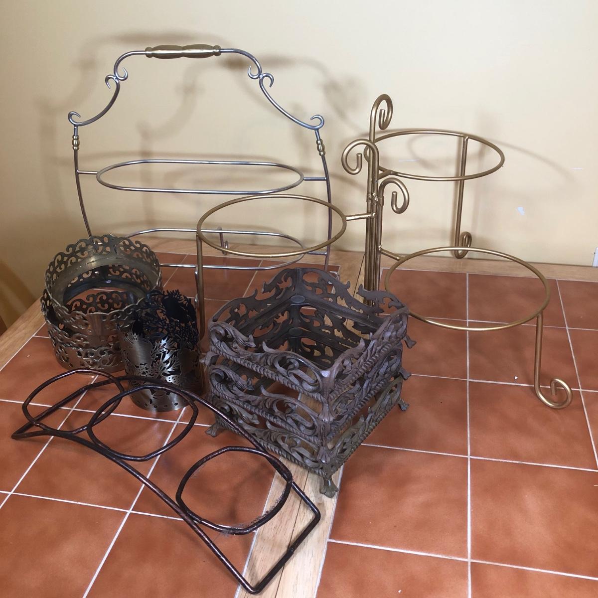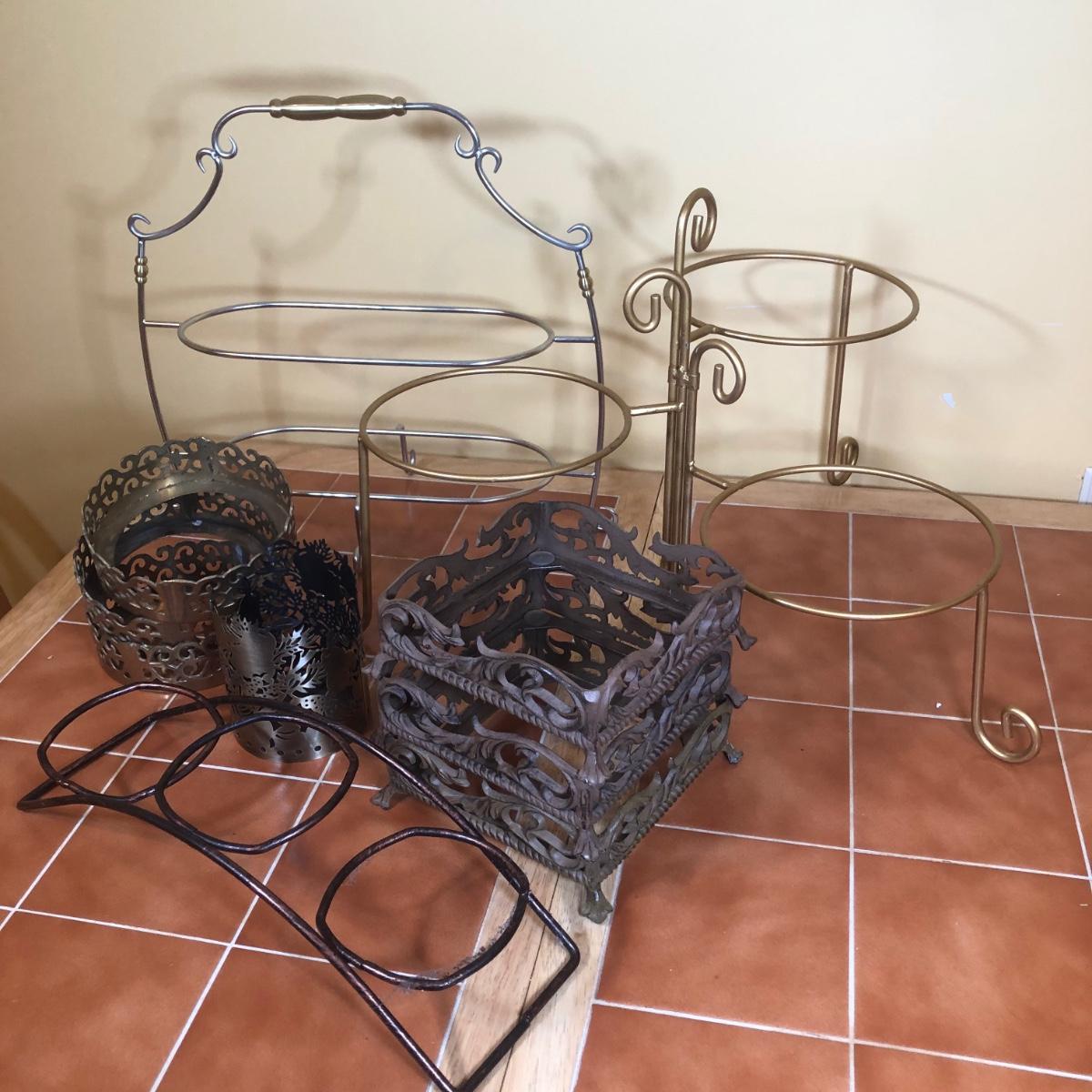 LOT 105B: Vintage Brass Filigree Pot Planters (3), Cast Iron Bases (3), Plate Racks & More