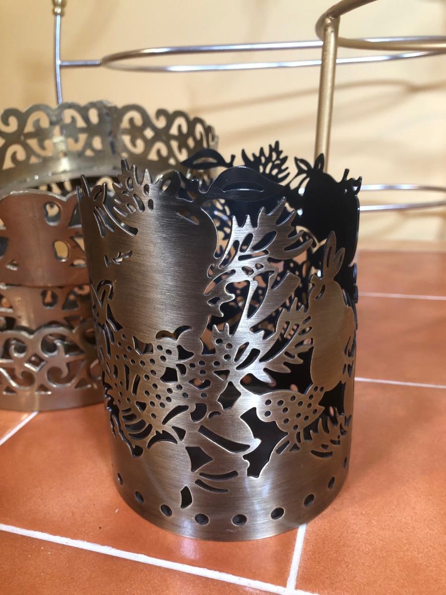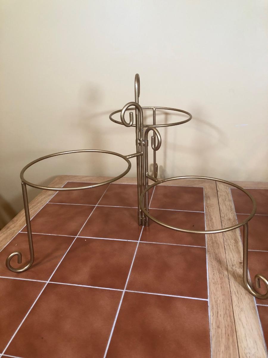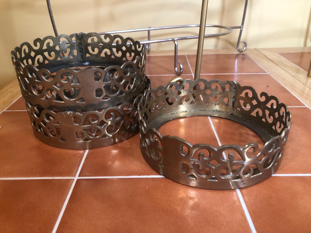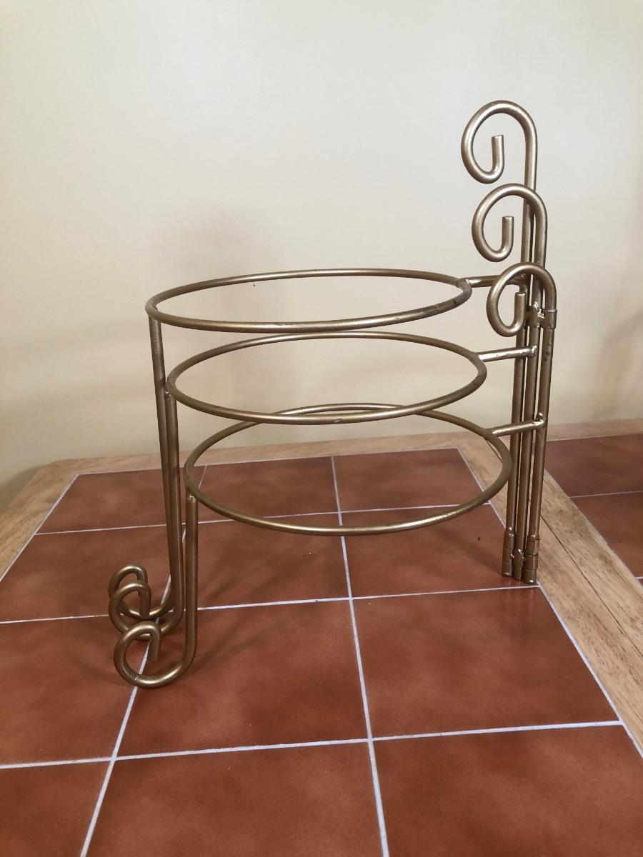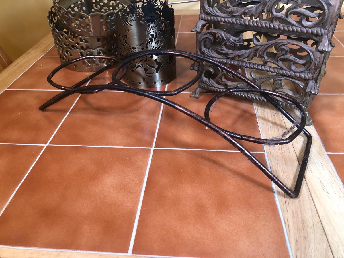 LOT 105B: Vintage Brass Filigree Pot Planters (3), Cast Iron Bases (3), Plate Racks & More