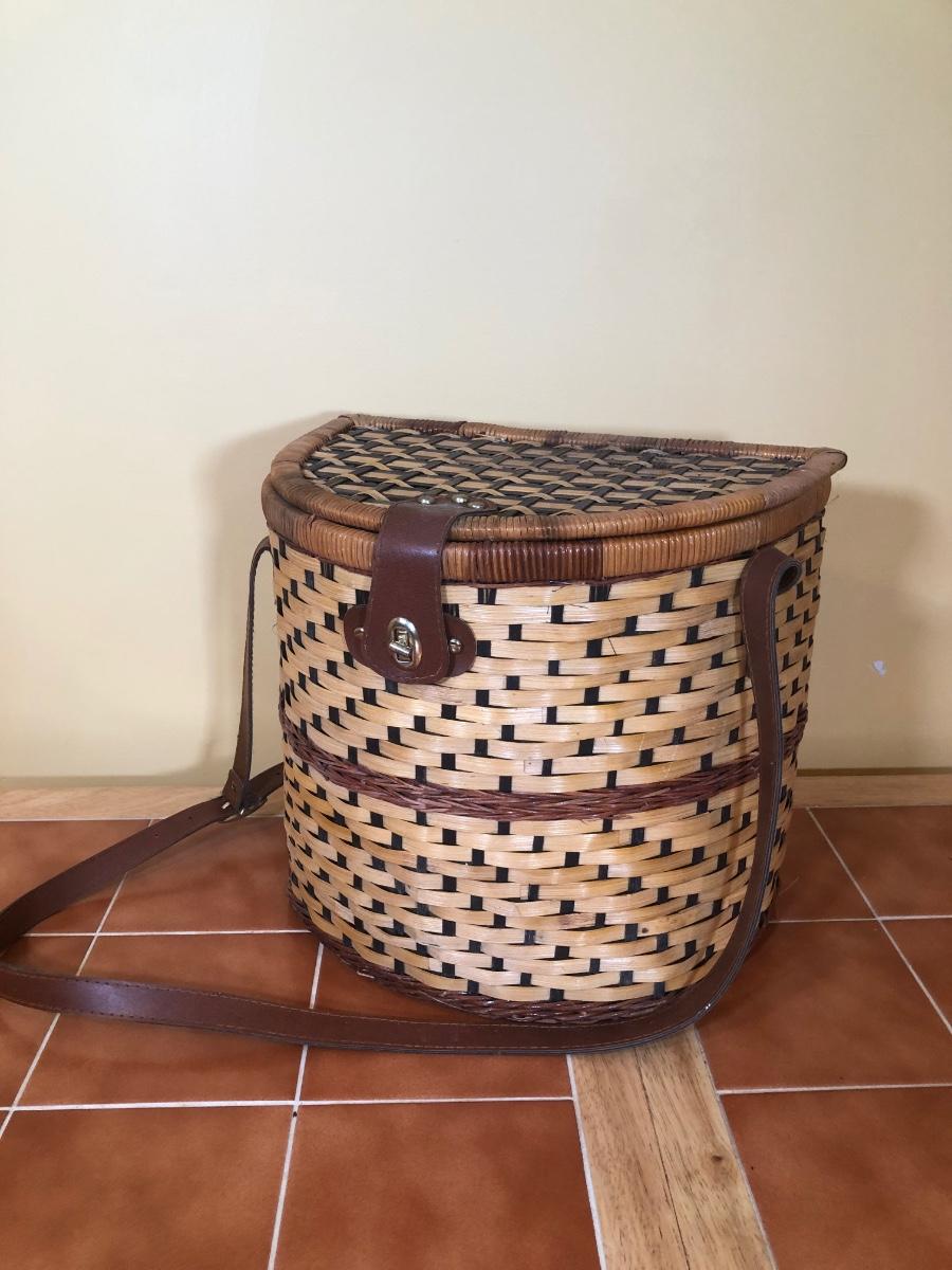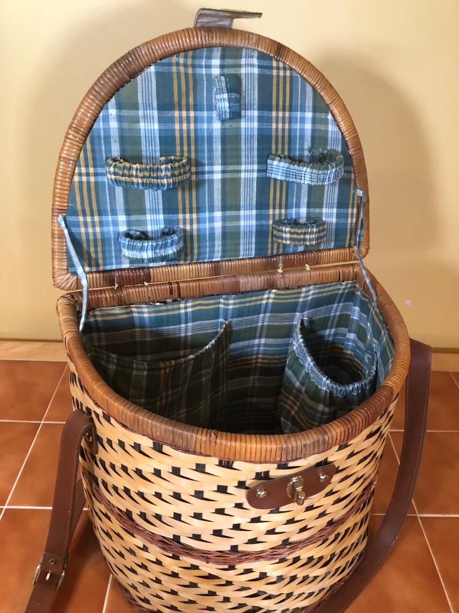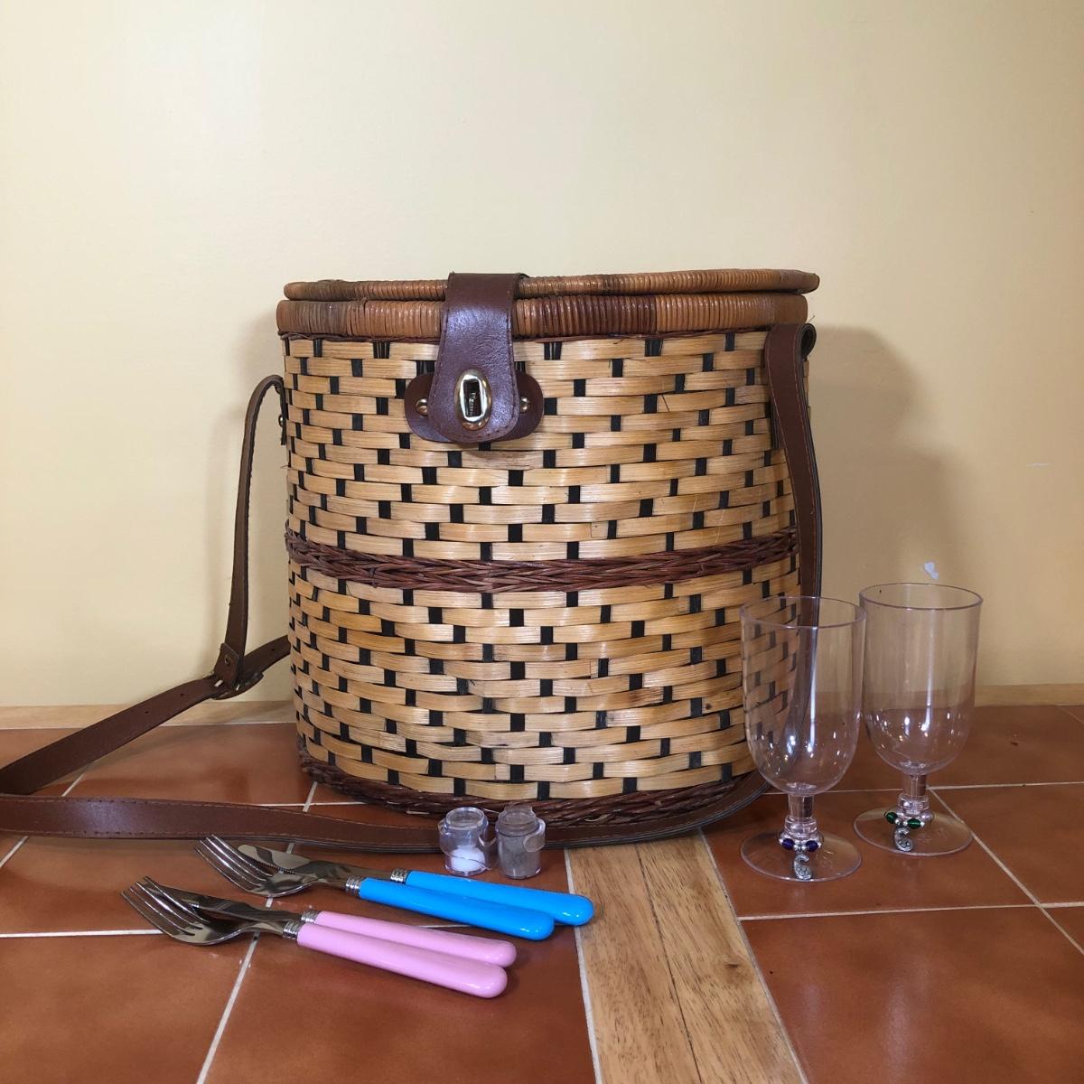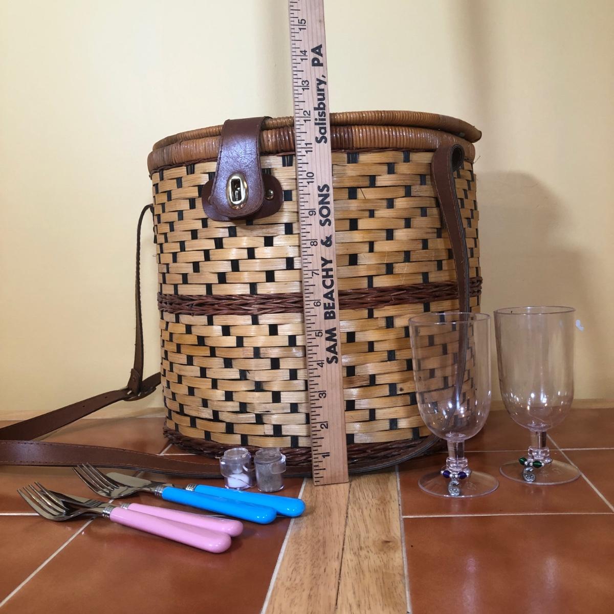 LOT 125B: Vintage Wicker Woven Picnic Basket w/ Shoulder Strap & Accessories