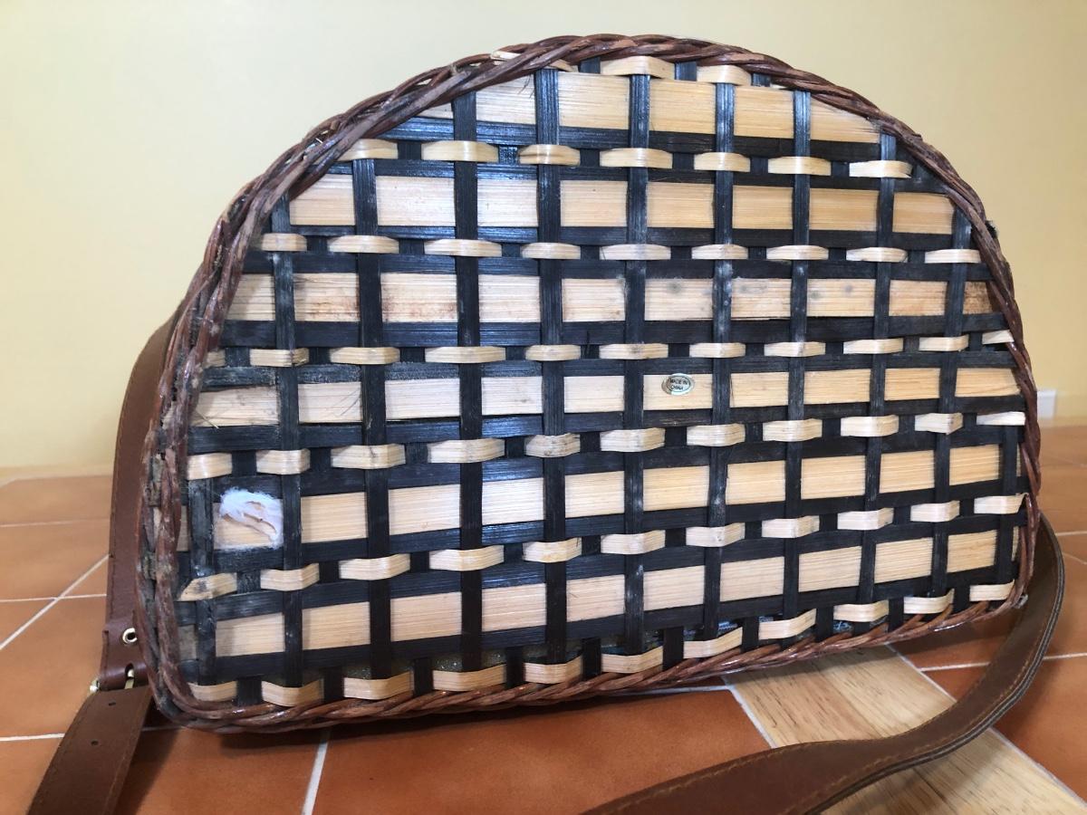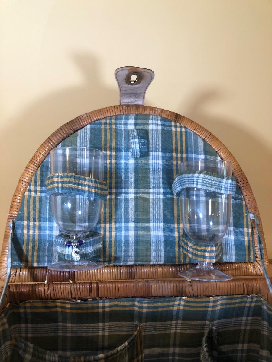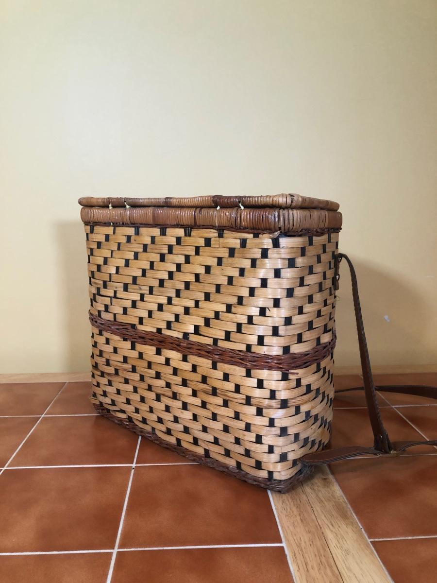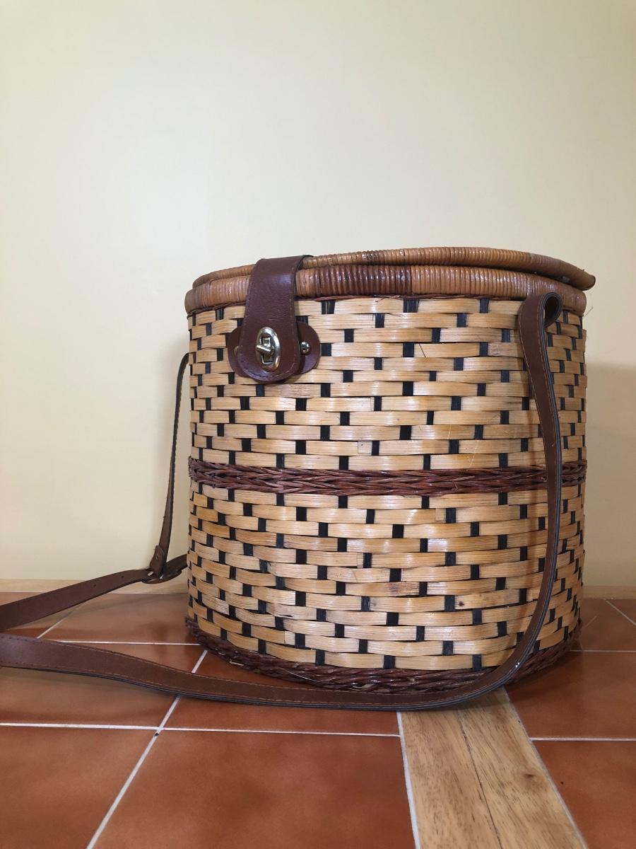 LOT 125B: Vintage Wicker Woven Picnic Basket w/ Shoulder Strap & Accessories