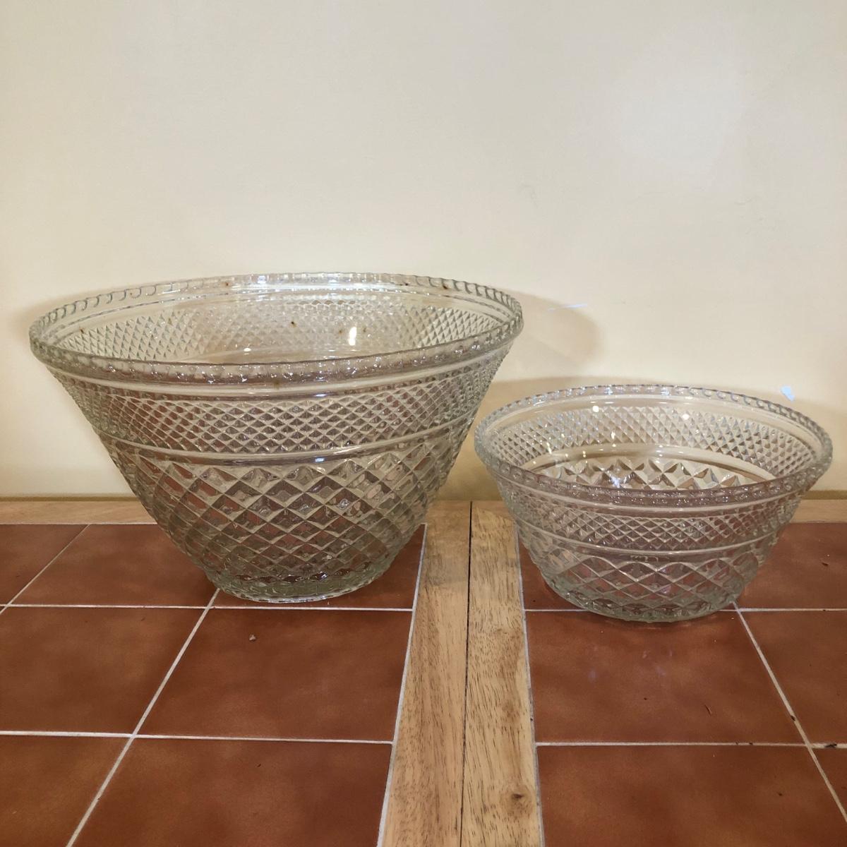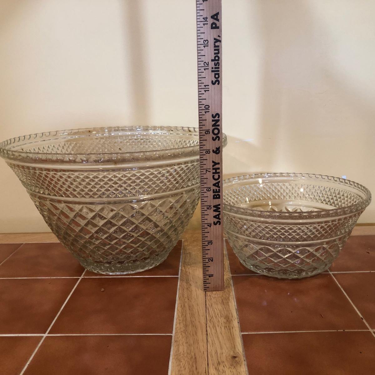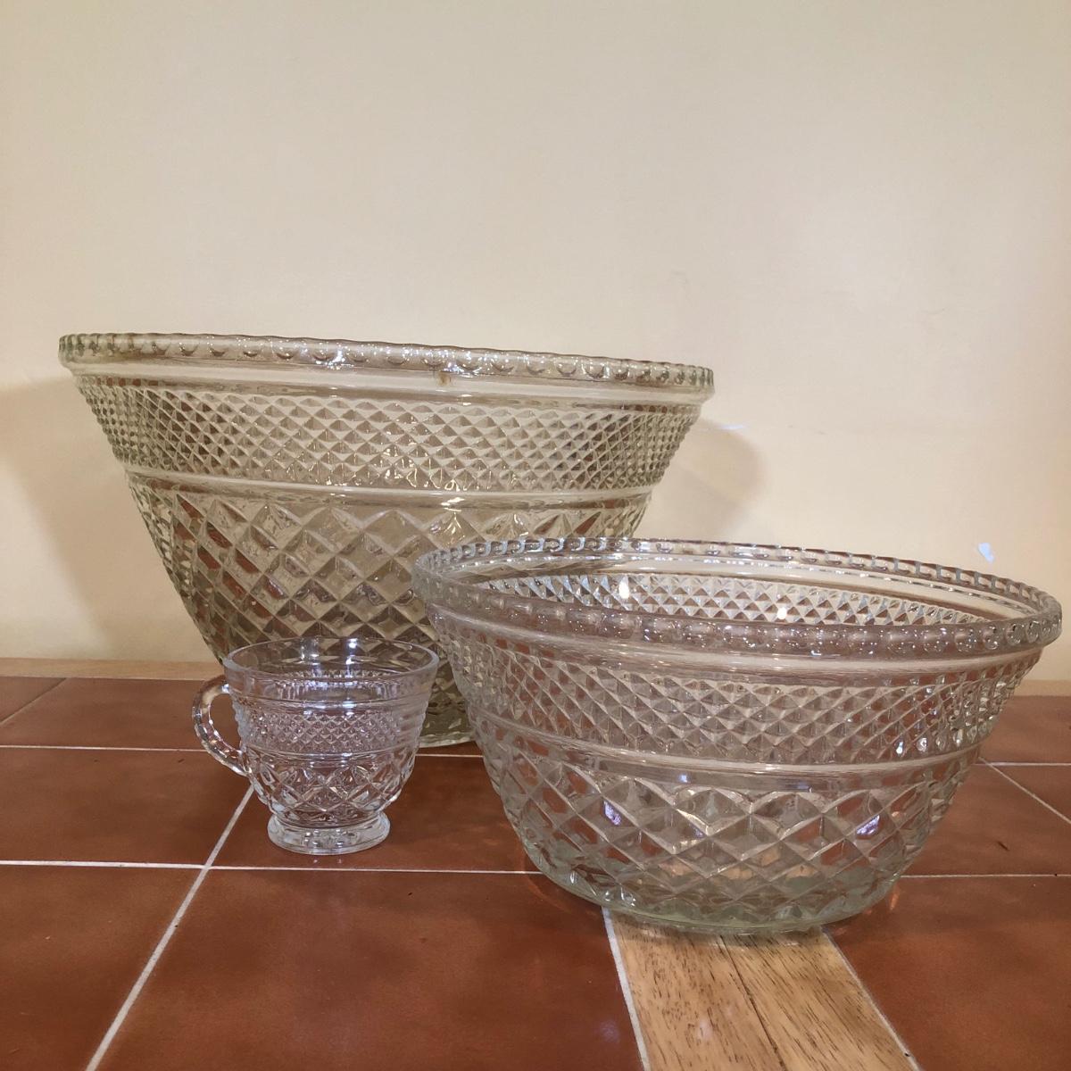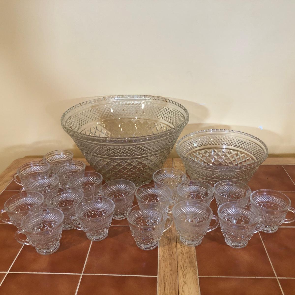 LOT 128B: Large & Medium Matching Glass Punch Bowls w/ 18 Cups