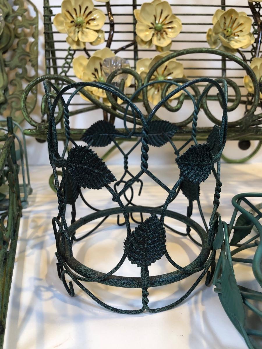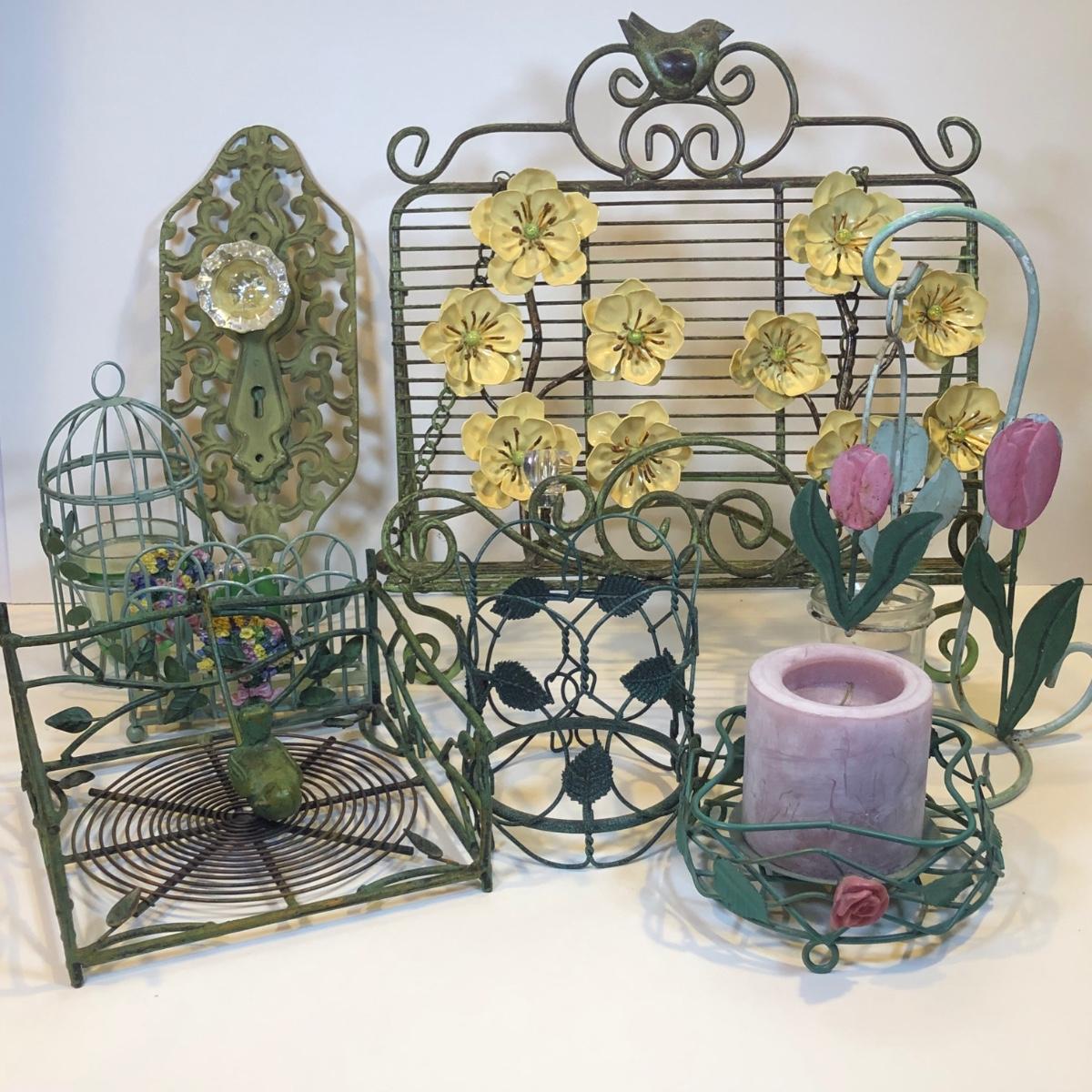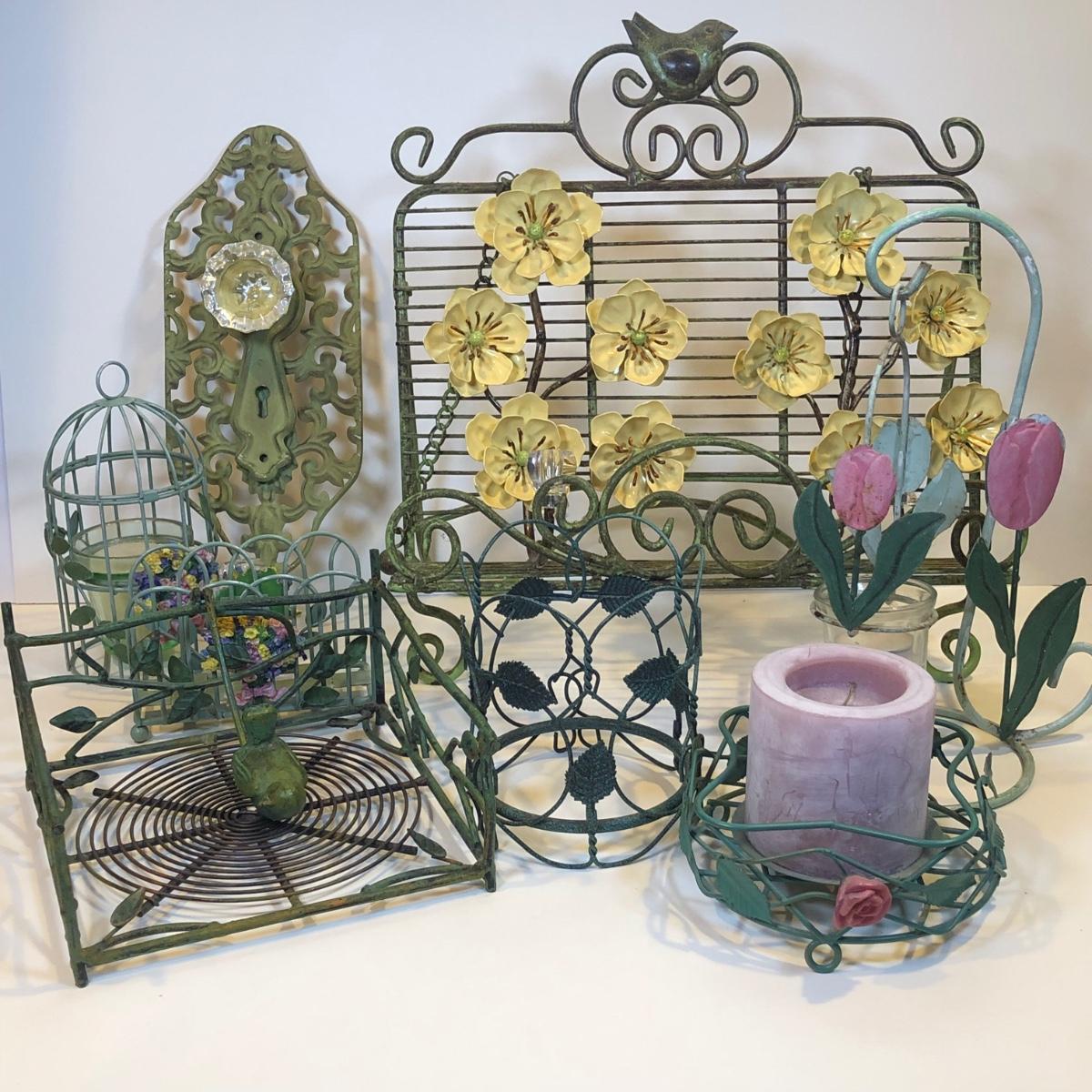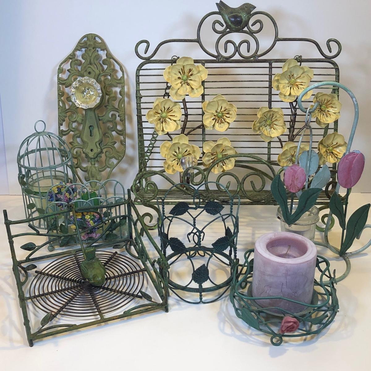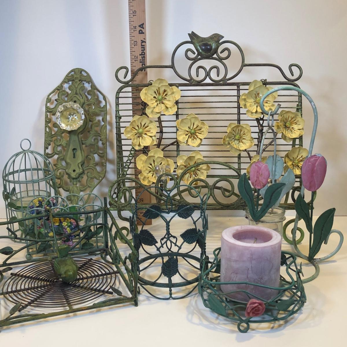 LOT 153K: Green Metal Home Decor - Recipe Stand, Napkin Holder, Wall Decor & Candle Holders