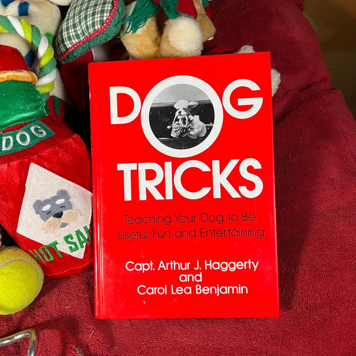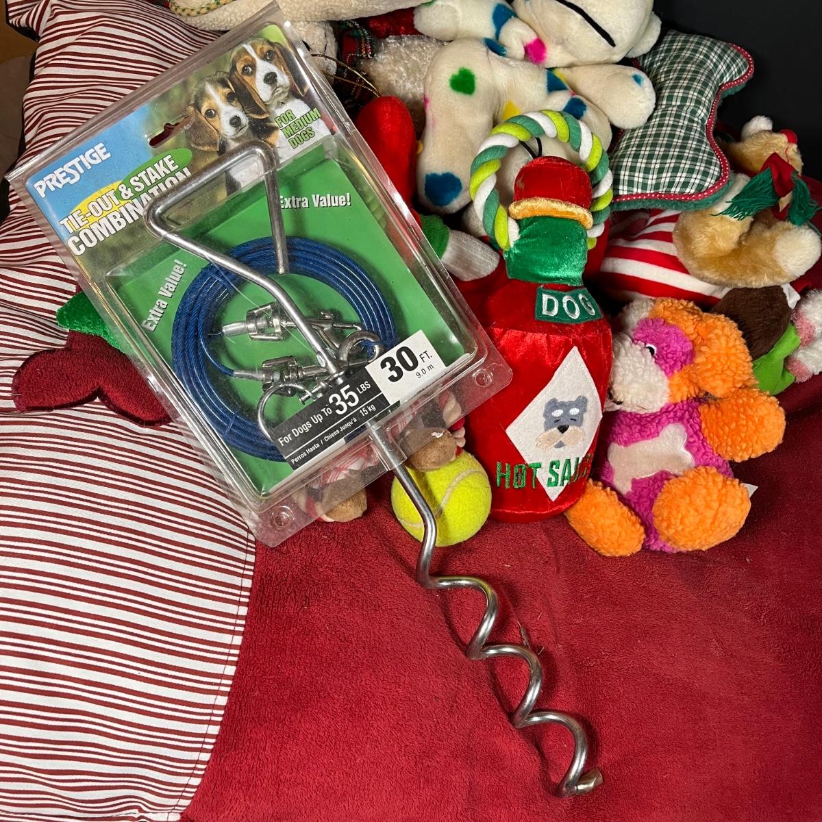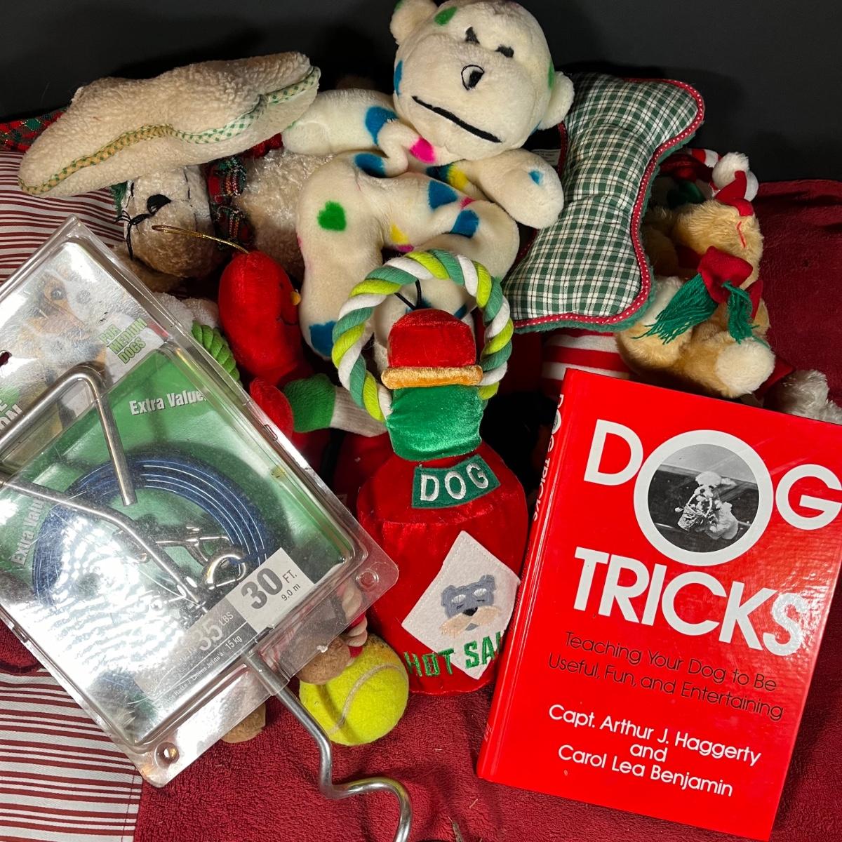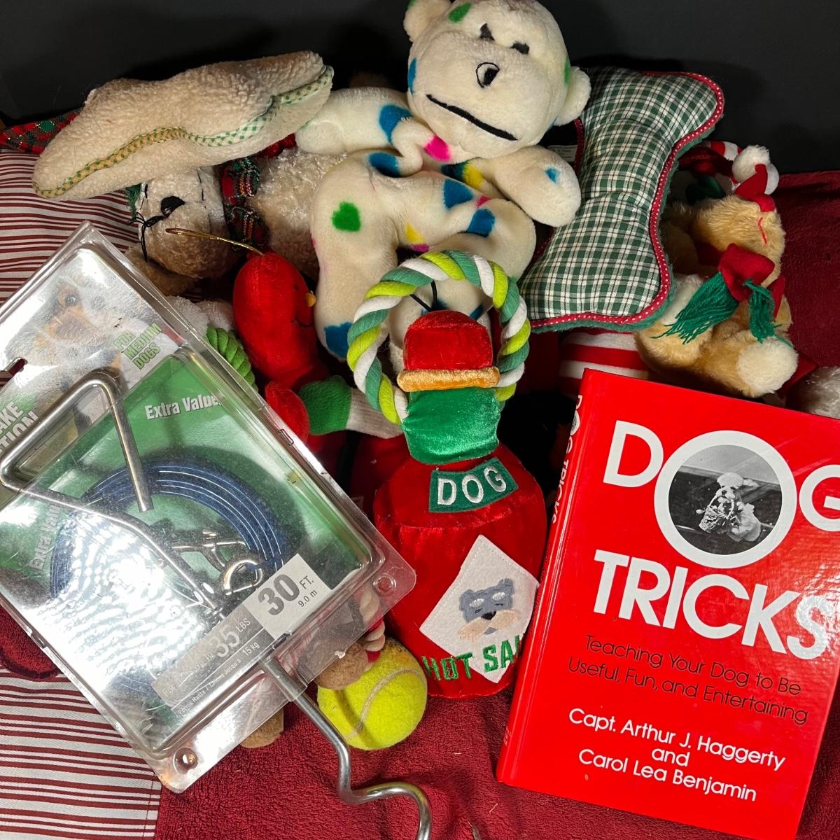 LOT 166G: Pet Supplies - Dog Training Book and Cable Tie-Out with Pet Bed and Toys